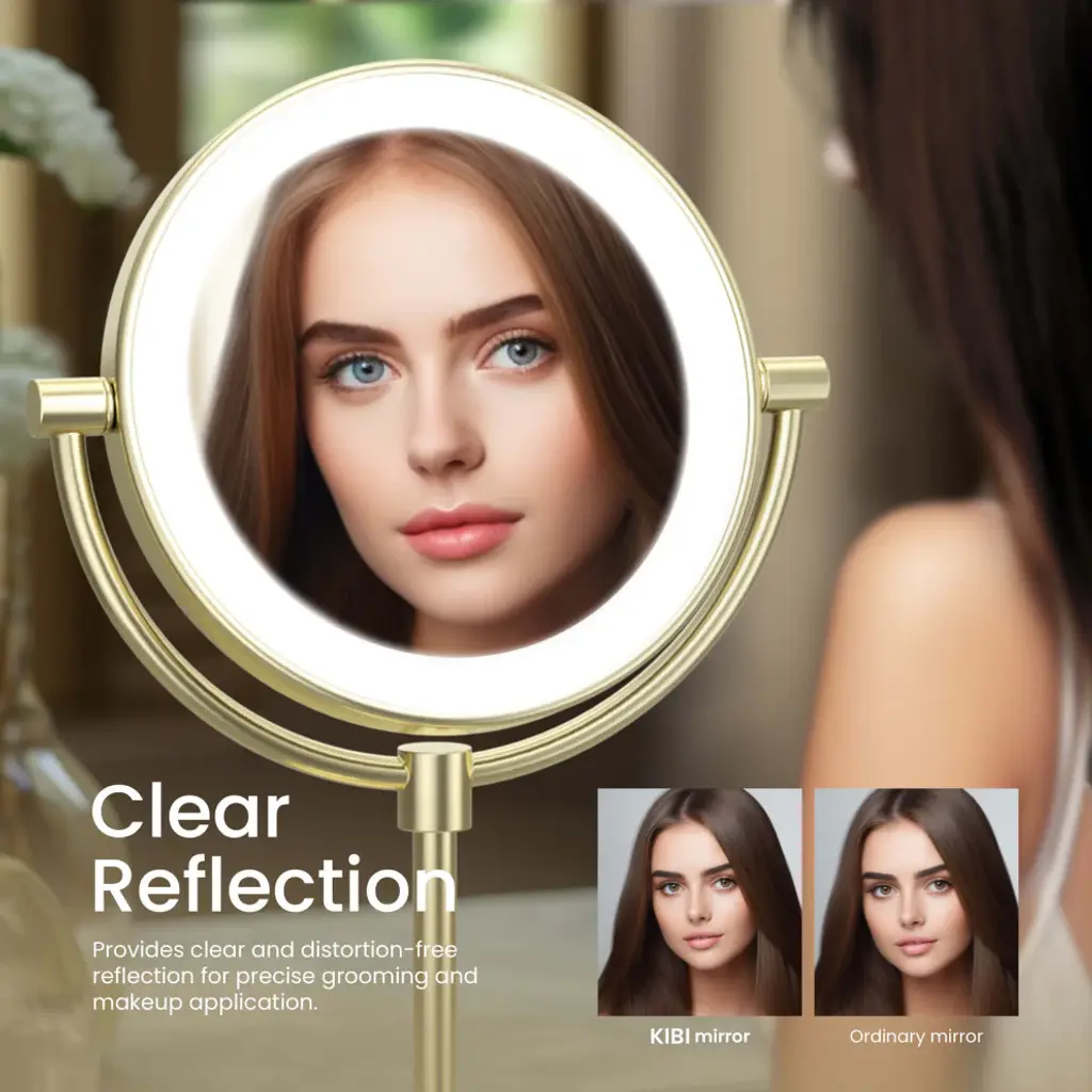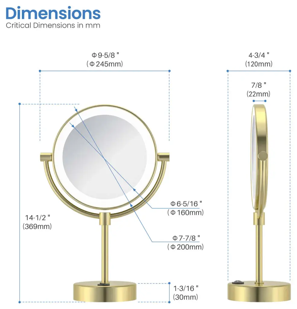 Introducing our Circular Free Standing Makeup Mirror with Dual Magnification and Battery-Powered LED Lights a perfect blend of functionality and convenience for your beauty routine. This mirror is designed to provide you with precision, versatility, and optimal illumination, all in one sleek package. Dual Magnification: Featuring dual-sided mirrors, this free-standing makeup mirror offers a 5 times magnification on one side for detailed work such as perfecting eyeliner and tweezing eyebrows, while the other side provides a regular reflection for overall makeup application and grooming tasks. Battery-Powered LED Lights: Equipped with energy-efficient LED lights powered by AAA batteries, this mirror ensures consistent and bright illumination, mimicking natural daylight. Stable Free-Standing Design: The mirror stands securely on any flat surface, thanks to its stable and sturdy base. It doesn''t require complicated installation or wiring, providing you with the freedom to move and place it wherever you need it in your home. 360-Degree Swivel: Designed with a 360-degree swivel feature, the mirror can be easily adjusted to your preferred angle, allowing you to find the perfect position for your makeup application or grooming routines. Portable and Travel-Friendly: With its battery-powered LED lights and free-standing design, this mirror is highly portable and travel-friendly. Take it with you wherever you go, ensuring you have a well-lit and magnified mirror for your beauty needs, even when you''re on the move. Sleek and Modern Appearance: Crafted with a contemporary design, this free-standing makeup mirror adds a touch of elegance to your vanity, dressing table, or bathroom countertop. Its minimalist aesthetic enhances the overall look of your space while serving as a functional and stylish accessory.
