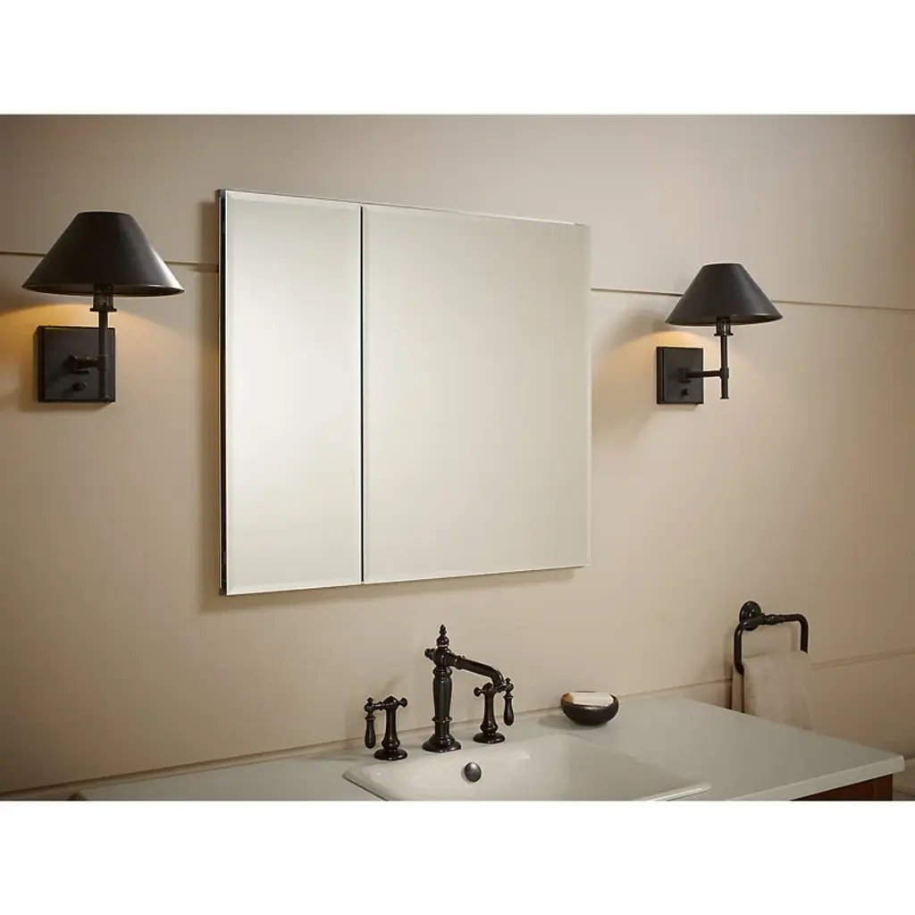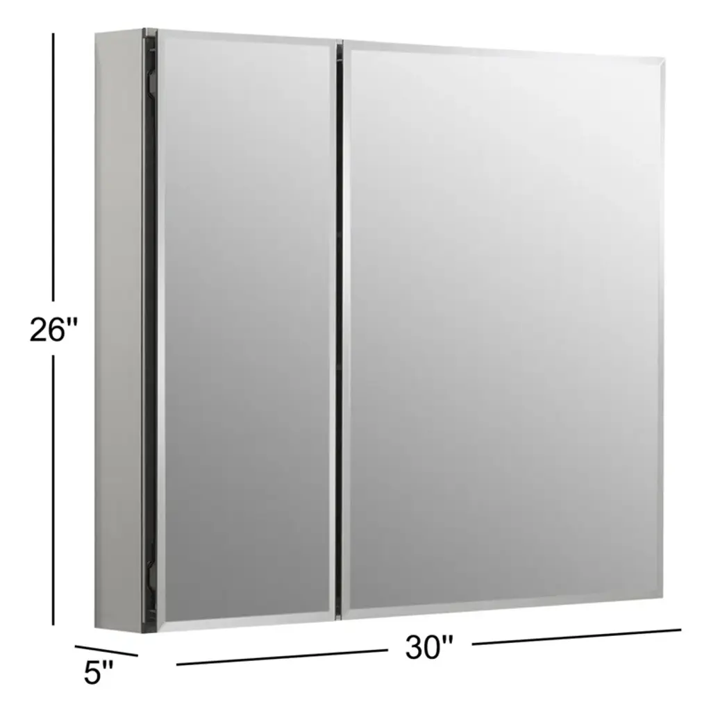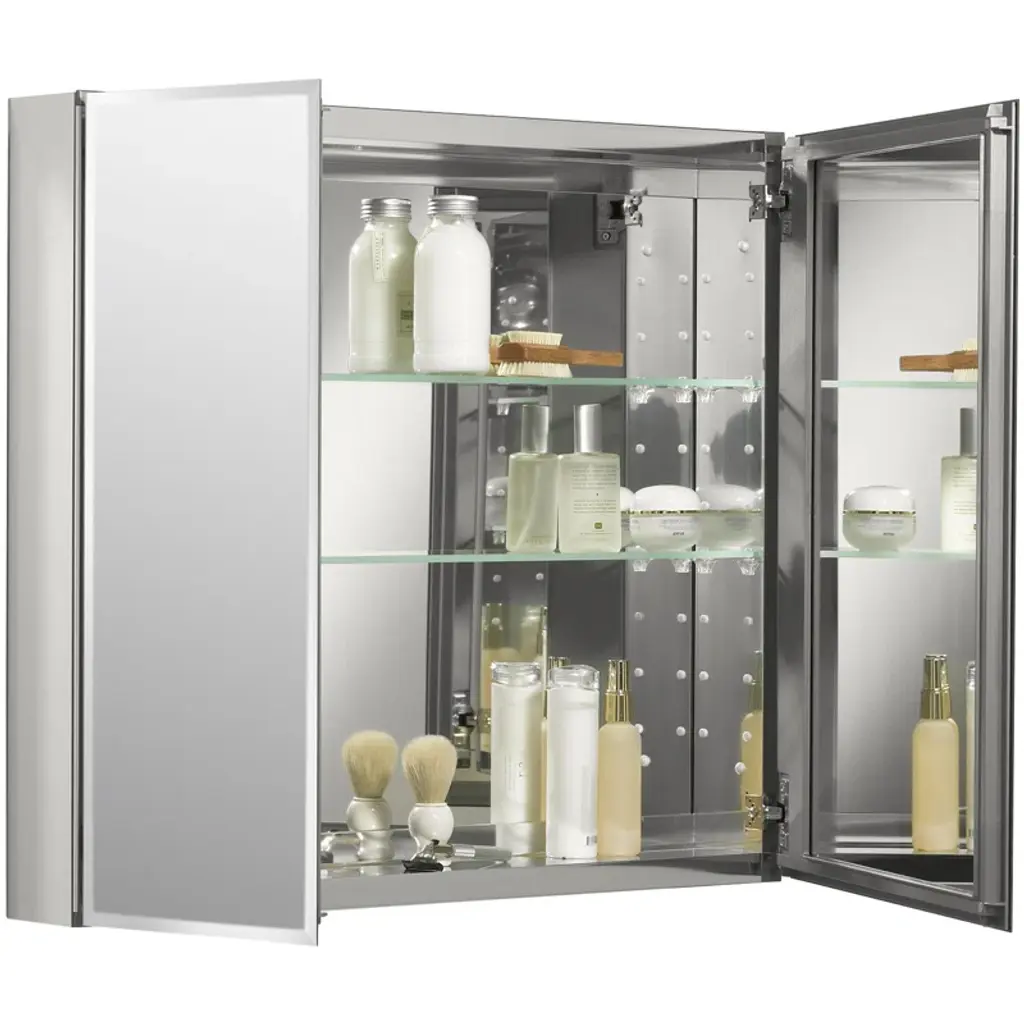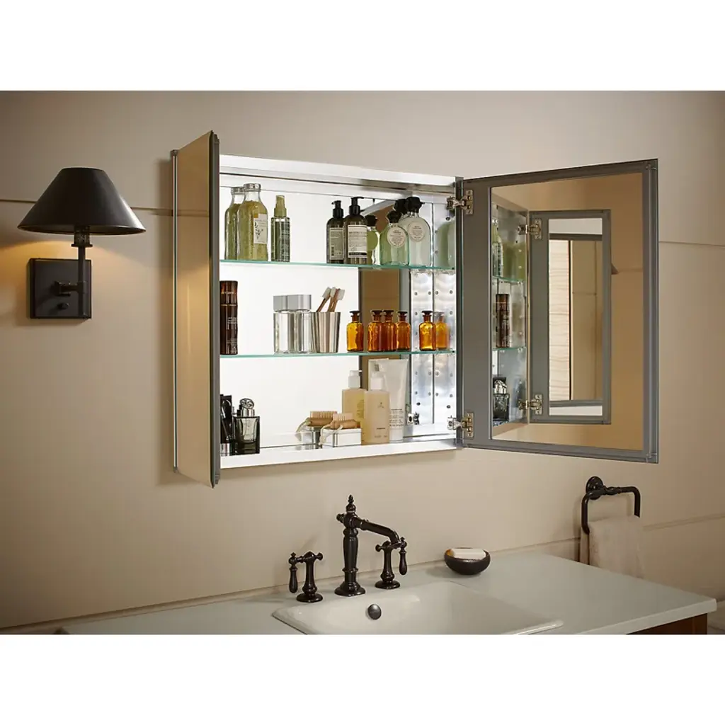 With a sleek mirrored surface inside and outside, this frameless medicine cabinet is a versatile option. The two mirrors on the front doors have a 0.5-inch bevel and appear as one larger mirror for a design that integrates easily into any bath or powder room. Interior glass shelves are adjustable to accommodate your toiletries.