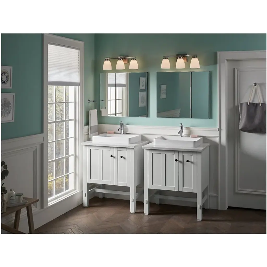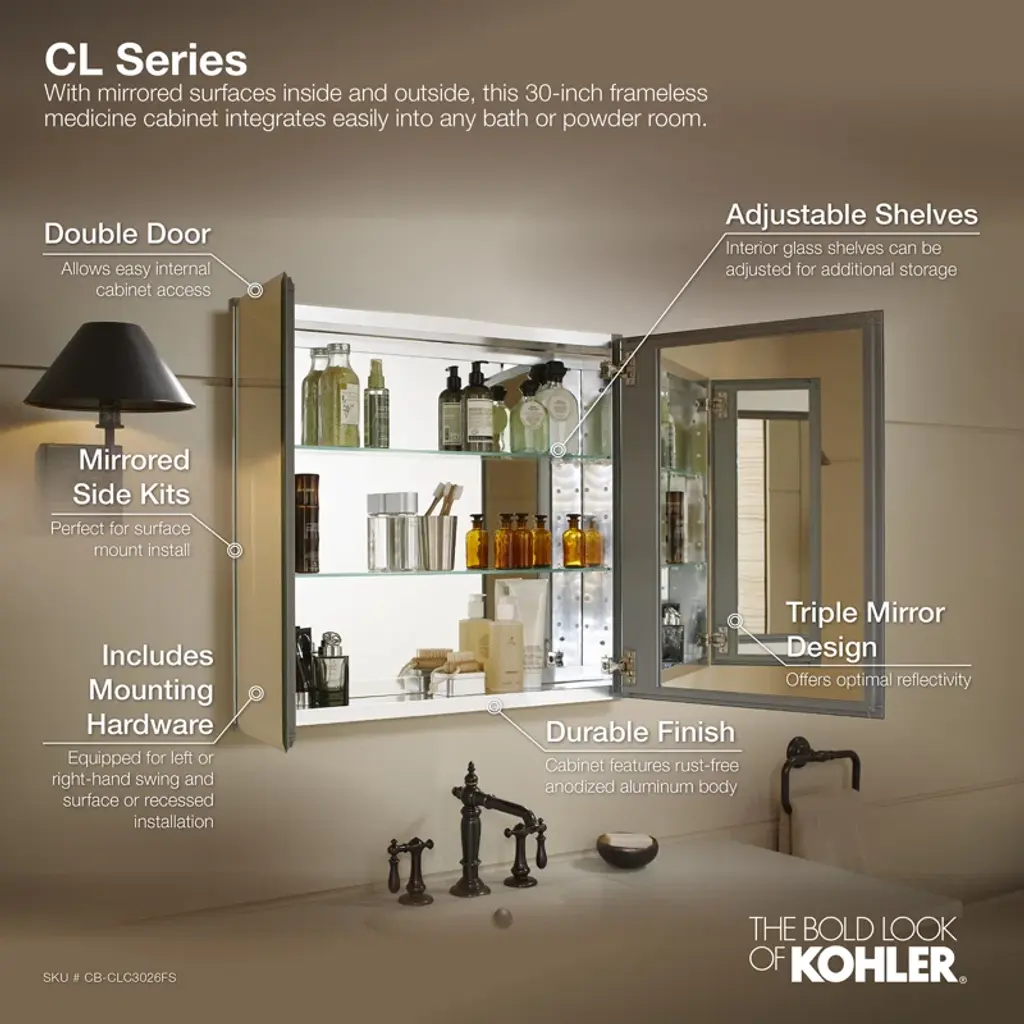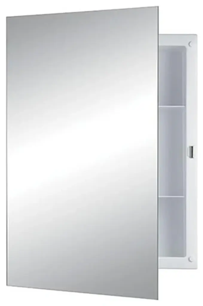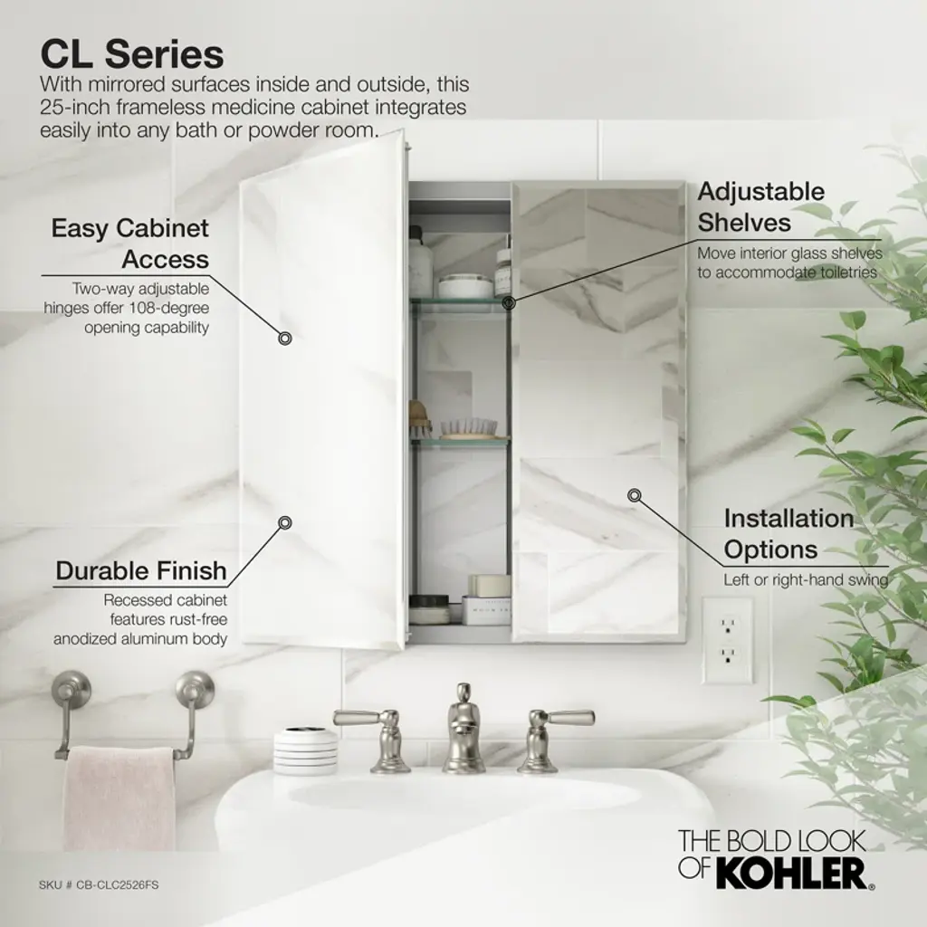 With a sleek mirrored surface inside and outside, this frameless medicine cabinet is a versatile option. The two mirrors on the front doors have a 0.5-inch bevel and appear as one larger mirror for a design that integrates easily into any bath or powder room. Interior glass shelves are adjustable to accommodate your toiletries.