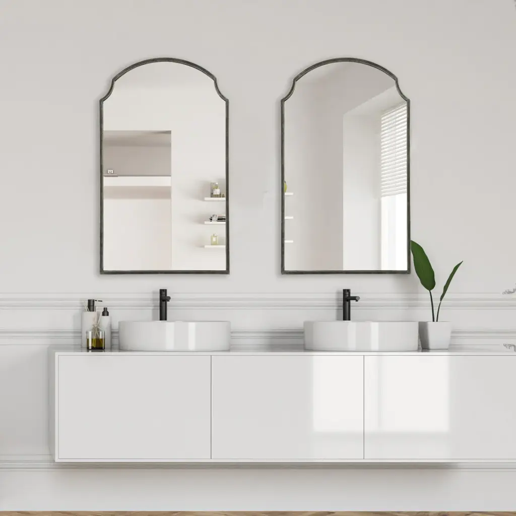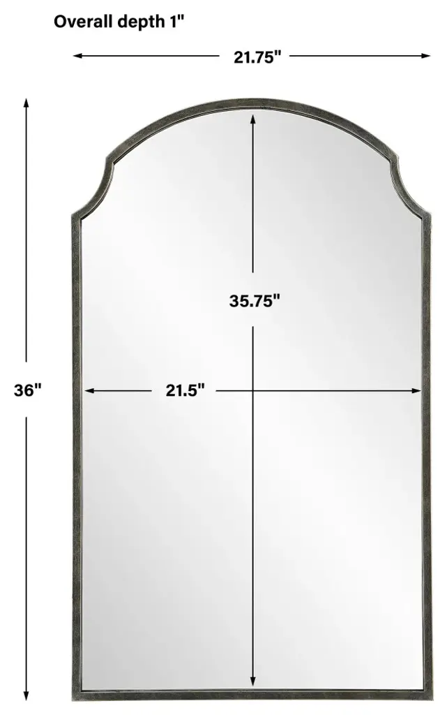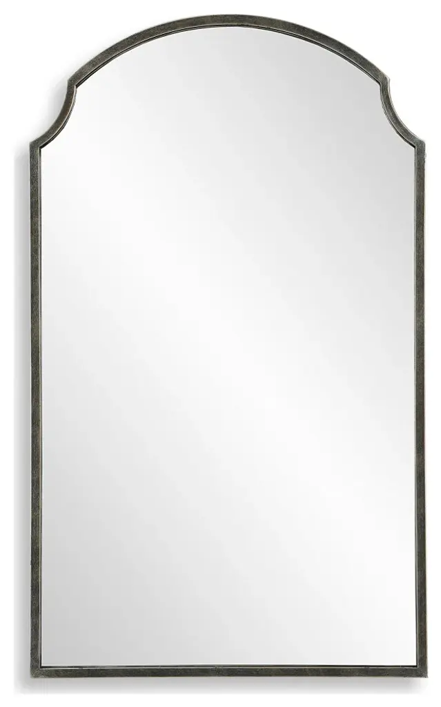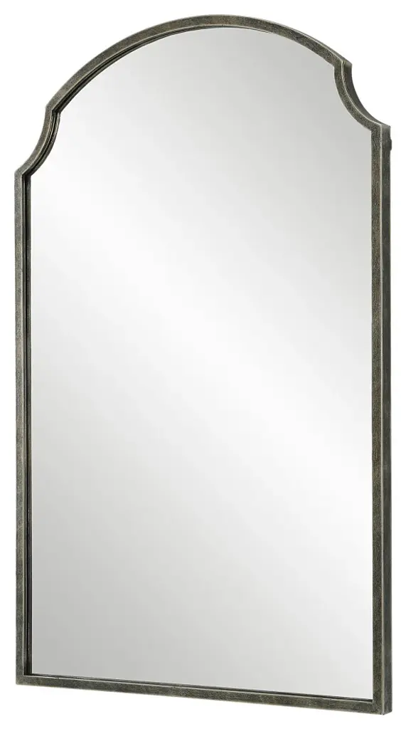 Beautiful arch top metal frame featuring scalloped corners. Hints of gold and silver complement the rich bronze finish, making this frame a great choice for a variety of bathroom vanities, or over an accent table in the foyer. Also available in a satin black.