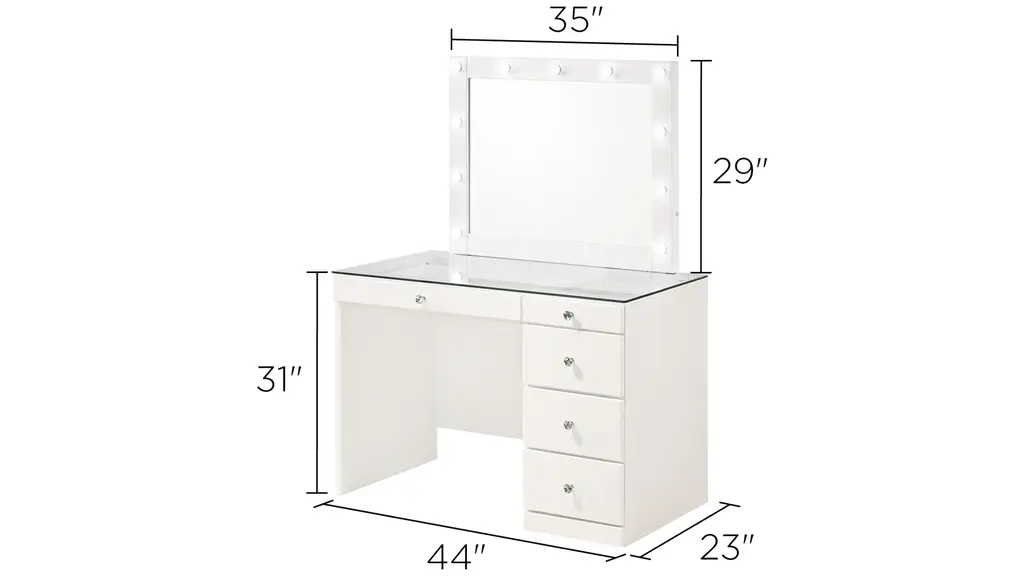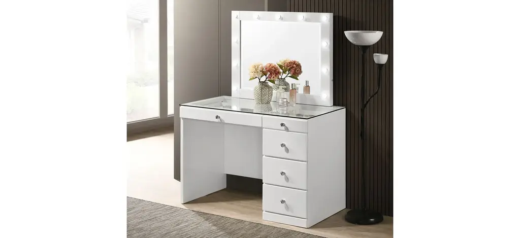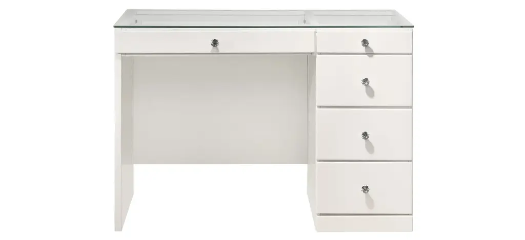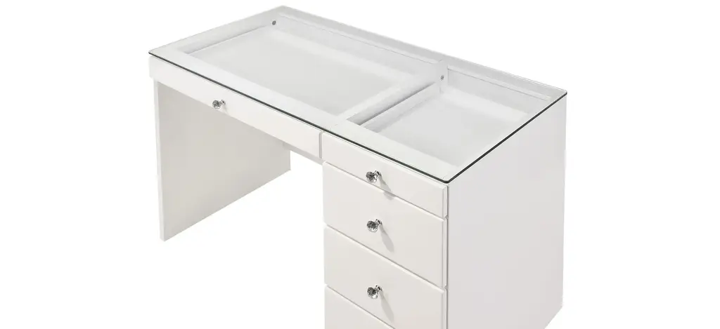 Diem Small Vanity Table w/ Mirror features a glass top that makes for easy viewing of the first row of drawers. The full extension drawers allow for easy access for all your supplies. Whatever your need, this desk will be with you for years to come.