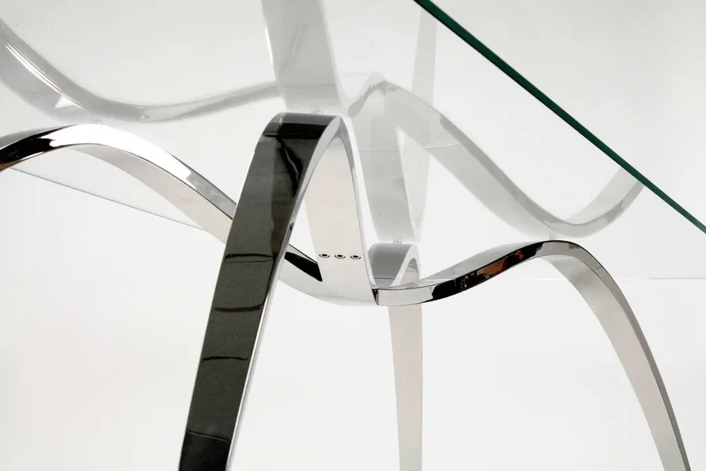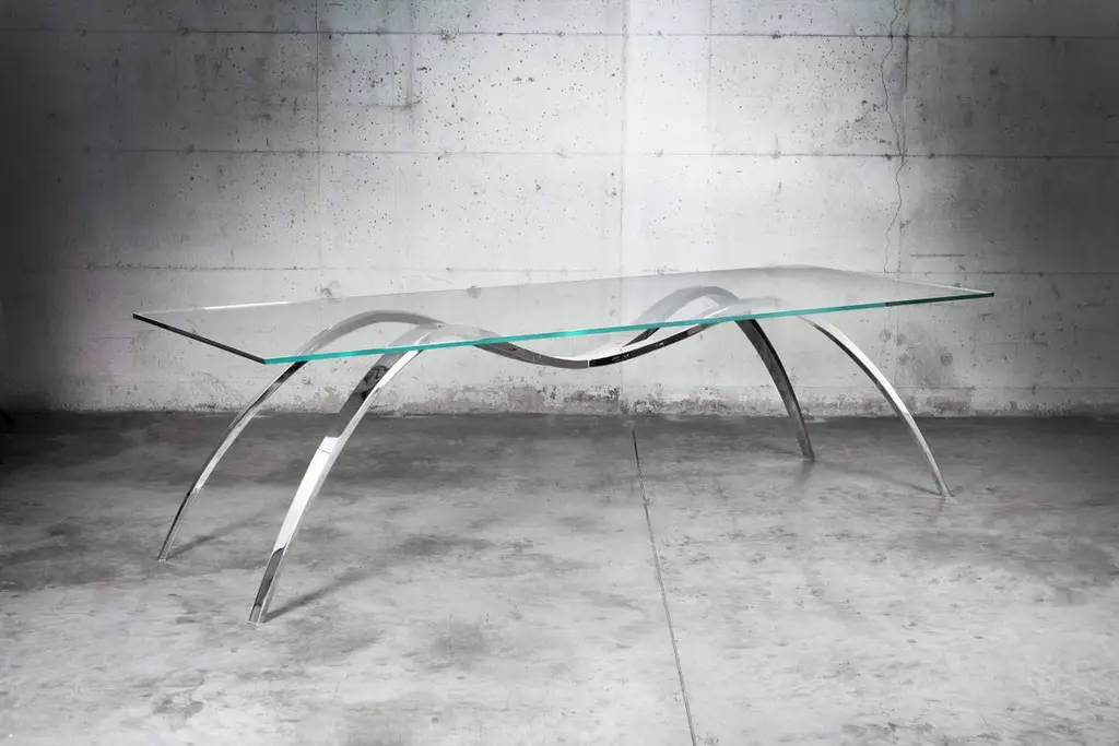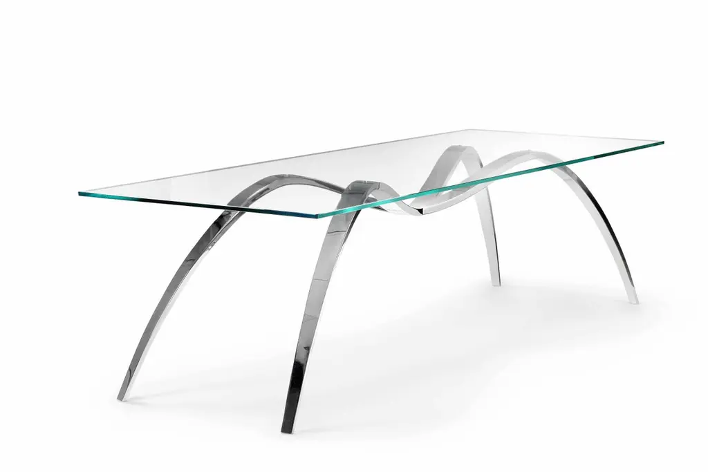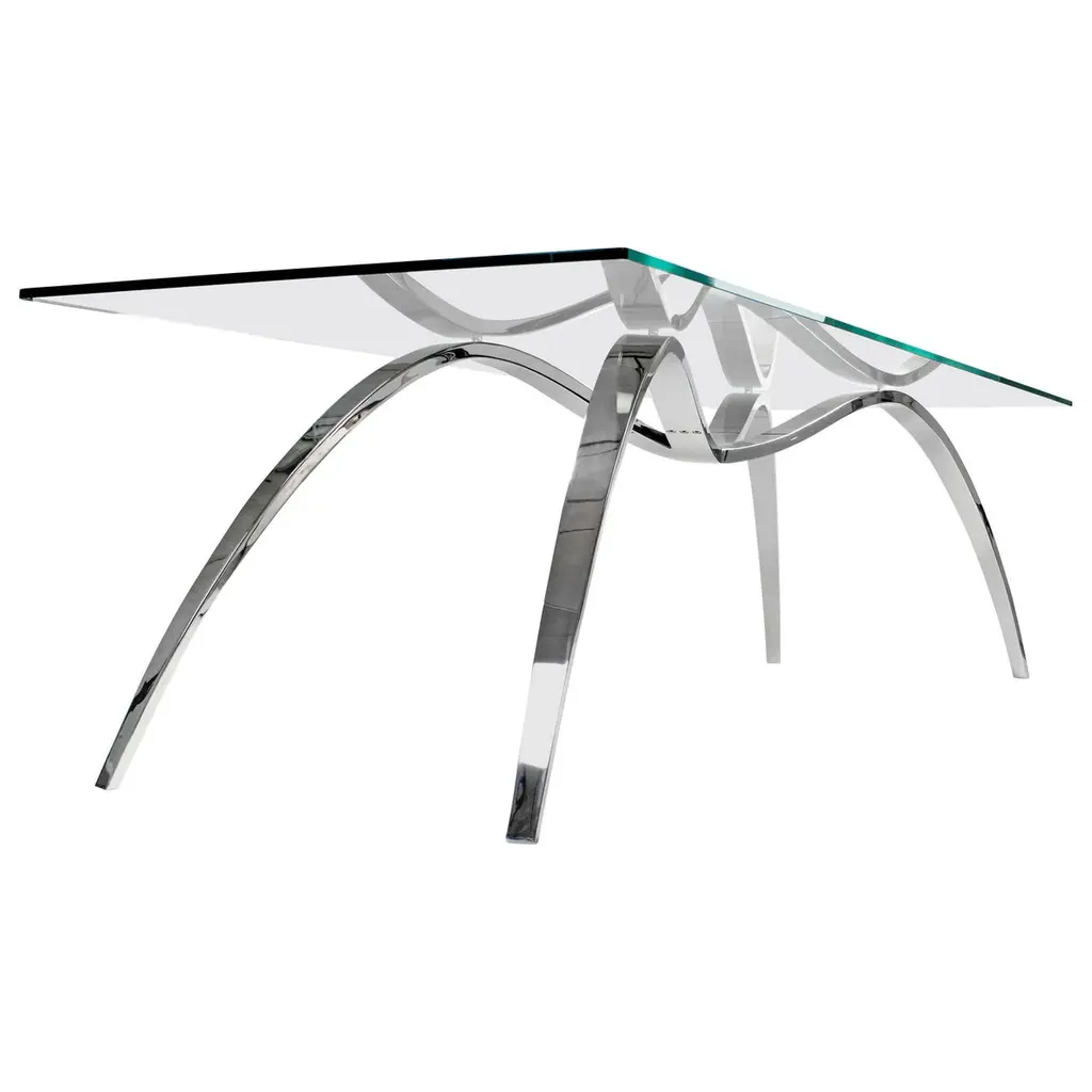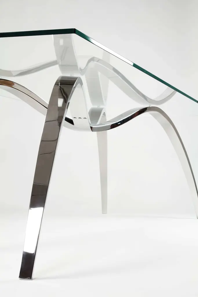 The 'Spider' dining table is made of mirror polished stainless steel and table top in extra-clear crystal glass. Dining table dimension: L 270 x W 100 x H 75 cm. Dimensions are customizable.Limited Edition of 15.Each table is hand signed and numbered by the artists (engraved), 100% handmade in Italy and comes with a “Certificate of Authenticity”.A little black spider is crawling slowly and tired on an endless road of dark wood.All of a sudden it holds motionless as if to rest; there is a cold and alien light shining on the little spider projecting its shadow, paradoxically gigantic and monstrous, on to the surface of the table.The fascinating projection of the spider’s shadow gave the inspiration for this table.We started off with a shadow, uncatchable and vanishing, in order to achieve the zoomorphic structure. The shadow, ever since slave to the body which it projects, becomes the unquestioned master and creator.The artworks by Barberini & Gunnell are regularly shown at international art fairs, such as PAD London, PAD Genève, PAD Monaco, Salon Art + Design New York, ArtMiami.IMPORTANT INFORMATION REGARDING SHIPPING:Please contact us for an independent shipping quote as we provide high quality shipping at competitive prices due to our frequency of shipping, relations with international shipping companies and the possibility to organize directly from Italy.We take care of the entire customs procedure and paperwork. On request we organize a white glove delivery and installation of the artwork inside of the property of the client. All shipments are ALL-RISK insured.We carefully pack all artworks in strong wooden crates to ensure safe transport. This service is done directly in our atelier and is complimentary. All of our artworks travel with a shock watch system in order to monitorate rough handling by shippers and movers.