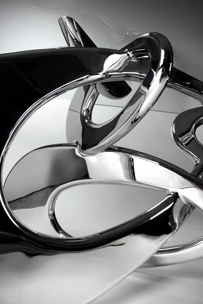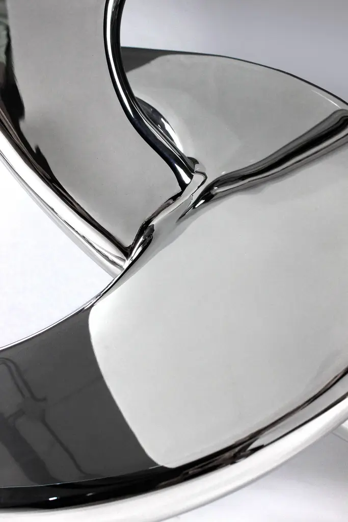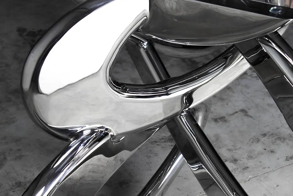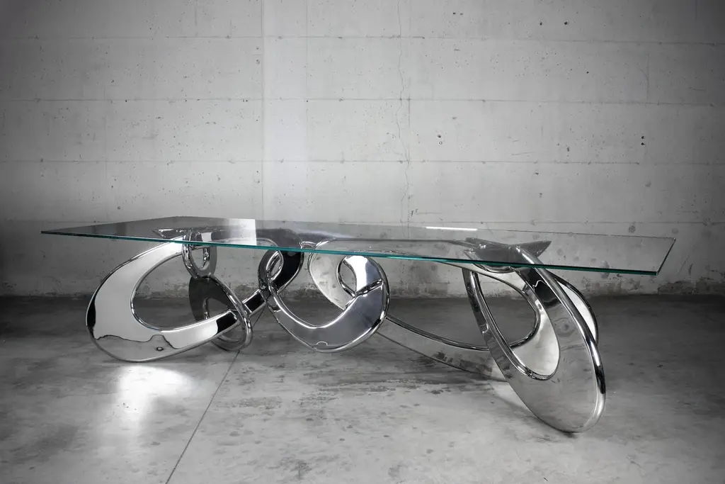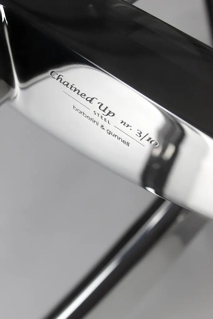 The table 'Chained up Steel' is an important dining table with structure in mirror polished stainless steel and top in crystal glass. Every single bangle is welded and highly polished by hand. The mirror-like finishing of the steel creates different perceptions of this particular material and allows interesting reflections of light. Dining table dimension: L 320 x W 120 x H 76 cm.Limited Edition of 10.Each table is hand signed and numbered by the artists (engraved), 100% handmade in Italy and comes with a “Certificate of Authenticity”.The inspiration for this table came from observing the gigantic iron chains which are used for tying up the enormous container ships or transatlantic cruisers. Spending hours at the port of Ancona we were intrigued by finding a way to build a table structure in the shape of a chain, every bangle connected to the other. Closing the chain, yet achieving a stable structure while at the same time not losing the aesthetic beauty of the finished artwork was the Challenge this table had up for us.The artworks by Barberini & Gunnell are regularly shown at international art fairs, such as PAD London, PAD Genève, PAD Monaco, Salon Art and Design New York, ArtMiami.IMPORTANT INFORMATION REGARDING SHIPPING:Please contact us for an independent shipping quote as we provide high quality shipping at competitive prices due to our frequency of shipping, relations with international shipping companies and the possibility to organize directly from Italy.We take care of the entire customs procedure and paperwork. On request we organize a white glove delivery and installation of the artwork inside of the property of the client. All shipments are ALL-RISK insured.We carefully pack all artworks in strong wooden crates to ensure safe transport. This service is done directly in our atelier and is complimentary. All of our artworks travel with a shock watch system in order to monitorate rough handling by shippers and movers.