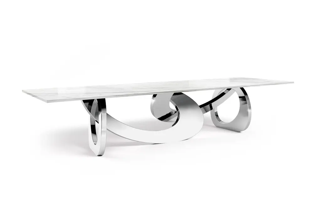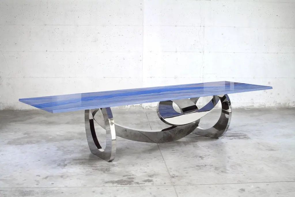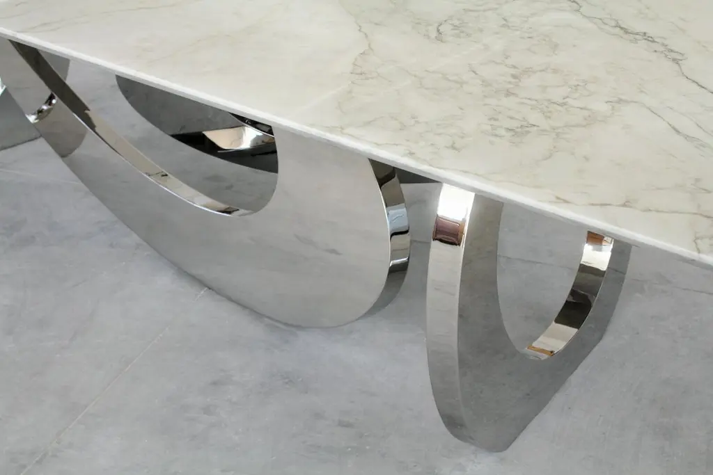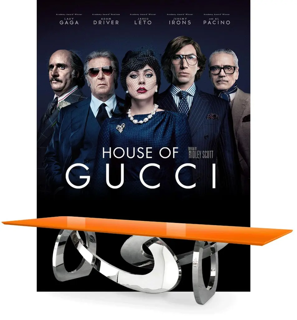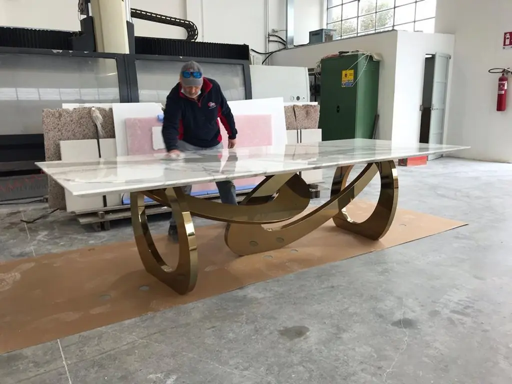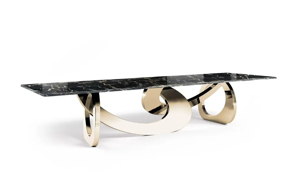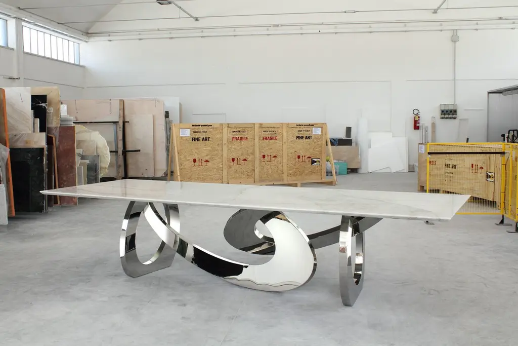 The table 'Bangles Stone' is an important dining table with structure in mirror polished stainless steel with 24 Kt gold galvanic special finish and top in Carrara marble ( Origin Tuscany ). The 24 Kt gold galvanic finish can be more or less intense and therefore from a champagne tone to a full gold tone. Every single bangle is welded and highly polished by hand. The mirror-like finishing of the steel creates different perceptions of this particular material and allows interesting reflections of light.The sculptural table 'Bangles' was chosen by Ridley Scott for his film 'HOUSE OF GUCCI' starring Lady Gaga, Al Pacino, Jeremy Irons, Adam Driver, Salma Hayek, Jared Leto.Table dimension: L 250-350 x W 120 x H 76cm. Dimensions are customizable.Limited Edition of 15.Each table is hand signed and numbered by the artists (engraved), 100% handmade in Italy and comes with a "Certificate of Authenticity".The artworks by Barberini & Gunnell are regularly shown at international art fairs, such as PAD London, PAD Genève, PAD Monaco, Salon Art + Design New York, ArtMiami.IMPORTANT INFORMATION REGARDING SHIPPING:Please contact us for an independent shipping quote as we provide high quality shipping at competitive prices due to our frequency of shipping, relations with international shipping companies and the possibility to organize directly from Italy.We take care of the entire customs procedure and paperwork. On request we organize a white glove delivery and installation of the artwork inside of the property of the client. All shipments are ALL-RISK insured.We carefully pack all artworks in strong wooden crates to ensure safe transport. This service is done directly in our atelier and is complimentary. All of our artworks travel with a shock watch system in order to monitorate rough handling by shippers and movers.