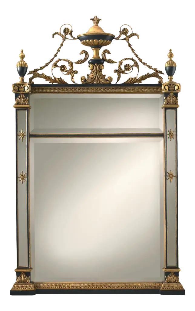 Maitland-Smith specializes in fine home furnishings and accessories, including fine living room furniture, formal dining room furniture, dining tables, and dining room chairs. Our furniture and designer occasional tables and console tables are pieces destined to become treasured family heirlooms. From one of our round cocktail tables to home office furniture, Maitland-Smith brings elegance and luxury to any distinctive living space. Empire mirror burnished gold and black, glass. Empire mirror with burnished gold and black, beveled glass.