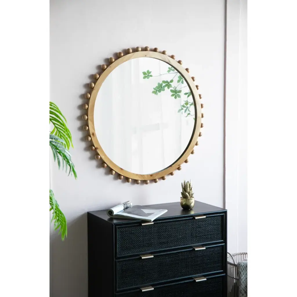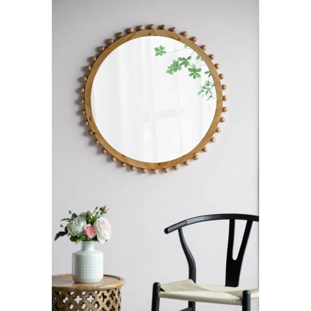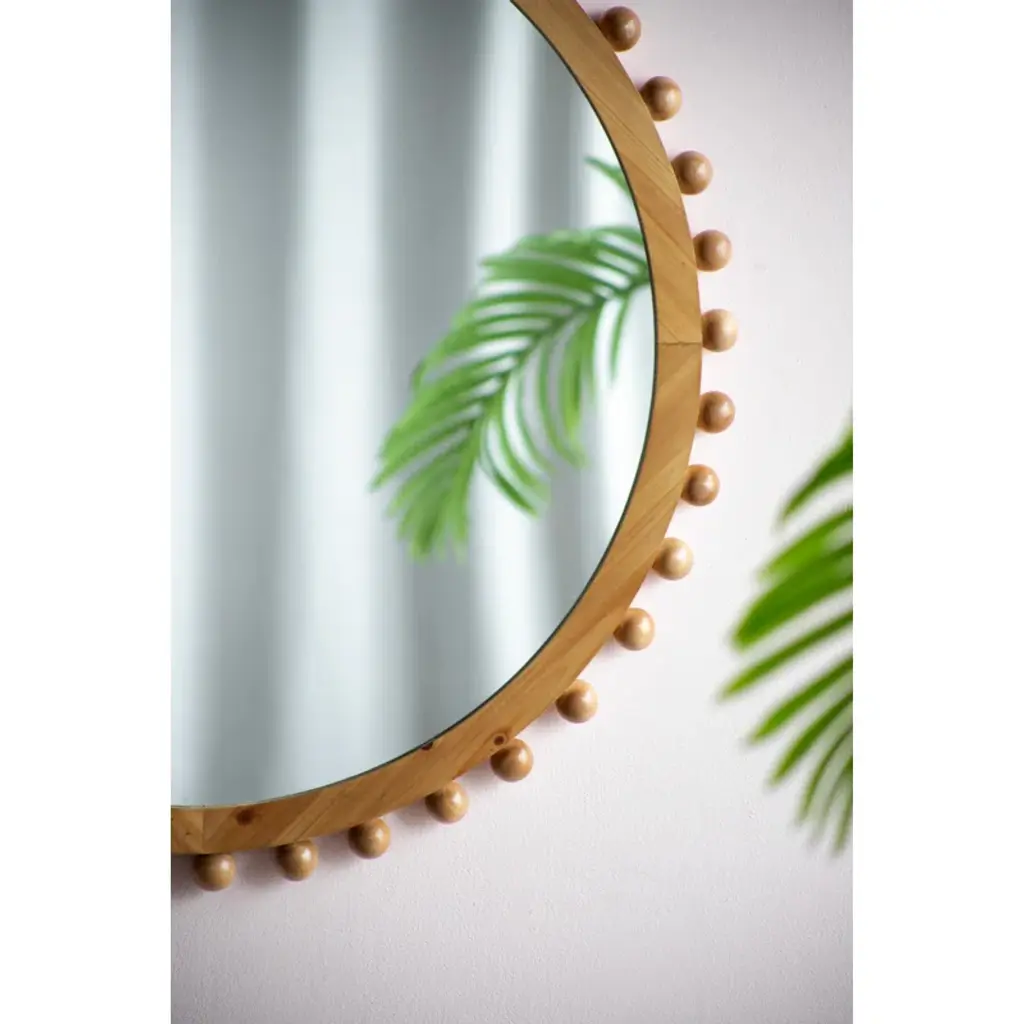 Create a bright and inviting space when you add the Estrella Wood Beads Round Mirror. Displaying a soft natural wood color, the frame of the mirror brings a fun aspect to the design with the spherical wood bead that line the frame. Compliment any farmhouse inspired design by adding the Estrella Mirror on top of any entry table or in and living space.