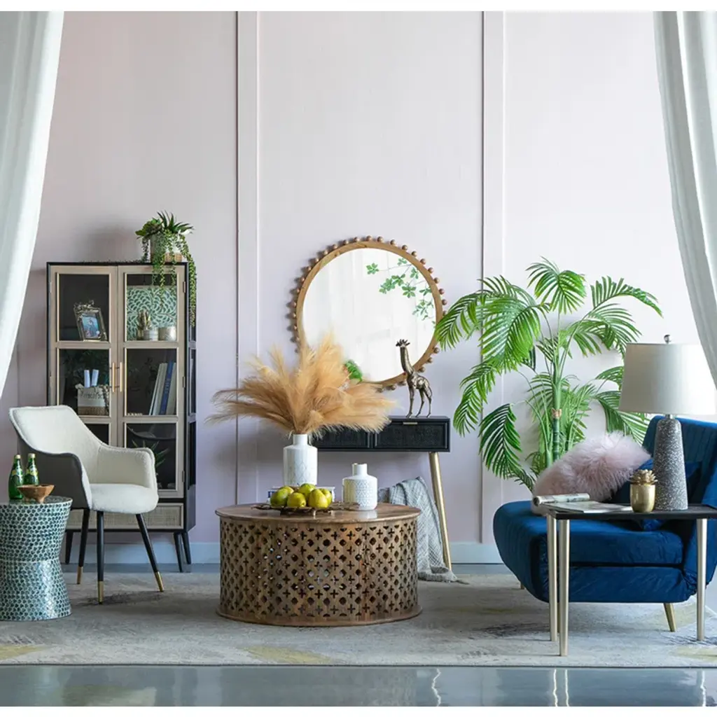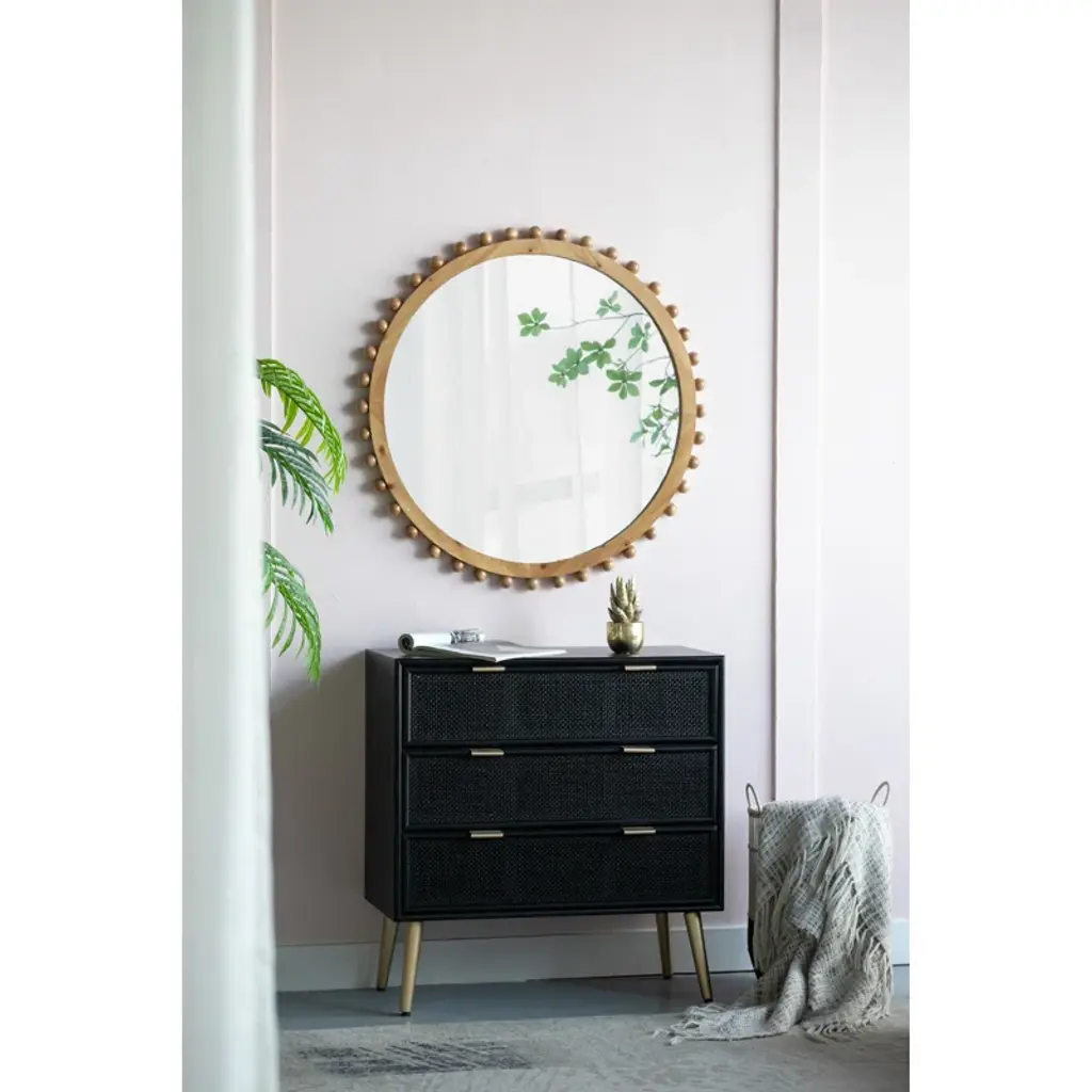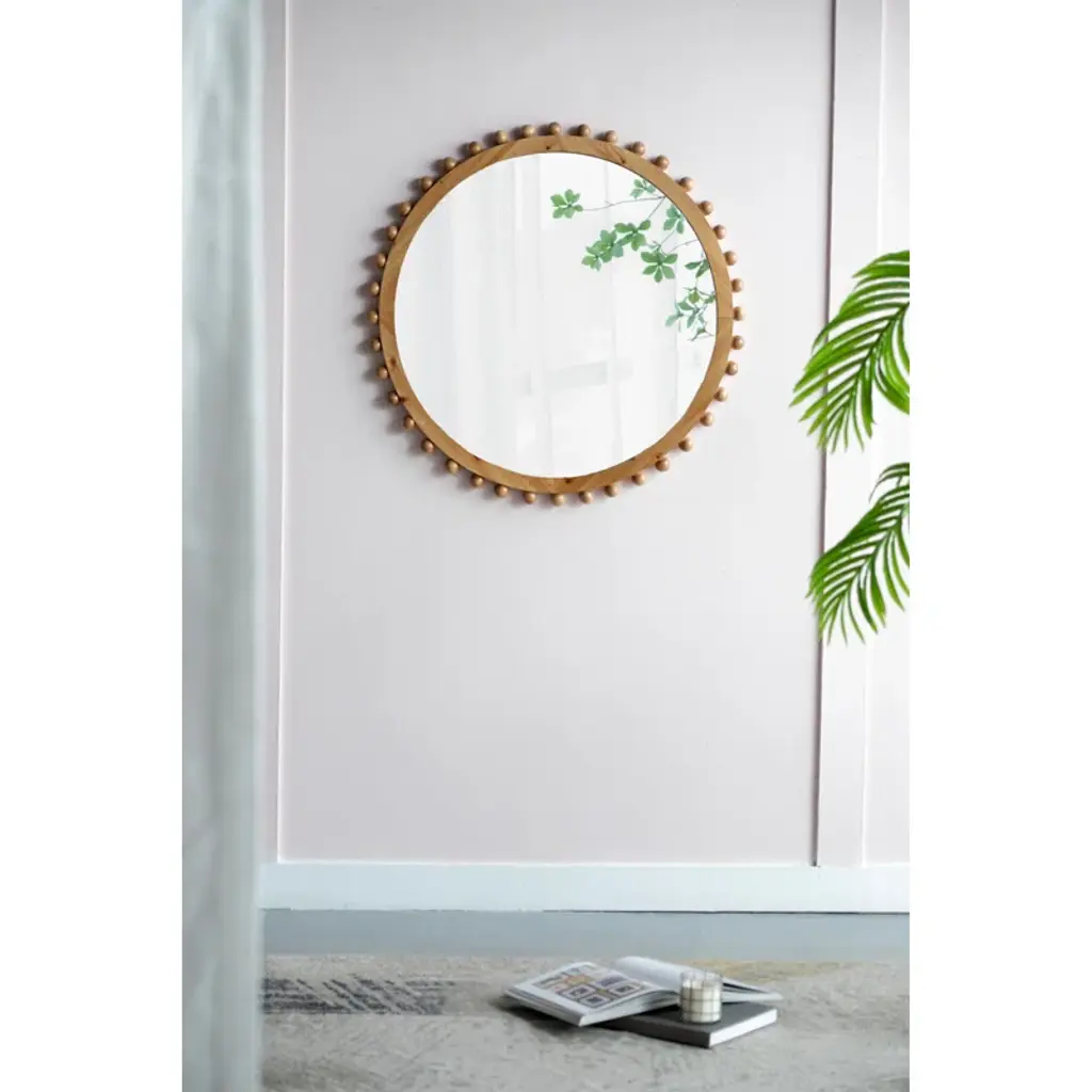 Create a bright and inviting space when you add the Estrella Wood Beads Round Mirror. Displaying a soft natural wood color, the frame of the mirror brings a fun aspect to the design with the spherical wood bead that line the frame. Compliment any farmhouse inspired design by adding the Estrella Mirror on top of any entry table or in and living space.