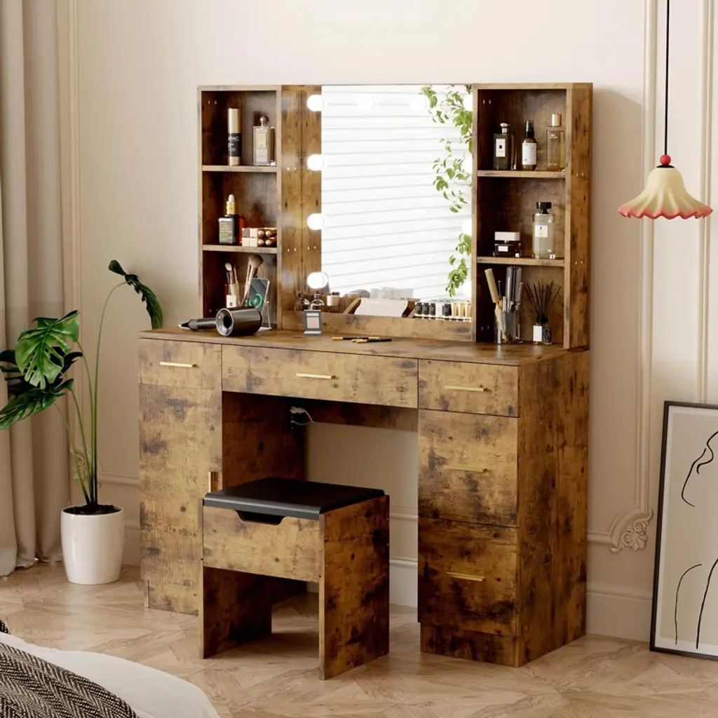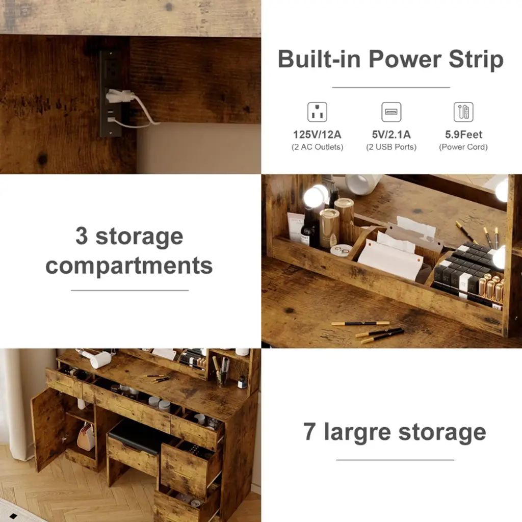 Farmhouse Vanity Set With Lighted Mirror,56 Inch Modern Makeup Vanity With Charging Station&storage Shelves