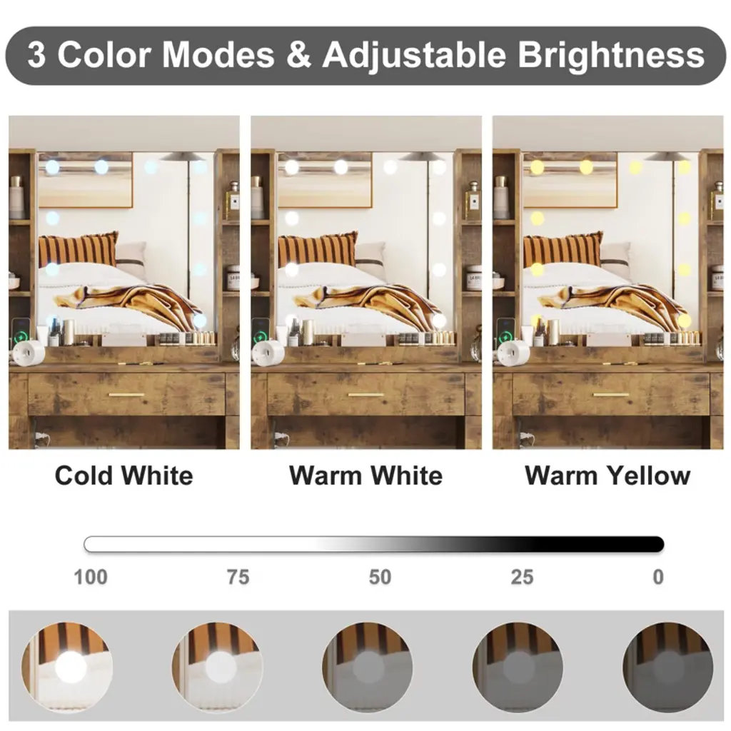 Farmhouse Vanity Set with Lighted Mirror,56 Inch Modern Makeup Vanity with Charging Station&Storage Shelves,Bedroom Dressing Table for Women& Girls,3 Lighting Modes,Brightness Adjustable
