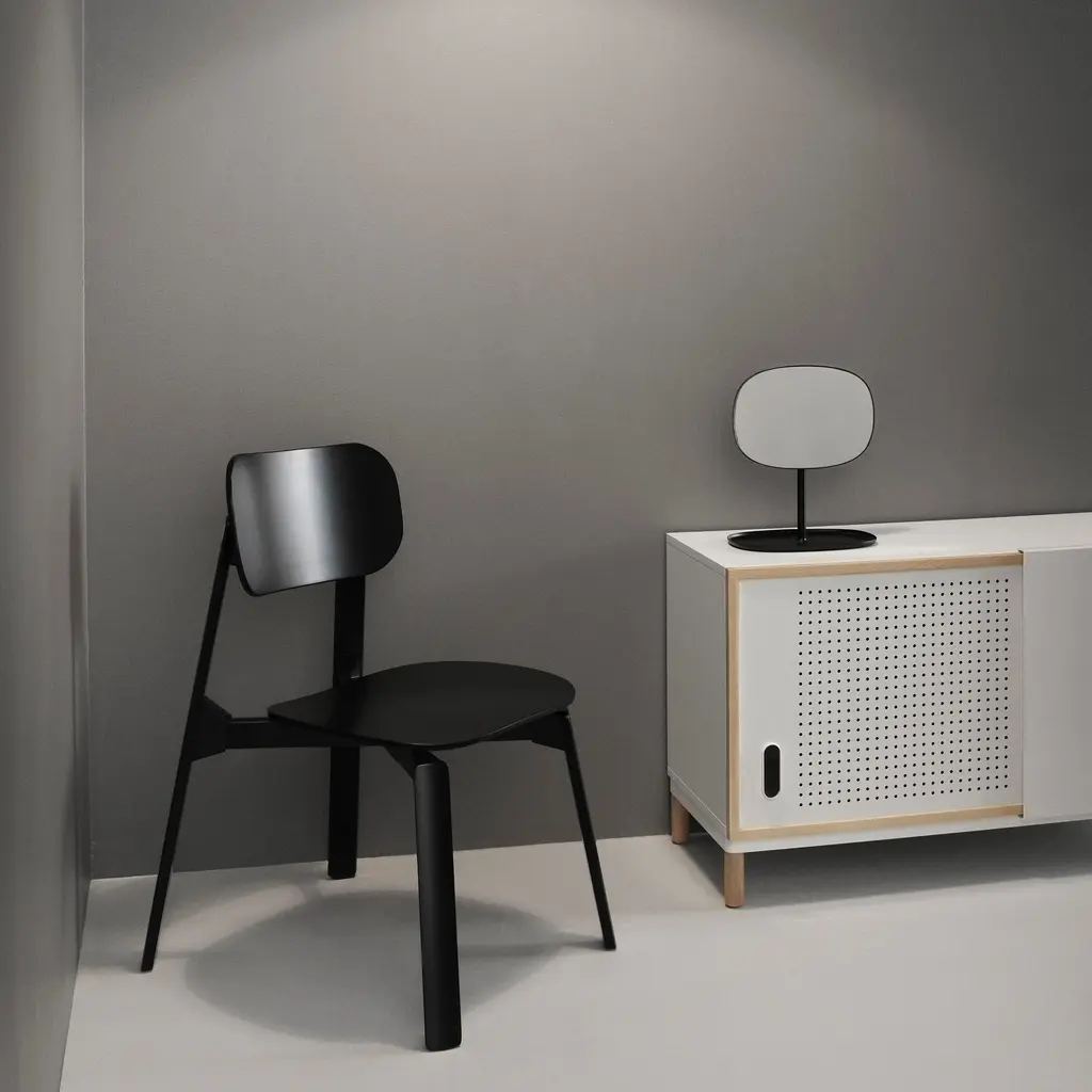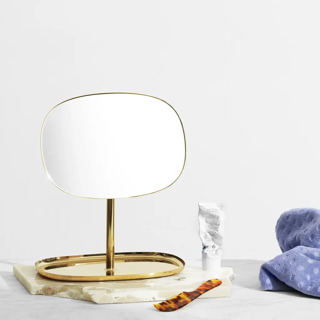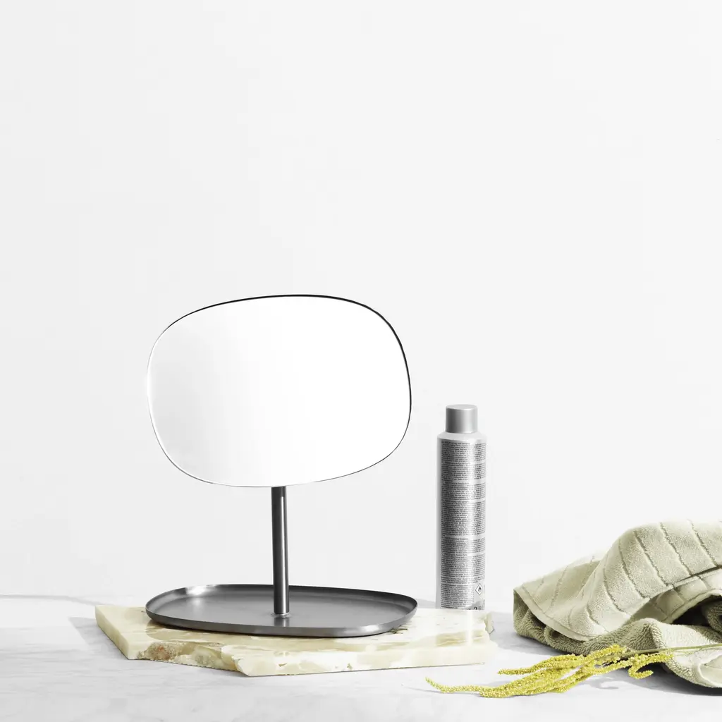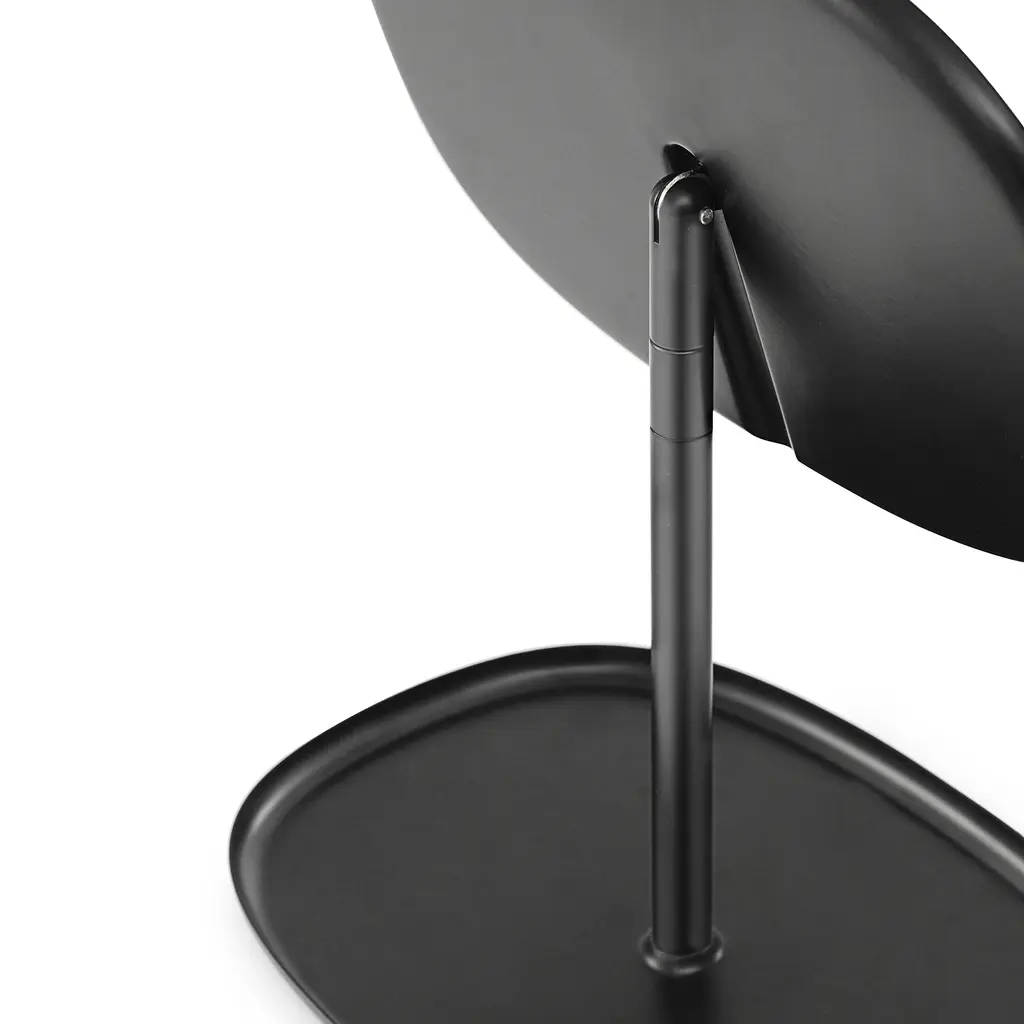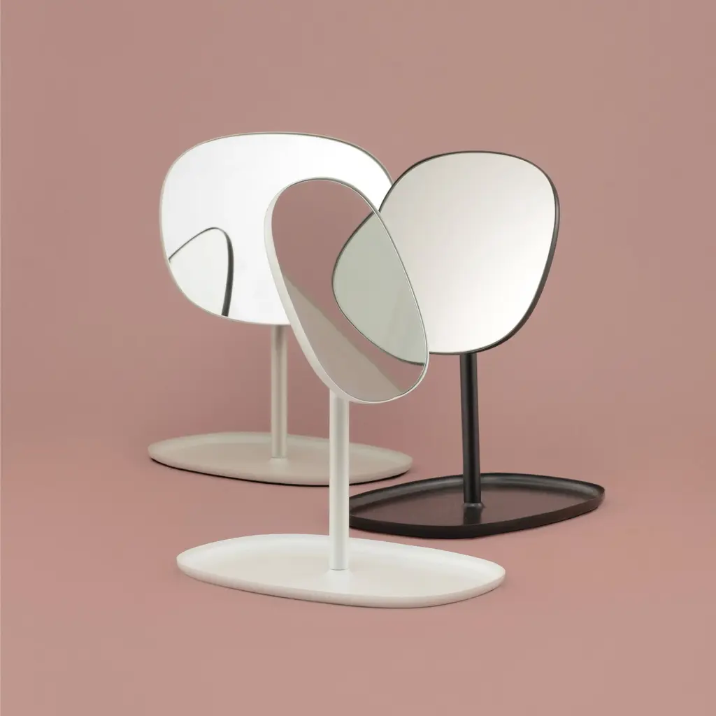 Spanish designer Javier Moreno rethinks the vanity mirror from all sides in this curved catchall for Norman Copenhagen. Glass mirror can be turned up, down and rotated 360 degrees. Organically shaped mirrored top is reflected in the base, ideal for jewelry, make-up and whatnots. The overall softness is underscored by the matte powder-coat finish. Position it on a table near the front door for keys and a last look before heading out.