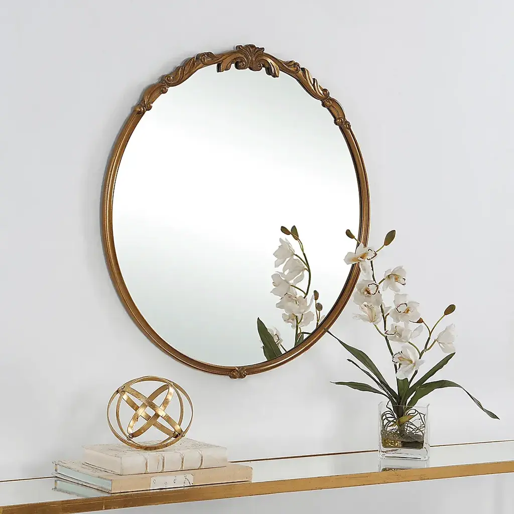Accented with ornate details, this beautiful 28" Flurin round mirror is finished in an antique gold. A light gray glaze accentuates the details. Perfect in an entryway, over a vanity or over your favorite table.