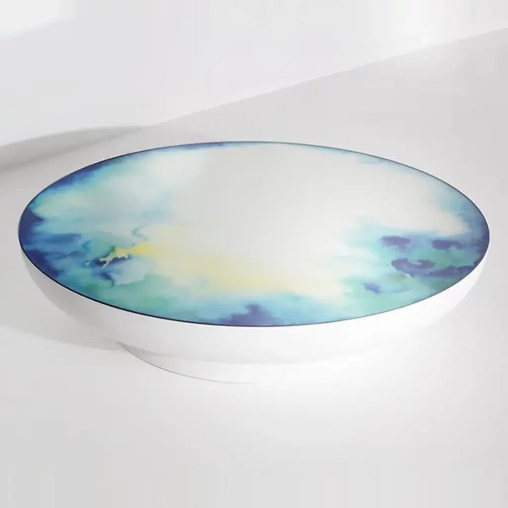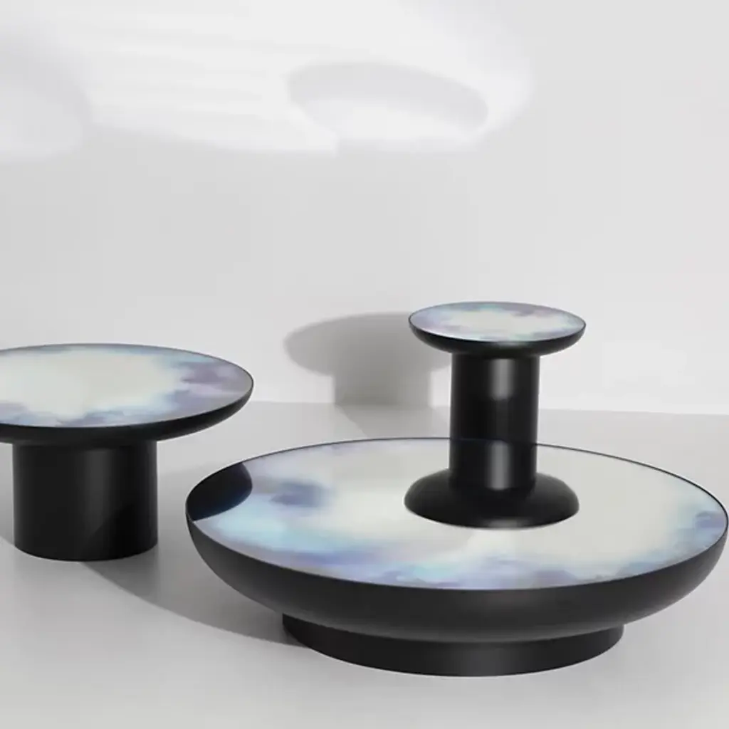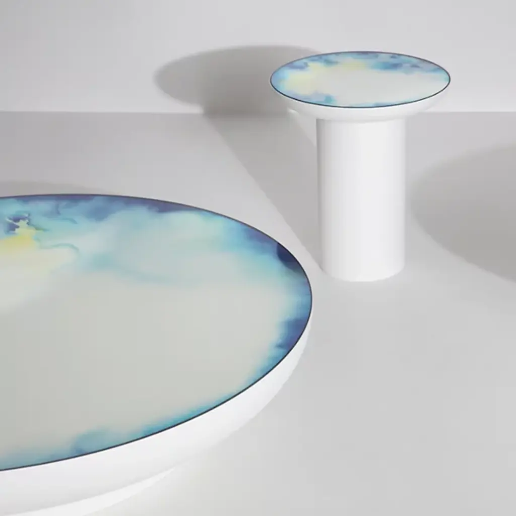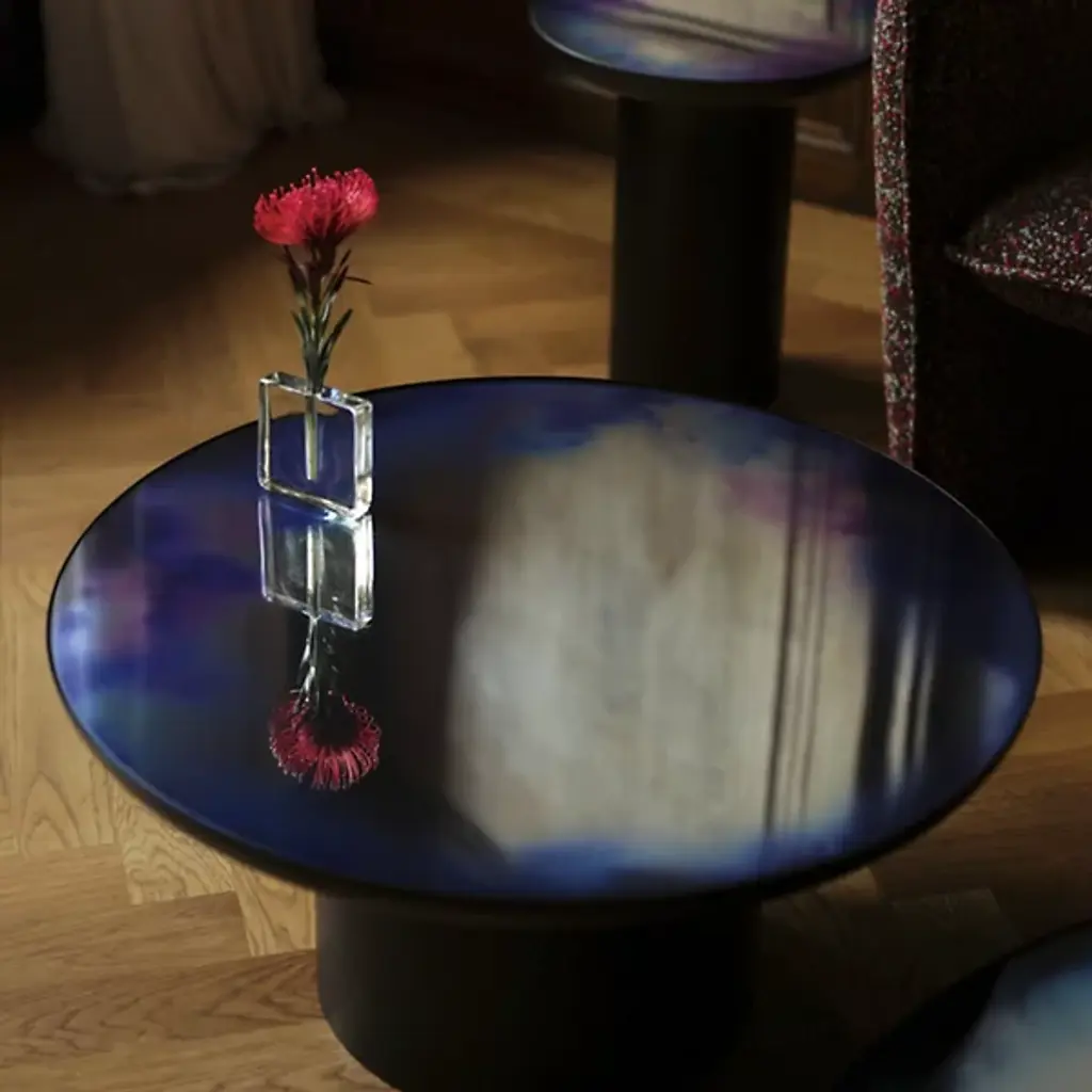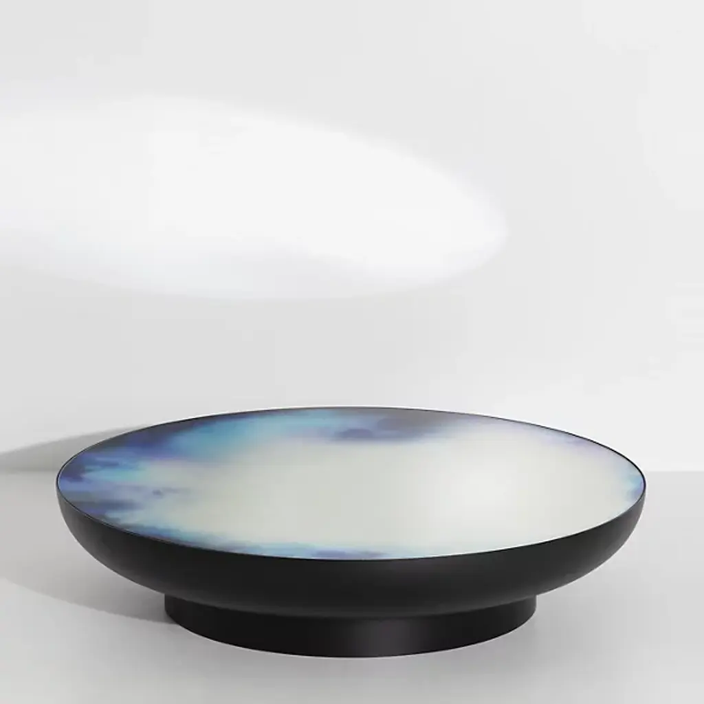 When designing the Francis Extra-Large Mirror-Coffee Table for Petite Friture, designer Constance Guisset drew upon the beauty found in old, oxidized mirrors and the look of watercolor paint billowing into water. The Parisian designer hand panted each design before digitally altering and printing them onto the antiqued glass mirror surface. Covered with layers of clear laminate, the designs take on movement and depth as they hover over the round surface. The table appears to float inches off the ground due to its steel base that inconspicuously elevates it with ease and sophistication.