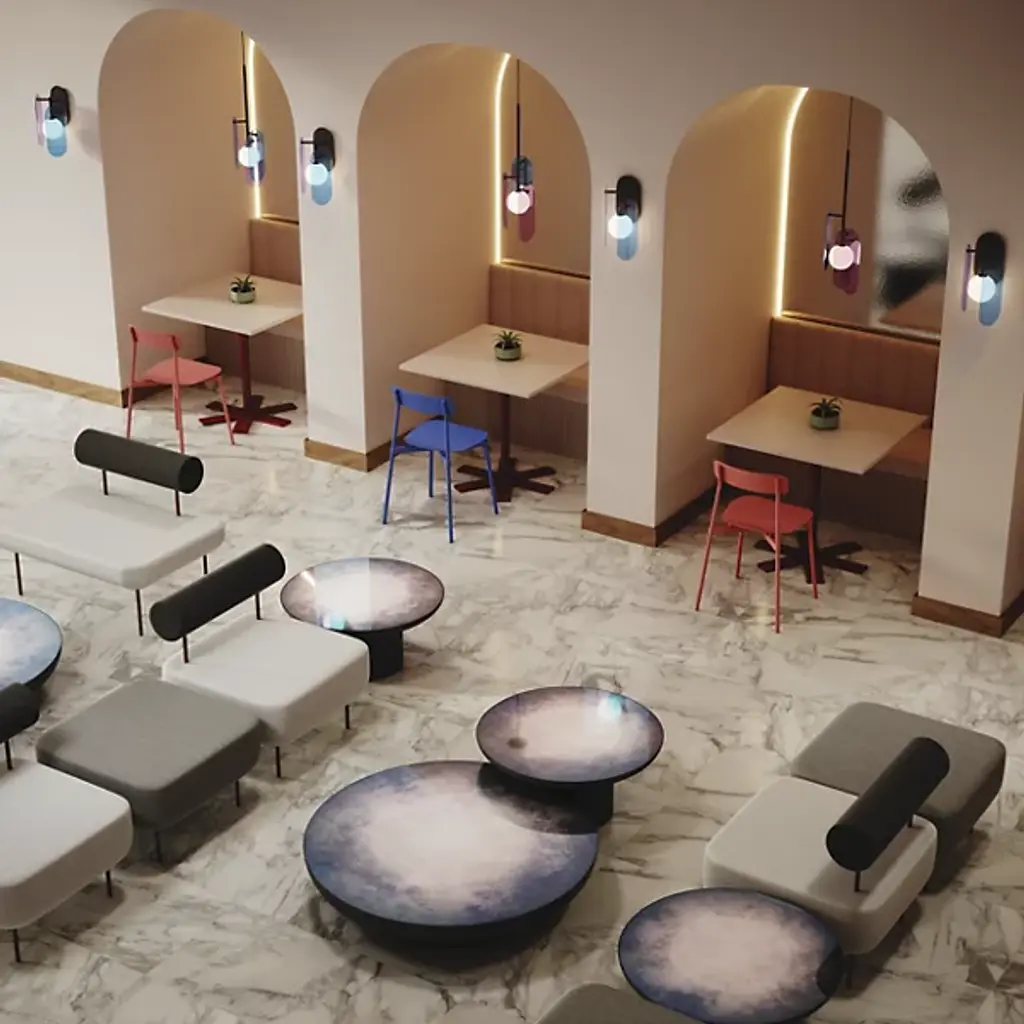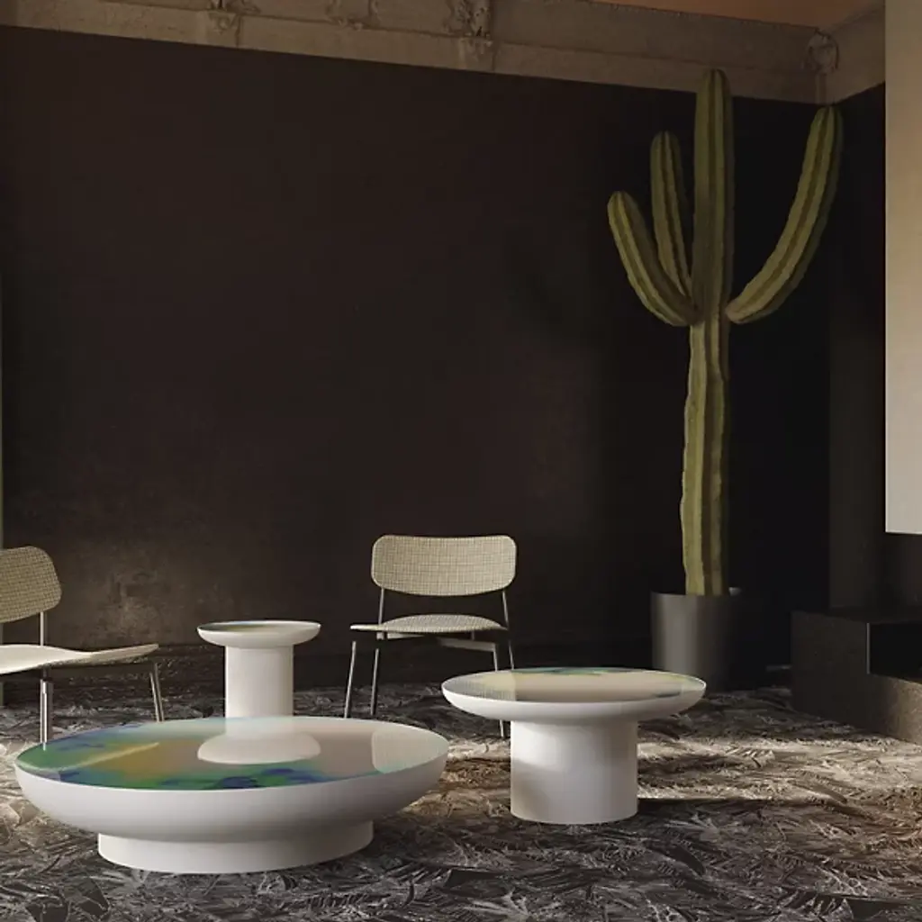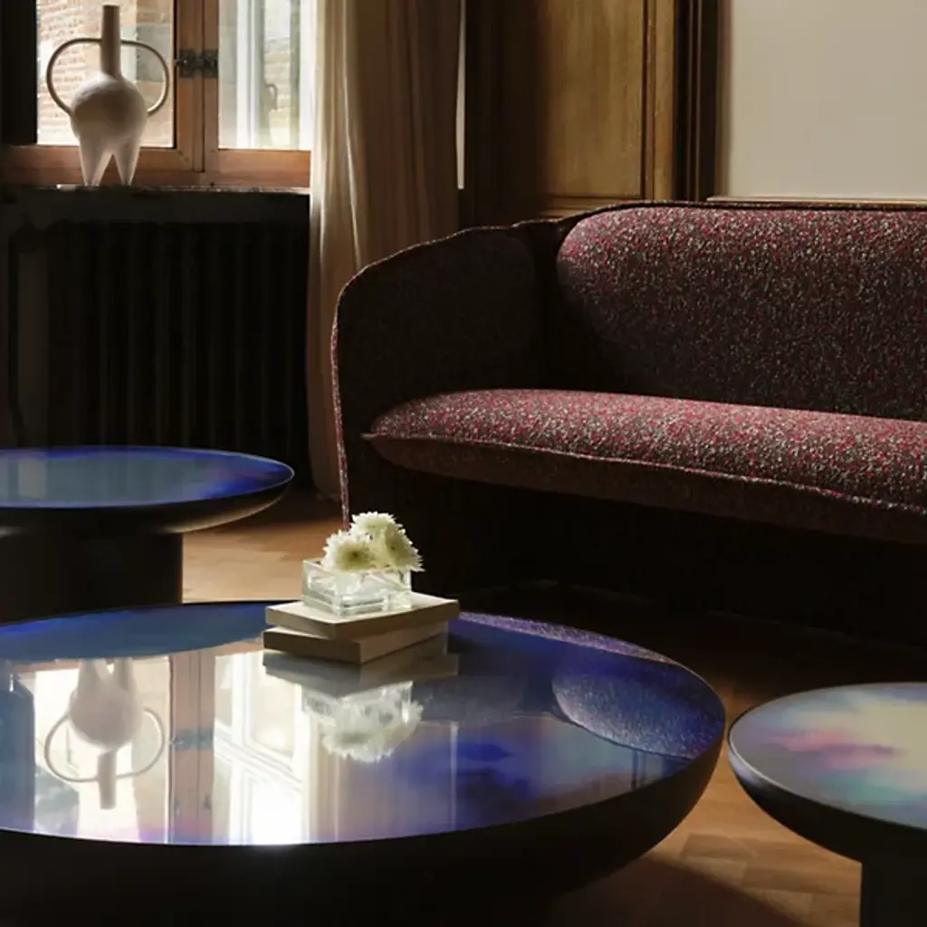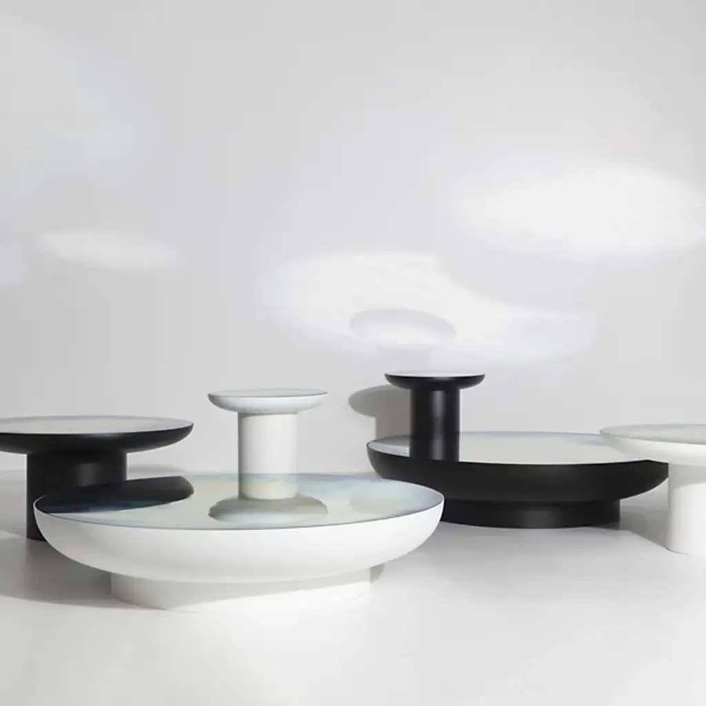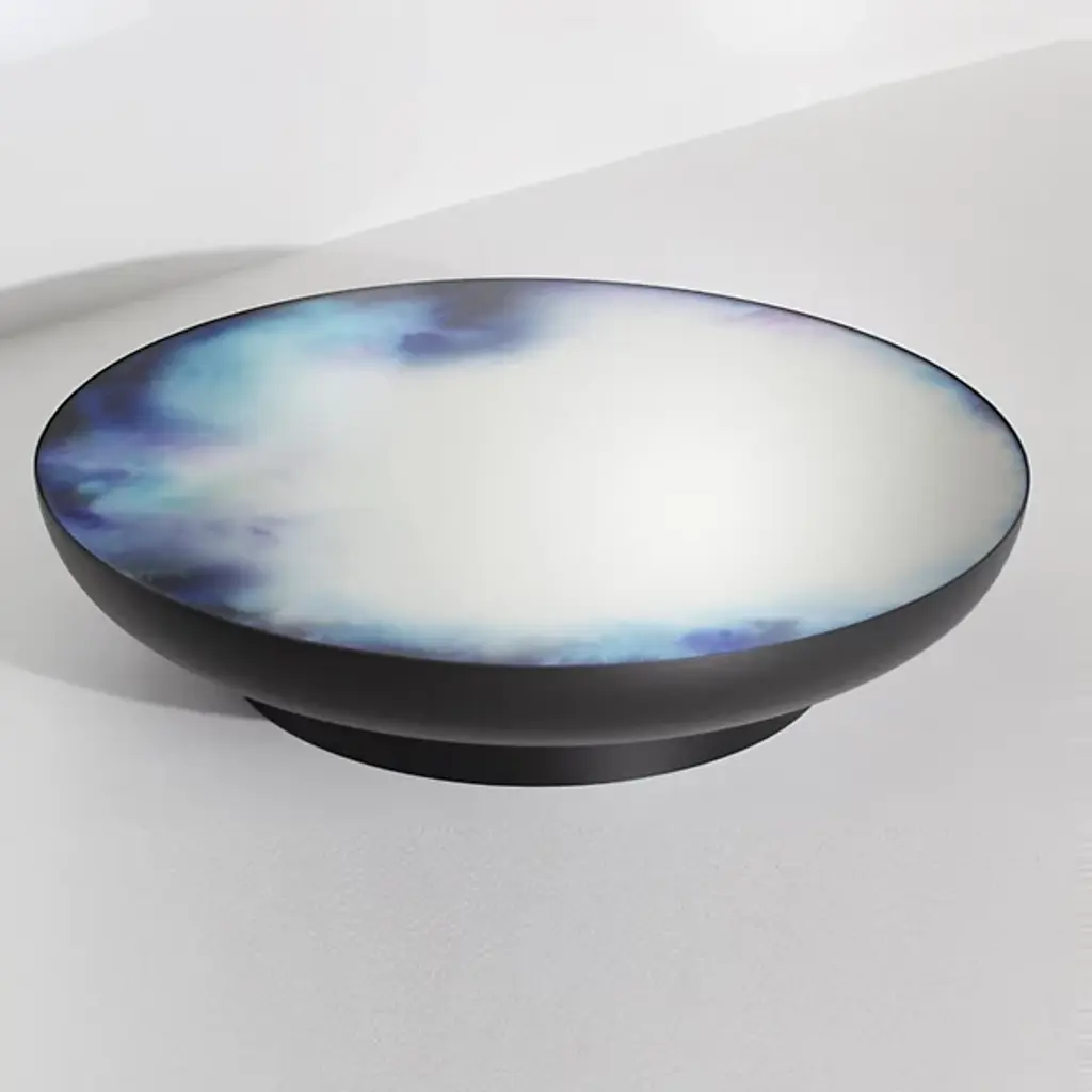 When designing the Francis Extra-Large Mirror-Coffee Table for Petite Friture, designer Constance Guisset drew upon the beauty found in old, oxidized mirrors and the look of watercolor paint billowing into water. The Parisian designer hand panted each design before digitally altering and printing them onto the antiqued glass mirror surface. Covered with layers of clear laminate, the designs take on movement and depth as they hover over the round surface. The table appears to float inches off the ground due to its steel base that inconspicuously elevates it with ease and sophistication.