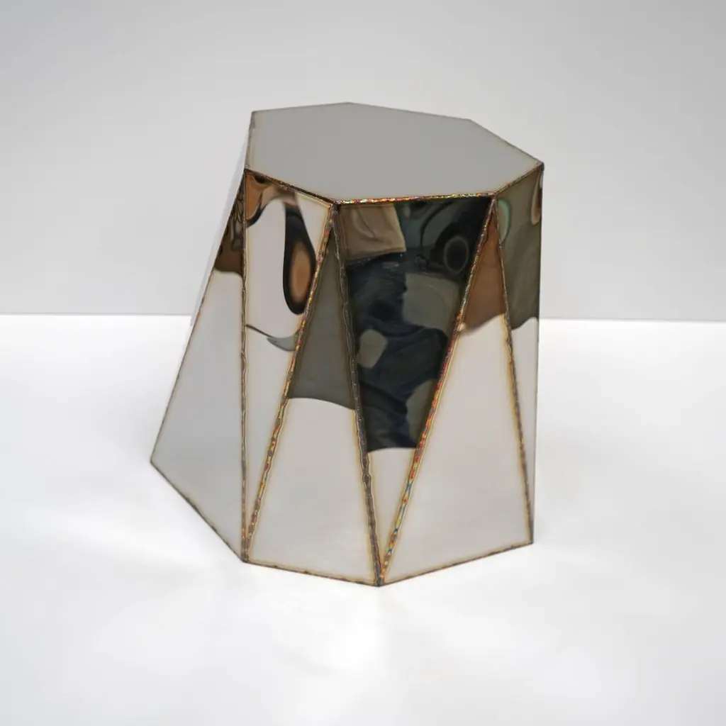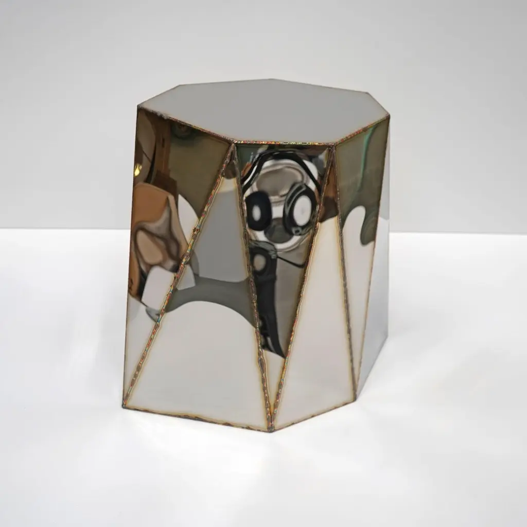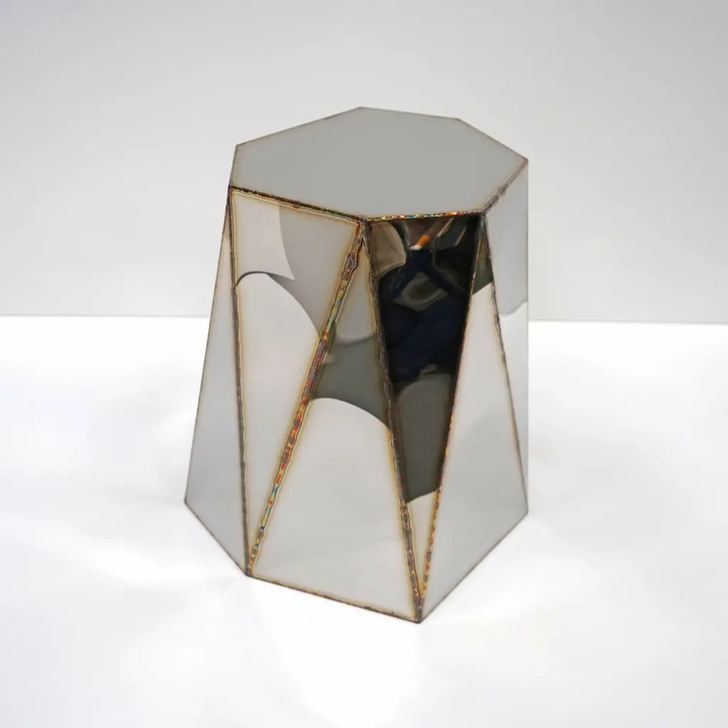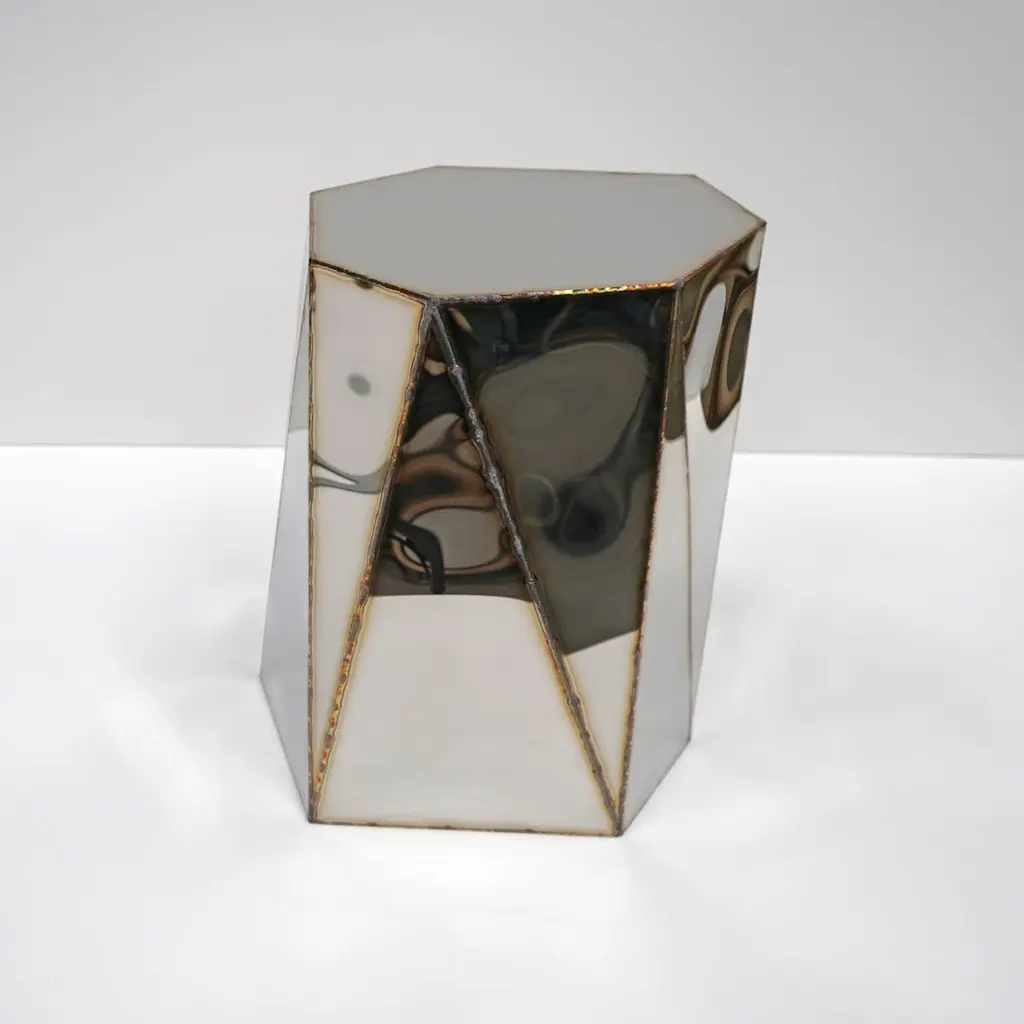 Geiger Side Table in Welded Mirror-Polished Stainless Steel by Julian MayorLimited Edition of 8 + 4AP.Dimensions: D 45 x W 58 x H 50 cm. Materials: Mirror-polished stainless steel.Julian Mayor is a British artist and designer renowned for his sculptural works crafted from welded sheet metal. Using high-tech design processes, the artist creates each piece digitally on a computer before building it by hand in his workshop. Born in 1976, Mayor graduated with a BA in Industrial Design from the University of Northumbria in 1998, followed by an MA from the Royal College of Art in Design Products under Ron Arad. After graduating in 2000, he moved to Northern California and worked for a design consultant agency as a product and interior designer. By 2004, Mayor returned to London to work for UK-based agencies, including Pentagram, and collaborated with British designer Tom Dixon. The artist’s work has been exhibited at the Victoria & Albert Museum, London, the Museum of Arts and Design, New York, MUDAC Lausanne, Switzerland, and the Yorkshire Sculpture Park, UK. He has installed a permanent series of sculptural benches in a park behind the Tate Britain in Pimlico, London. Mayor lives and works in Doncaster, South Yorkshire, UK.