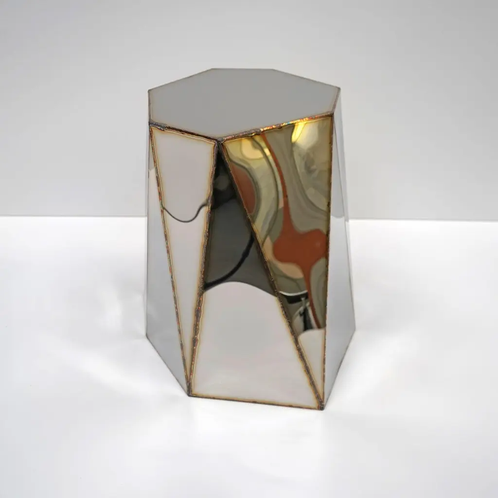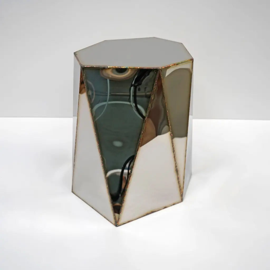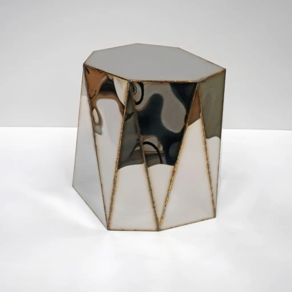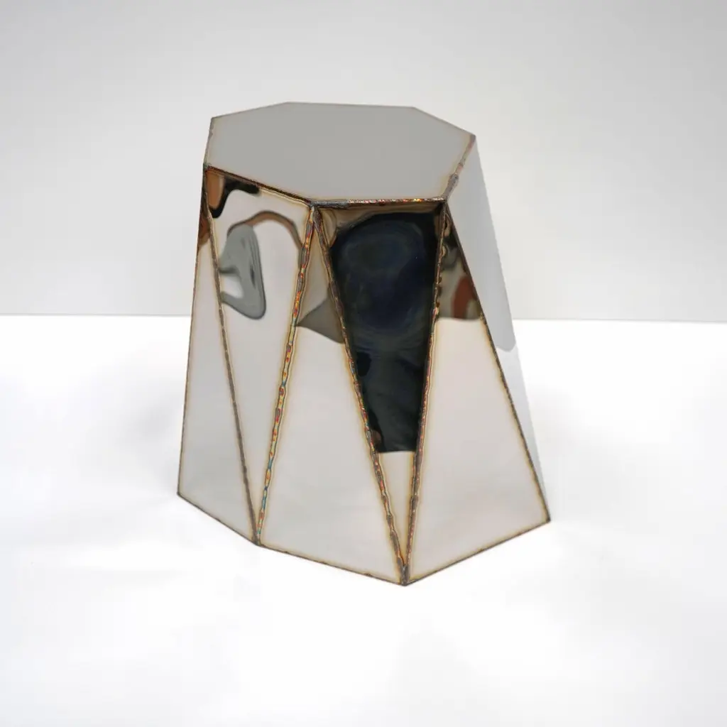 Geiger Side Table in Welded Mirror-Polished Stainless Steel by Julian MayorLimited Edition of 8 + 4AP.Dimensions: D 45 x W 58 x H 50 cm. Materials: Mirror-polished stainless steel.Julian Mayor is a British artist and designer renowned for his sculptural works crafted from welded sheet metal. Using high-tech design processes, the artist creates each piece digitally on a computer before building it by hand in his workshop. Born in 1976, Mayor graduated with a BA in Industrial Design from the University of Northumbria in 1998, followed by an MA from the Royal College of Art in Design Products under Ron Arad. After graduating in 2000, he moved to Northern California and worked for a design consultant agency as a product and interior designer. By 2004, Mayor returned to London to work for UK-based agencies, including Pentagram, and collaborated with British designer Tom Dixon. The artist’s work has been exhibited at the Victoria & Albert Museum, London, the Museum of Arts and Design, New York, MUDAC Lausanne, Switzerland, and the Yorkshire Sculpture Park, UK. He has installed a permanent series of sculptural benches in a park behind the Tate Britain in Pimlico, London. Mayor lives and works in Doncaster, South Yorkshire, UK.