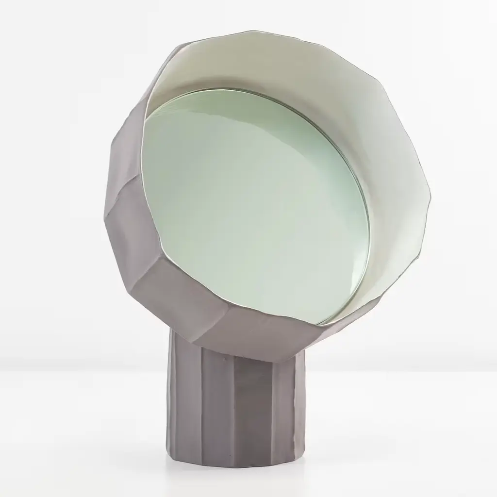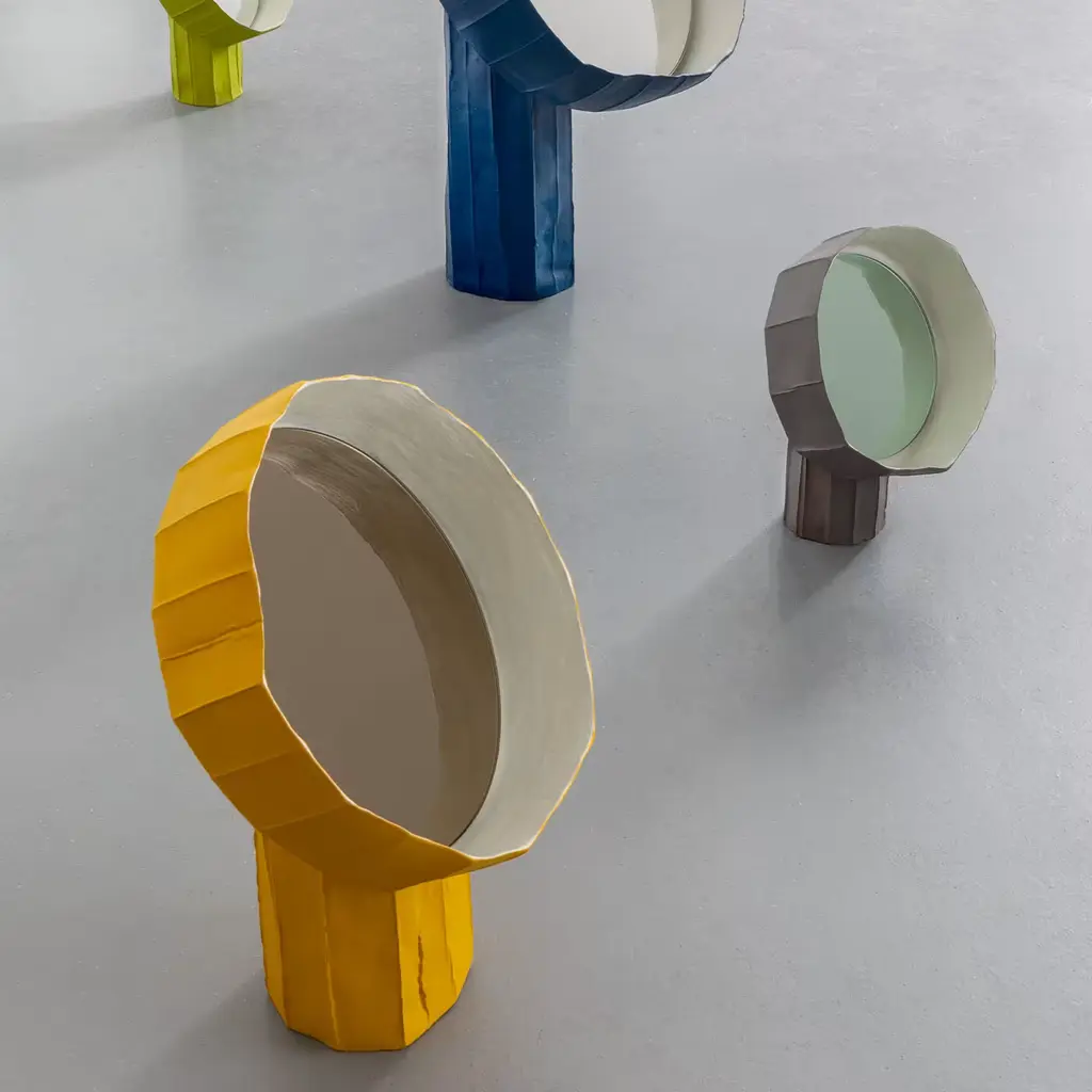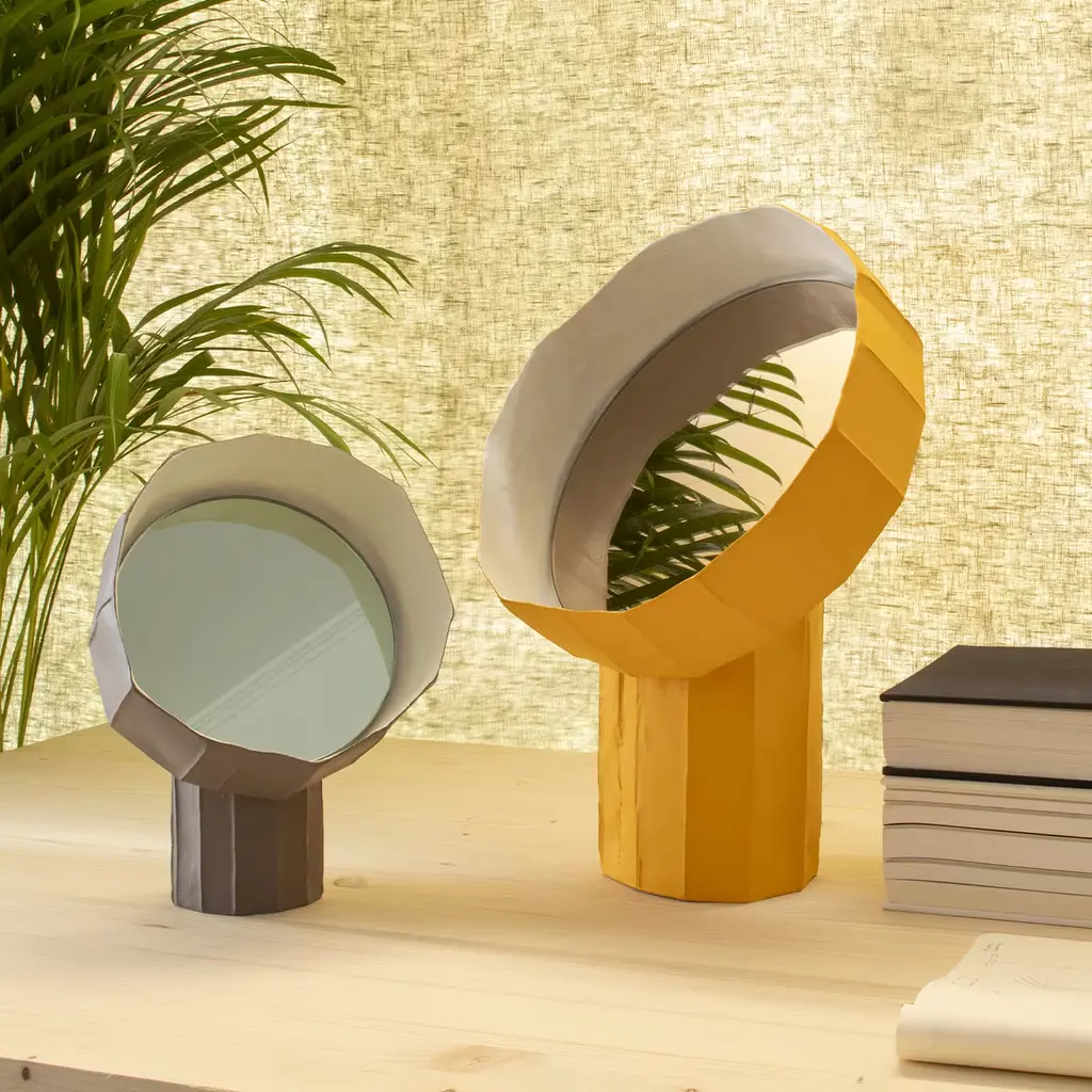 Compact and sculptural in its slightly faceted paper clay silhouette, this table mirror was designed by Paola Paronetto and Giovanni Botticelli with sunflowers in mind. Resulting meaningfully lifted for evoking a sunflower following the sun, the corolla-like element welcomes the mirrored glass insert. Every piece flaunts deliberate irregularities attesting to its precious artisan quality.