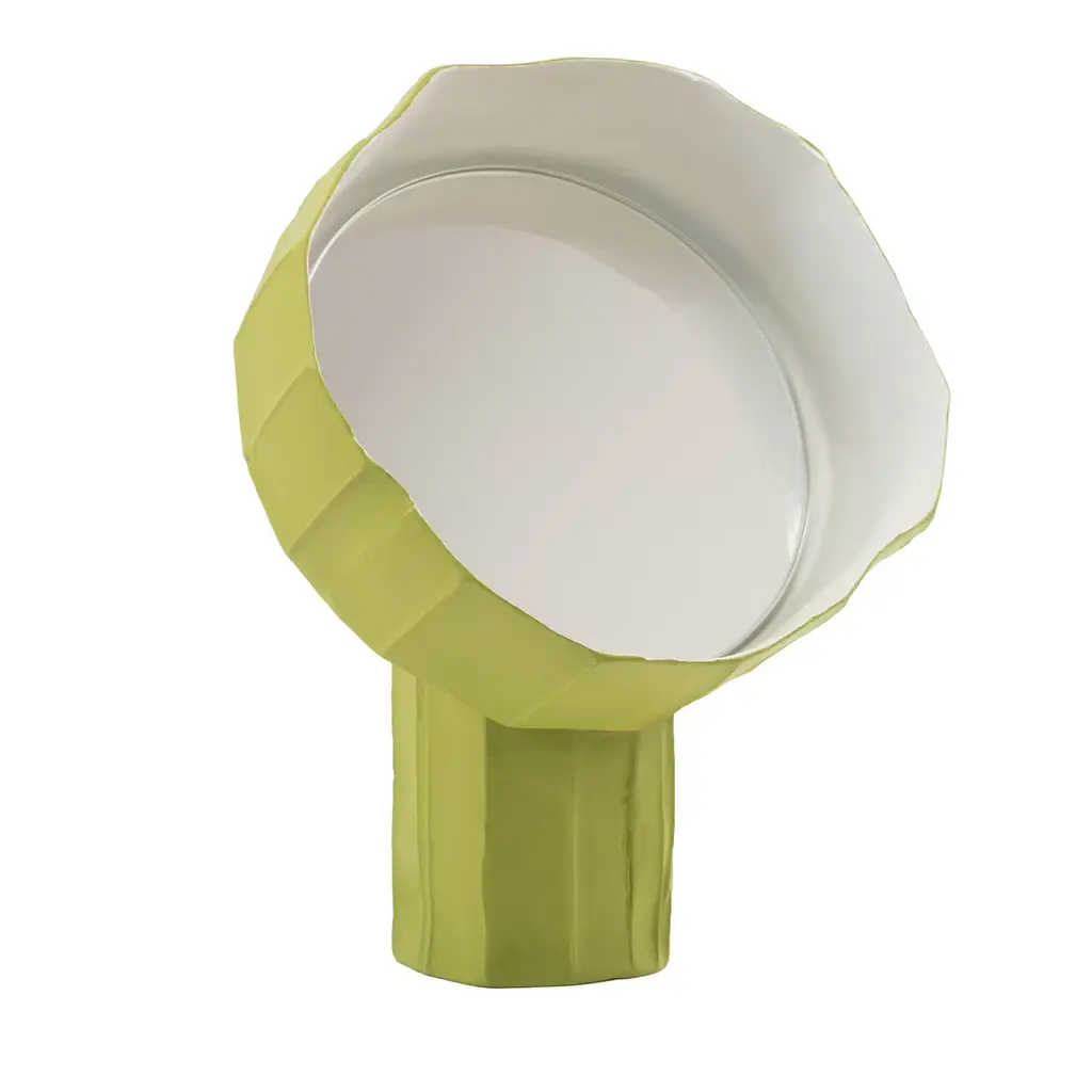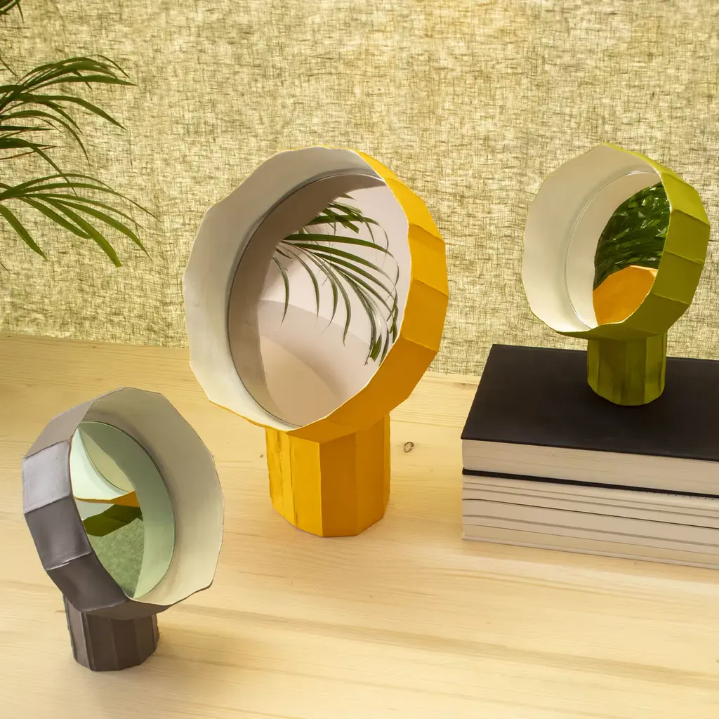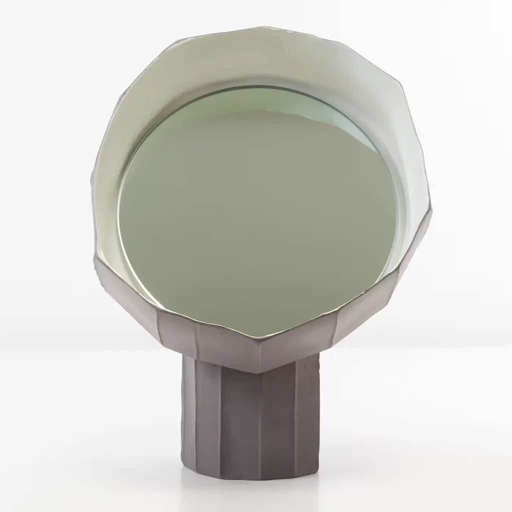 Compact and sculptural in its slightly faceted paper clay silhouette, this table mirror was designed by Paola Paronetto and Giovanni Botticelli with sunflowers in mind. Resulting meaningfully lifted for evoking a sunflower following the sun, the corolla-like element welcomes the mirrored glass insert. Every piece flaunts deliberate irregularities attesting to its precious artisan quality.