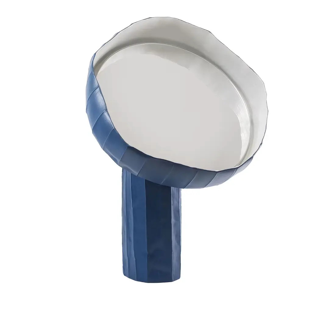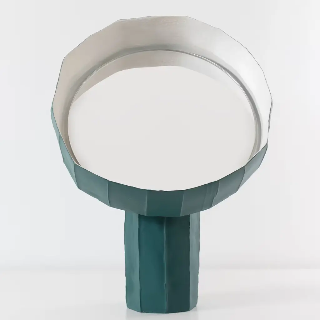 Fashioned of green-toned paper clay and indeed flaunting a pleasant tactile feel, this table mirror was inspired by sunflowers in its vaguely phytomorphic silhouette. Like sunflowers, the corolla-like element where the mirrored glass is nestled results in a slightly lifted as if it were haunting the sun. Pleasant in its subtly faceted and irregular texture, each piece is entirely unique.