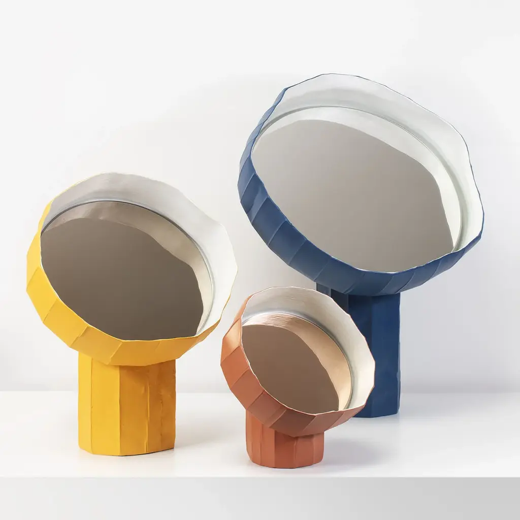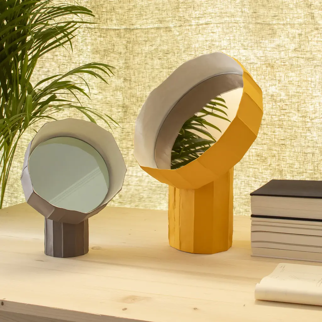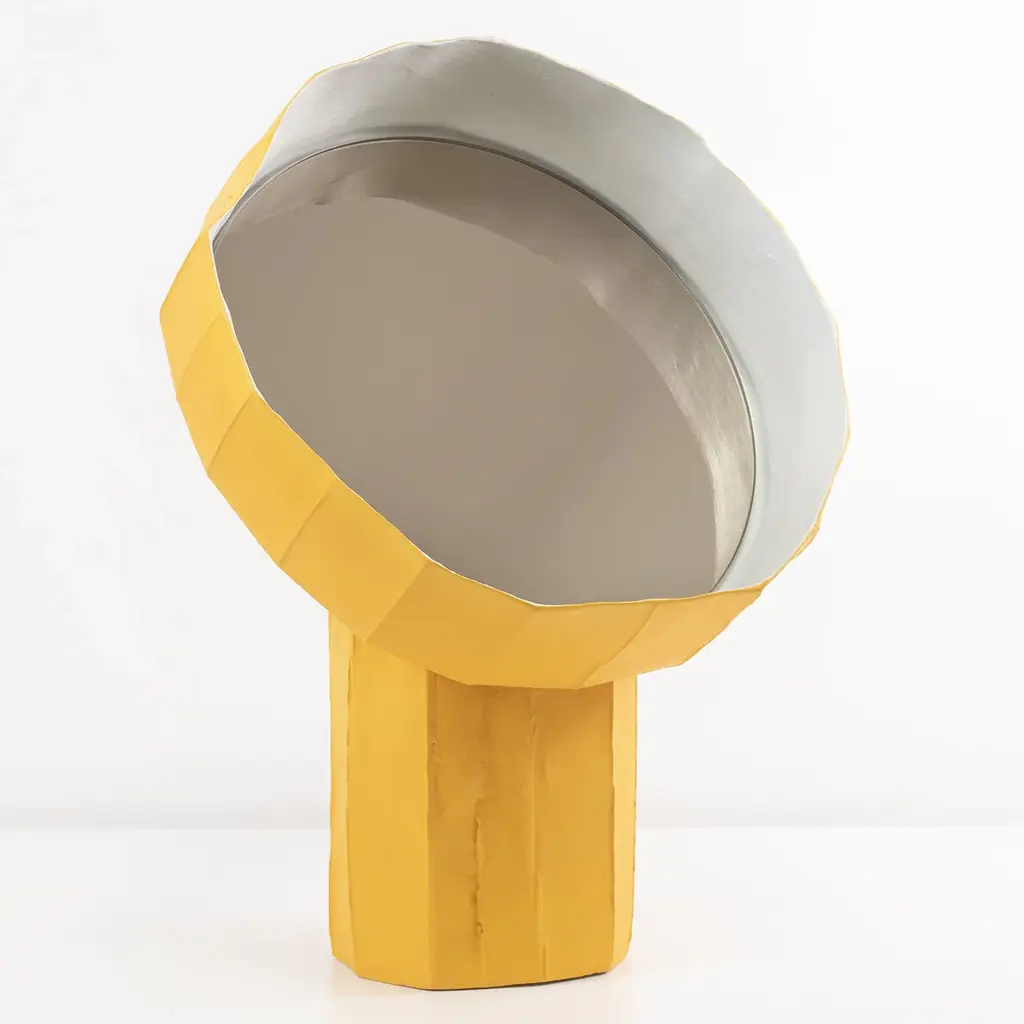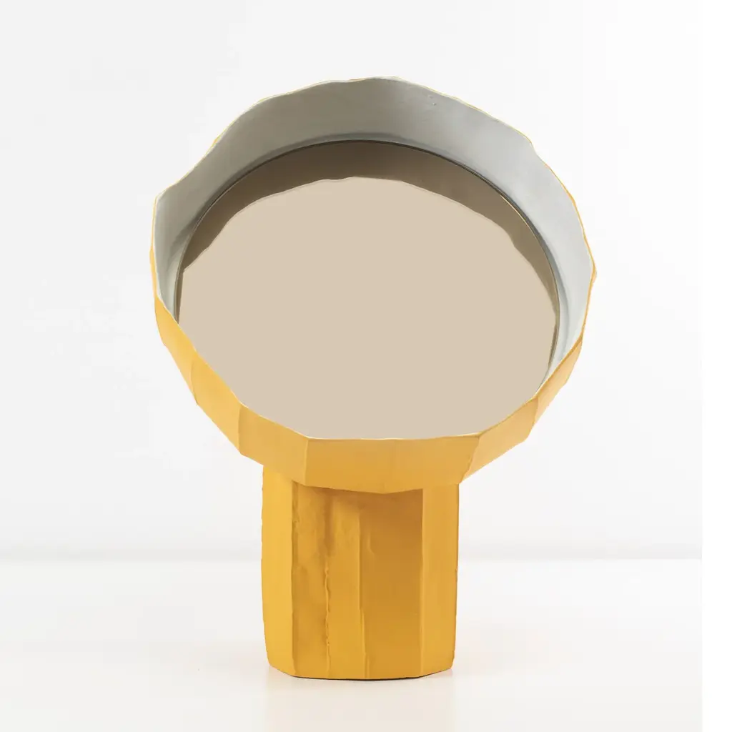Sunflowers and their curious nature-inspired Paola Paronetto and Giovanni Botticelli to design this singular yellow-painted table mirror. Distinguished by a subtly irregular and faceted texture obtained from the molding of paper clay, its sculptural flair is enhanced by the corolla-like element at the top where the mirrored glass is inserted. Multiple color variants can be explored in the Artemest catalog.