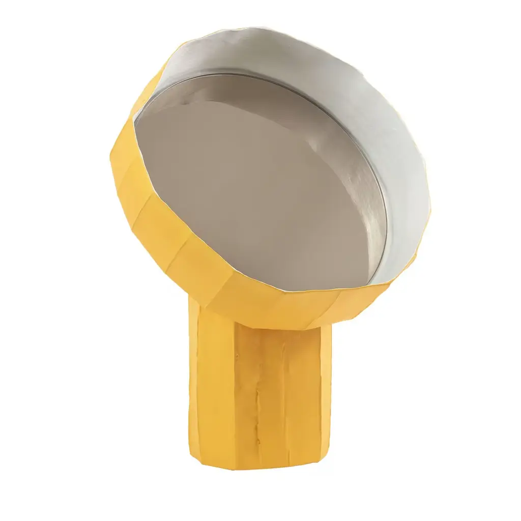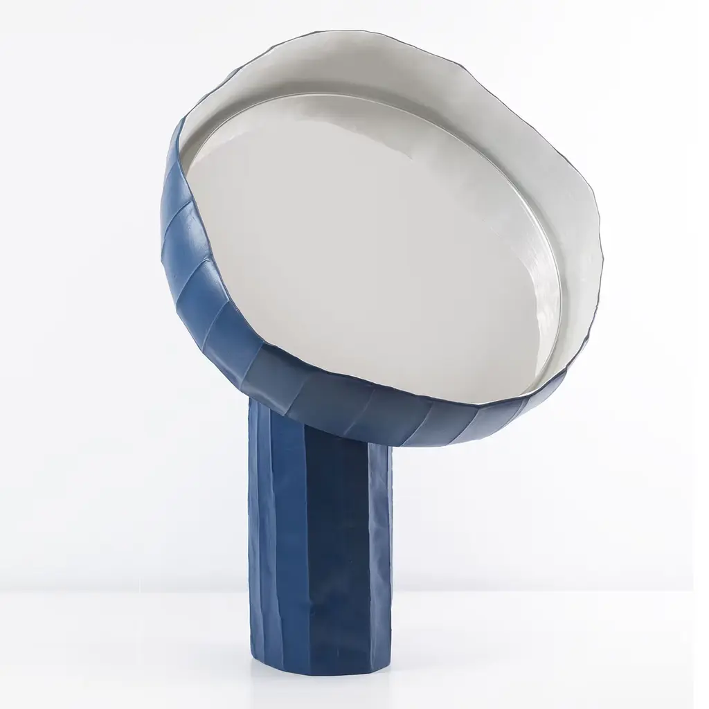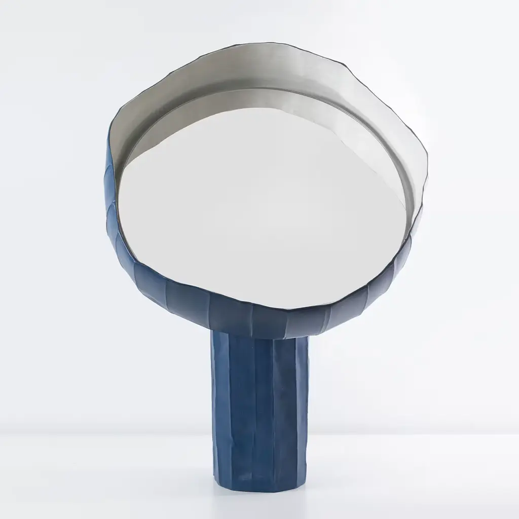Unmistakably contemporary in its irregular profiles and original combination of materials, this table mirror was designed by Paola Paronetto and Giovanni Botticelli with sunflowers in mind. A subtly faceted texture marks the blue paper clay structure, which features a mirrored glass insert nestled in its corolla-like element. Sculptural and decorative, each piece is entirely unique.