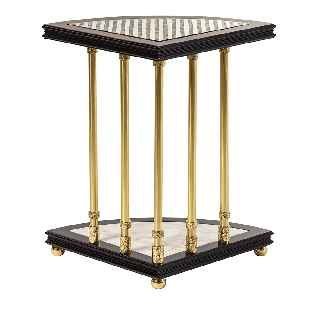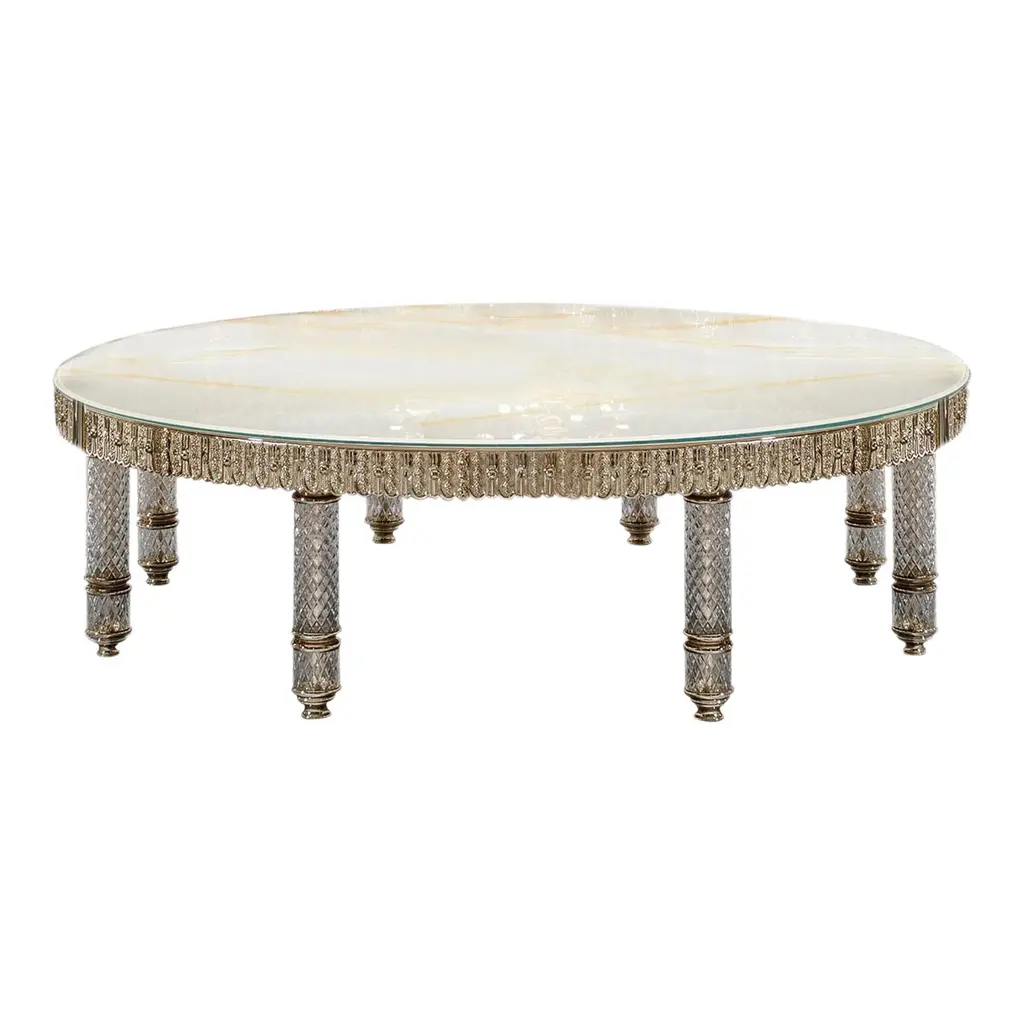 A marvelous representation of craftsmanship that adorns the most elegant and luxurious interiors, this splendid coffee table is made of white erable wood and enriched with details in 24-carat gold-plated bronze and crystal. The top is covered in glass, and the sides are enhanced with antique mirror decorations. The legs are made of crystal, adding a touch of refinement and luminosity. This item will be a standout piece in a classic decor, bringing timeless elegance to any space.