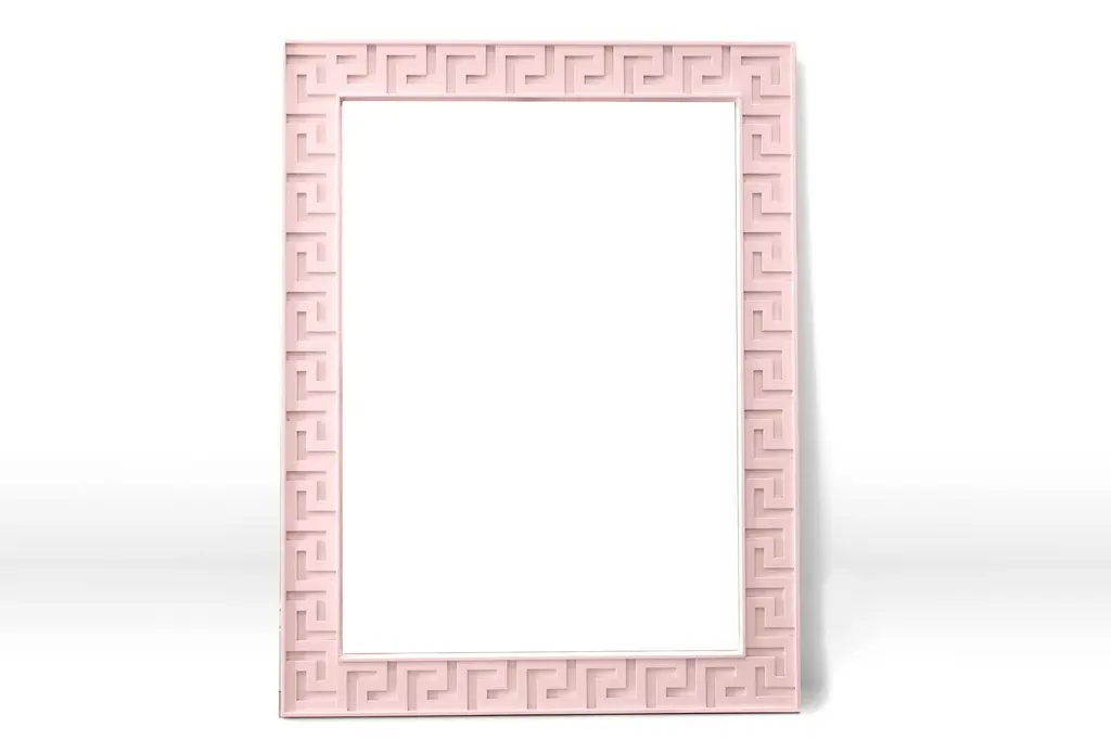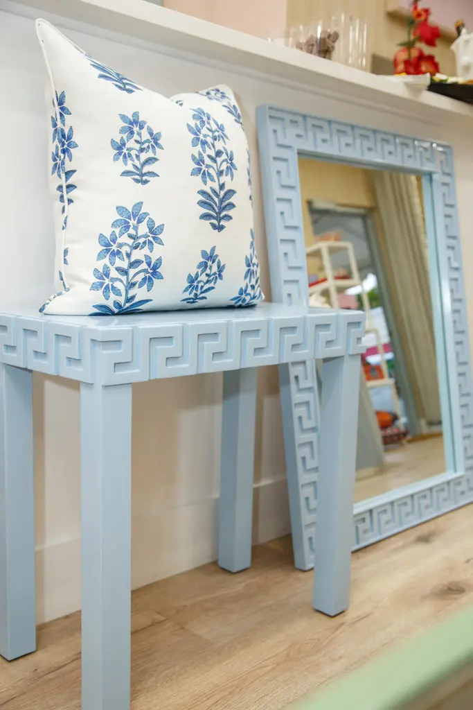 Our stunning modern interpretation of a classic Greek Key mirror. This eye-catching mirror is the result of our collaboration with interior designer, Karen Solomon of KS Palm Design in Palm Beach. We build this in-house with loving attention to detail. The geometric simplicity and symbolic depth of this design make it a versatile choice for those seeking to add a touch of sophistication to their surroundings. We have a corresponding console and end table/stool available. Example shown in Ben Moore’s Pink Moire and Farrow & Ball's Pale Powder. We can do any color. Just reach out to us using Chairish's messaging platform.