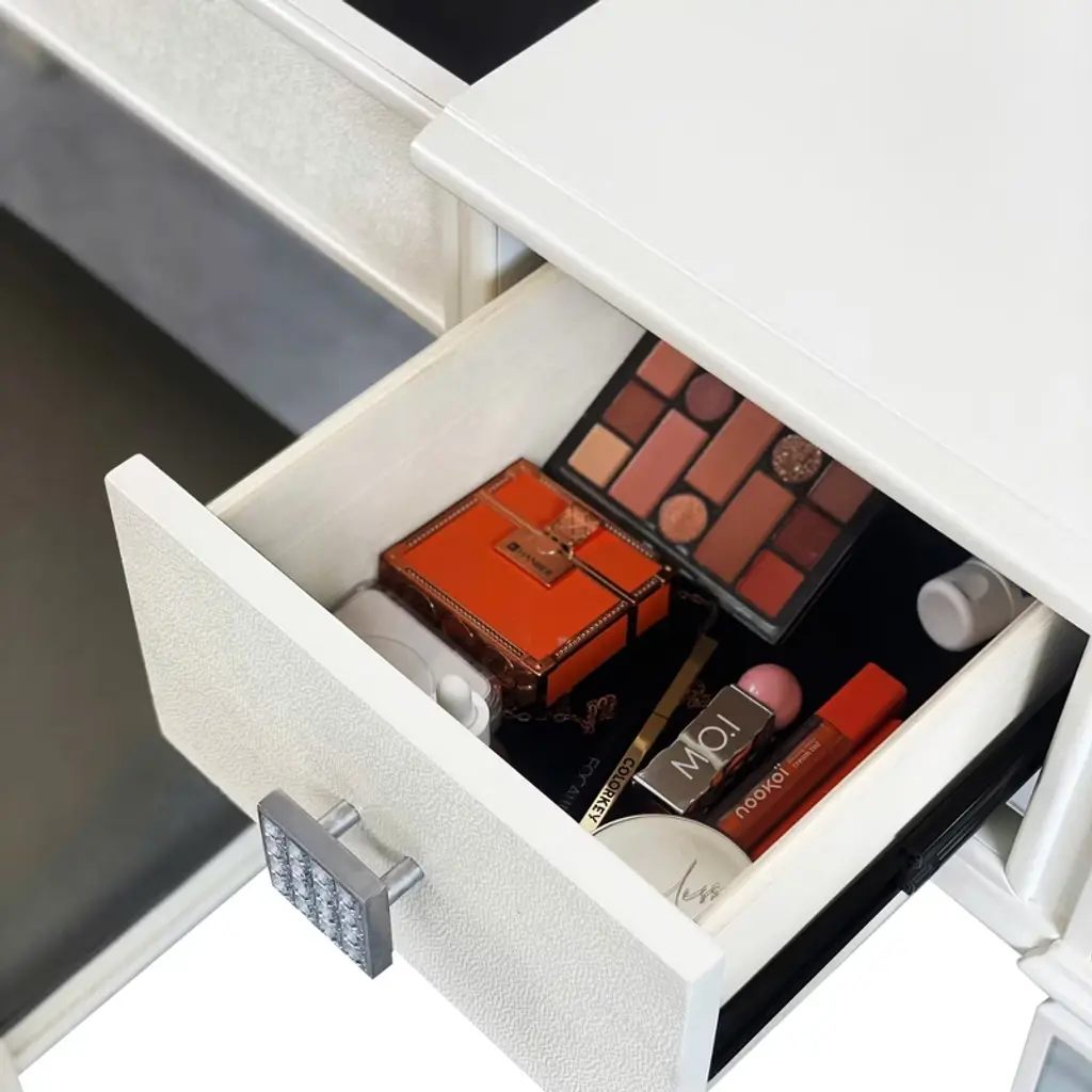 This all-in-one vanity set blends traditional charm with modern accents, serving as both a stunning makeup table and a practical working desk. It boosts storage for cosmetics, grooming tools, and personal items¡ªkeeping essentials organized and out of kids¡¯ reach. The crystal knobs and mirror legs add elegance, while the backless stool with skin-friendly PU offers comfortable seating. It¡¯s easy to assemble, helping you upgrade your bedroom with a focus on self-care.