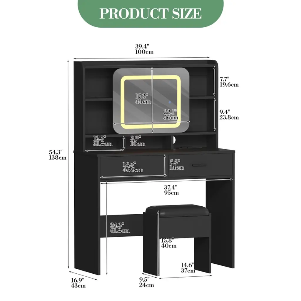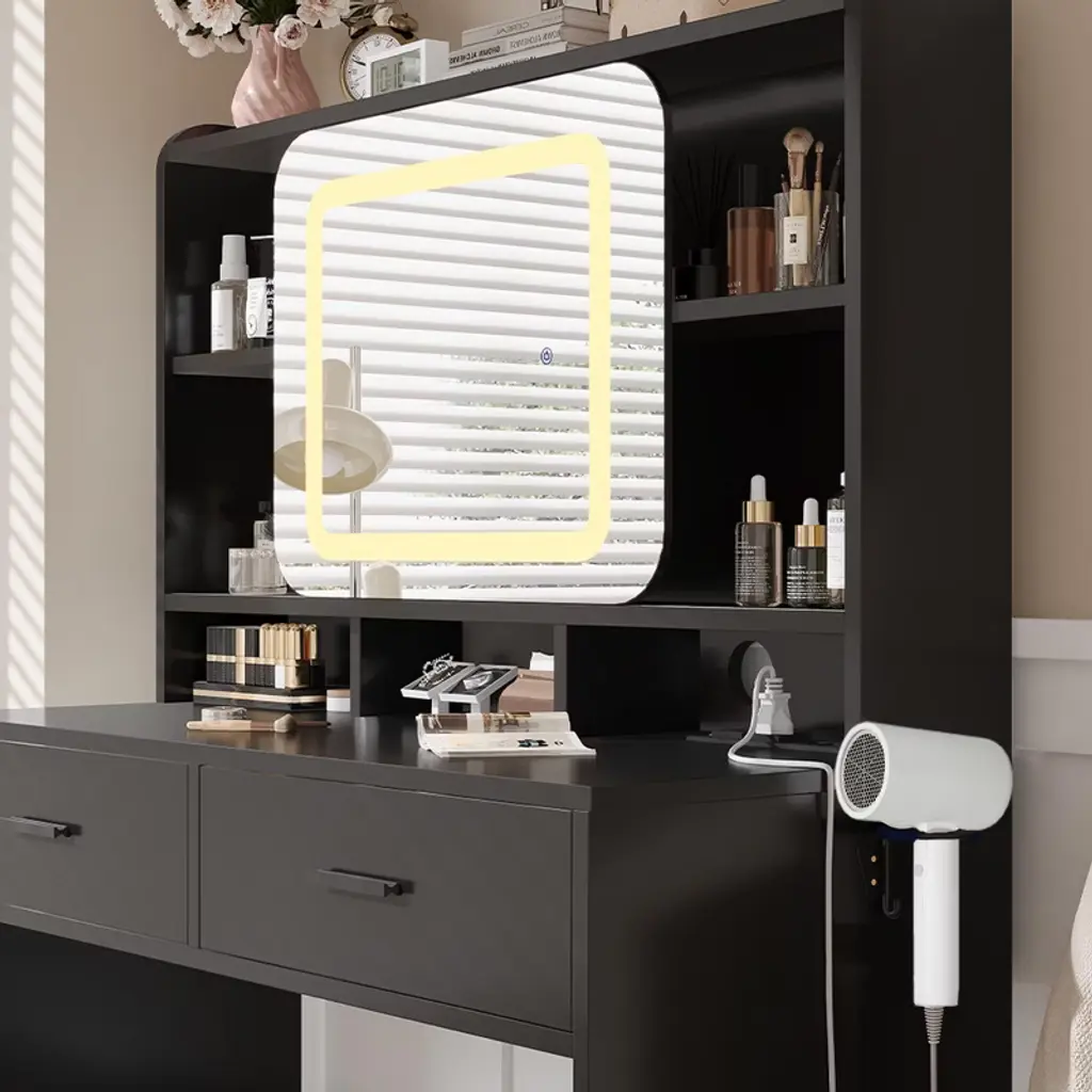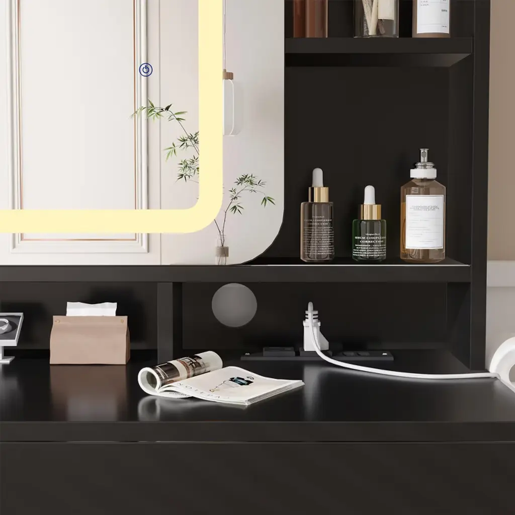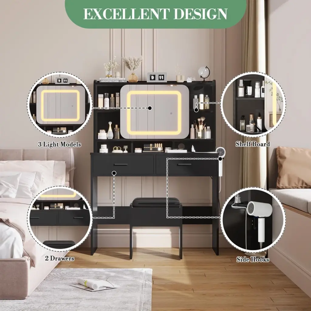 Elevate your daily making up environment with our vanity set that combines elegance, smart LED lighted mirror, and practical storage—enjoy an organized beauty center where you can shine every single day! Highlights at a Glance -LED Mirror Designed to Enhance Your Beauty -Seamless Charging Station for Dressing Space -Elegant Vanity Table: Elevate Your Makeup Experience -Spacious Storage: Keep All Your Beauty Essentials Organized -Enhanced Vanity Stability You Can Trust
