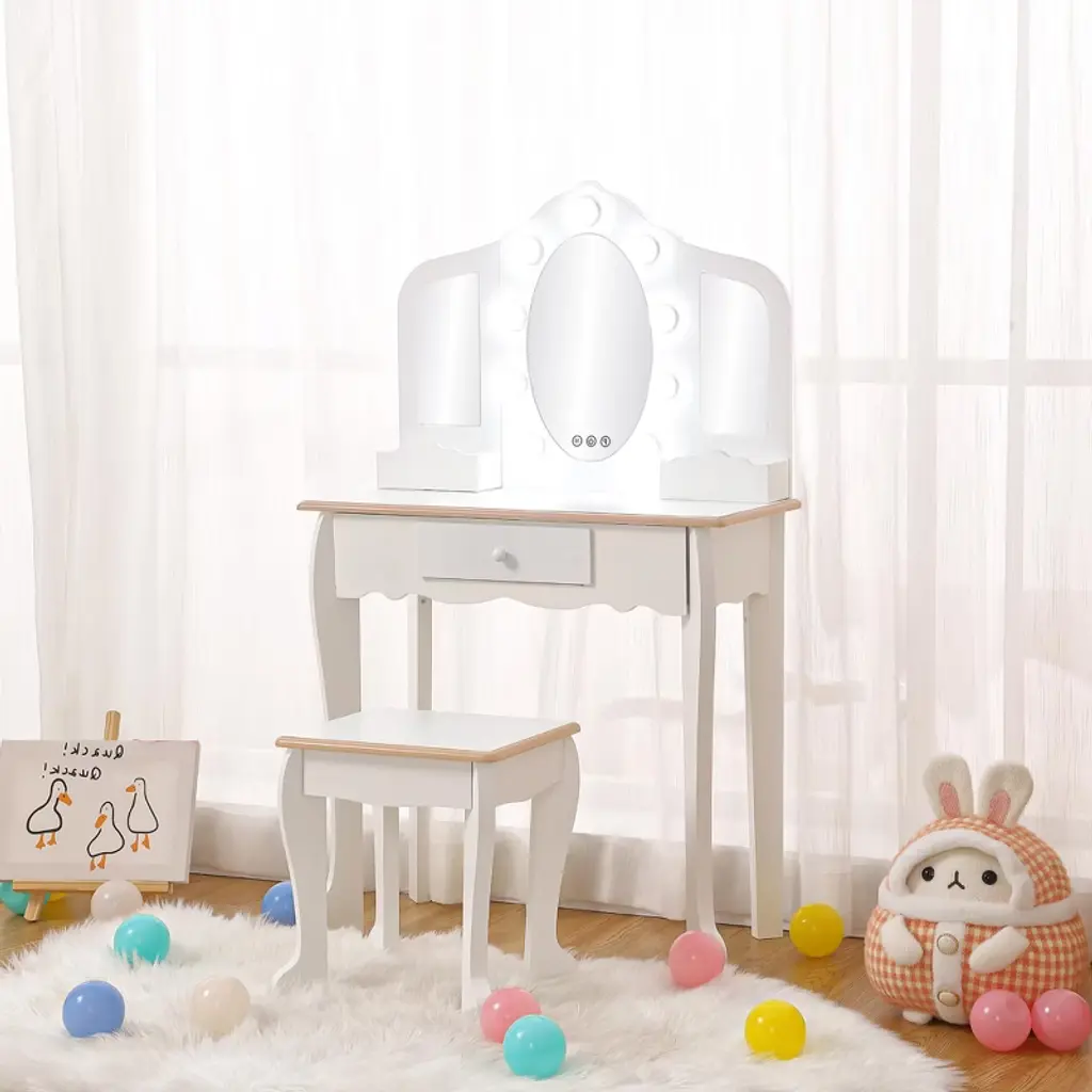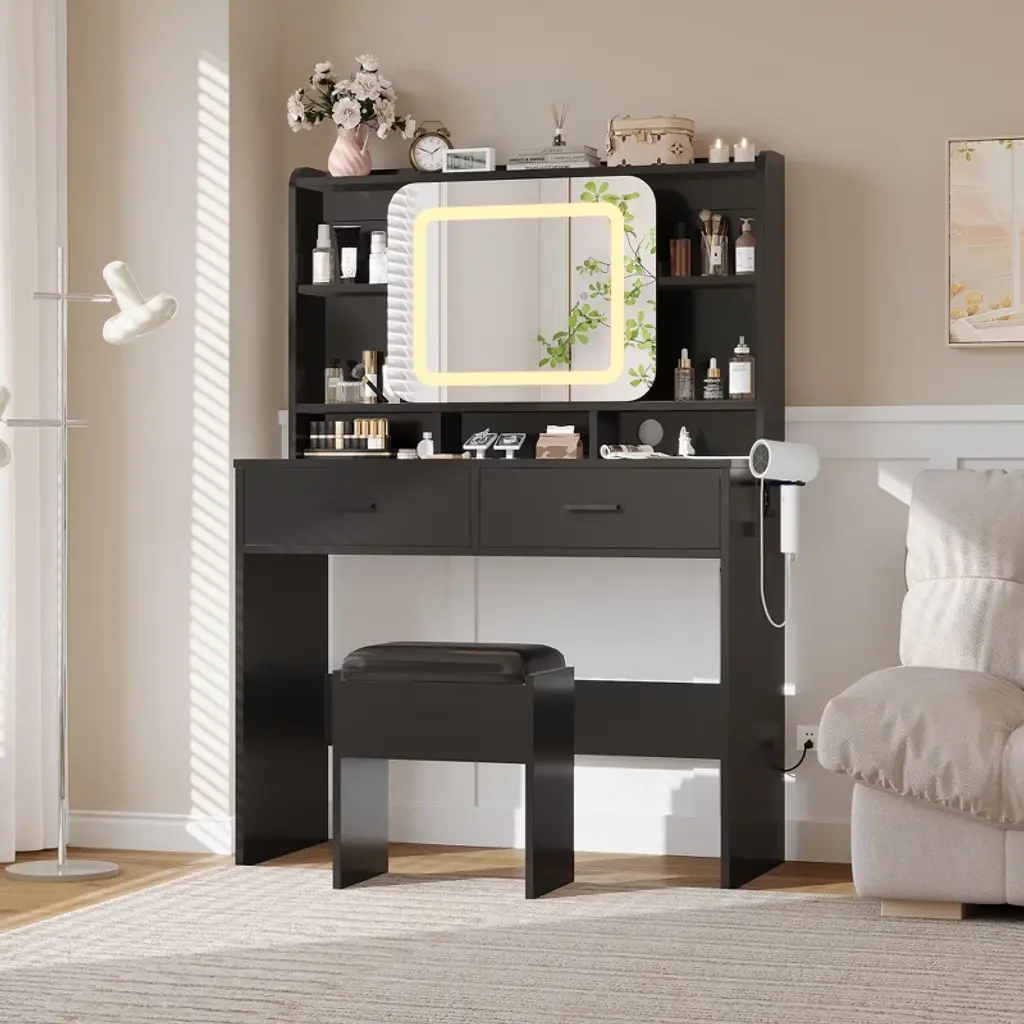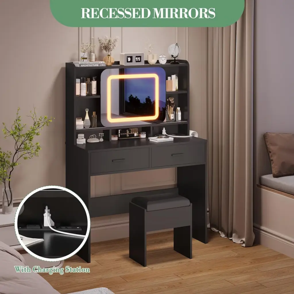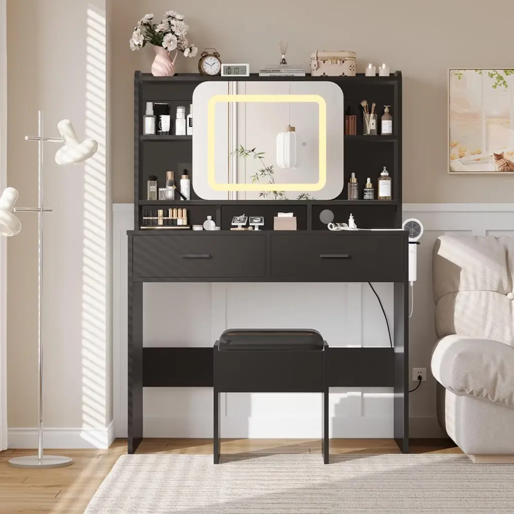 Elevate your daily making up environment with our vanity set that combines elegance, smart LED lighted mirror, and practical storage—enjoy an organized beauty center where you can shine every single day! Highlights at a Glance -LED Mirror Designed to Enhance Your Beauty -Seamless Charging Station for Dressing Space -Elegant Vanity Table: Elevate Your Makeup Experience -Spacious Storage: Keep All Your Beauty Essentials Organized -Enhanced Vanity Stability You Can Trust