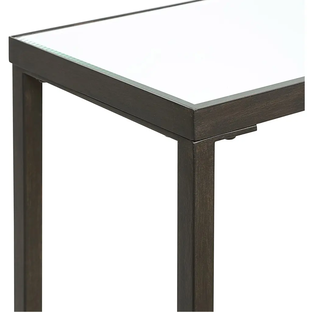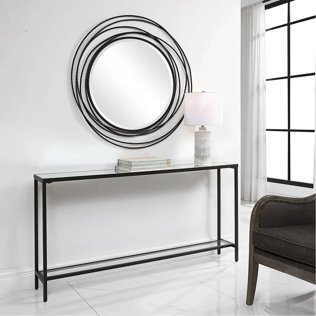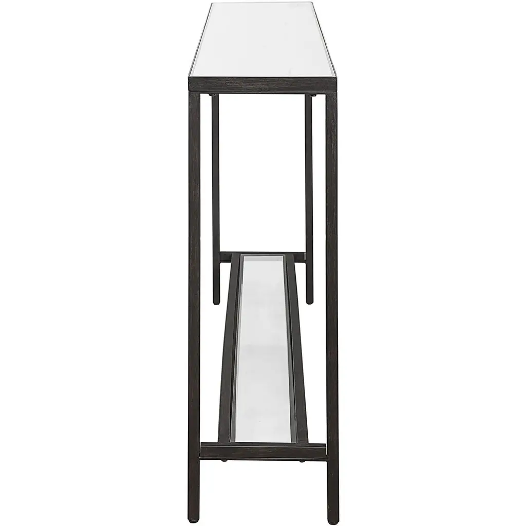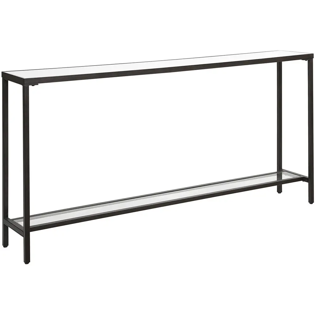 Classic And Minimalistic, This Narrow Console Table In Steel Is Finished With A Streamlined Matte Black, Inset With A Beveled Mirrored Top, And Gallery Shelf In Clear Glass.