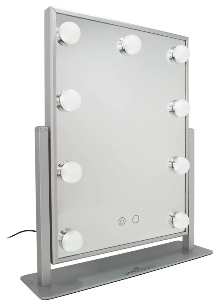 Impressions Vanity Bijou LED Hand Mirror comes with a Charging Base. the brightness of the led makeup mirror''s lighting is amazing. The additional small mirror that is attached to the mirror for a desk for magnifying is awesome. You will love the fact that the magnifying mirror includes a USB charging cable. The sleek elegant look makes it OK to set out on display. This mirror with lights would be a great gift for your beloved person. The handle features two rows of our diamond-style design. Easily rechargeable by placing the mirror in its color-matching charging base.Features:HOLLYWOOD STYLE MIRROR: The Hollywood table makeup mirror has 9 dimmer clear Hollywood-style LED bulbs around the mirror that create the perfect studio quality environmentADJUSTABLE BRIGHTNESS: This lighted mirror comes with a soft-touch sensor dimmer switch. To turn the mirror on or off, press and hold the sensor to adjust the brightnessSTANDING BASE: This tabletop mirror has a beautiful and elegant adjustable frame around the mirror that can be placed on any vanity table. You can tilt the mirror completely and adjust it comfortable angleCHARGING PORTS: This beautiful dressing mirror has a USB power outlet behind the back with easy to insert cable for charging your device just plug into any standard USB outlet to power up