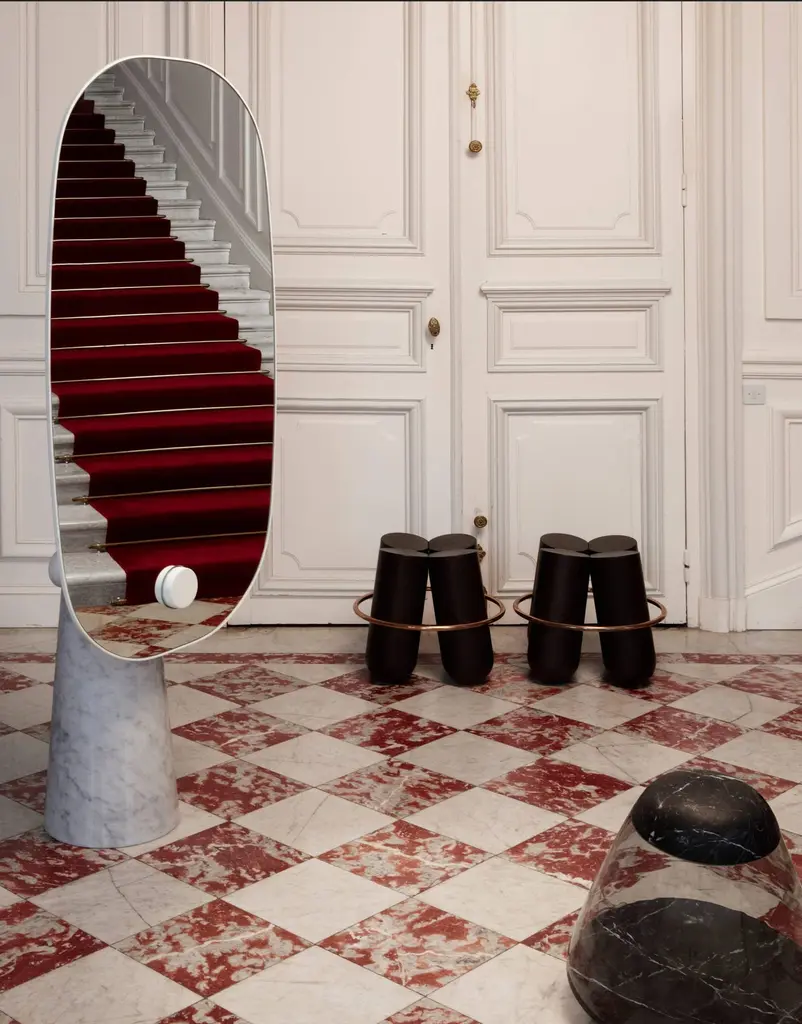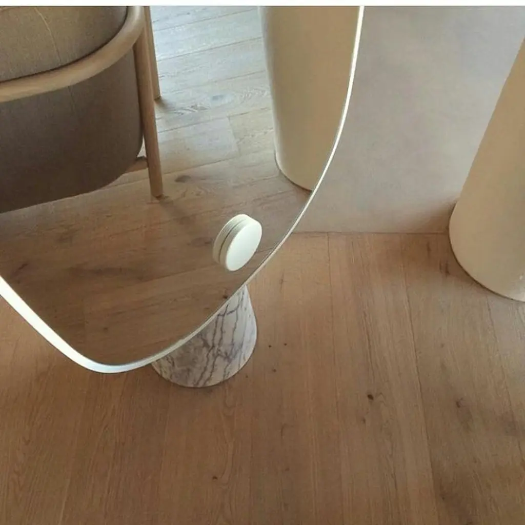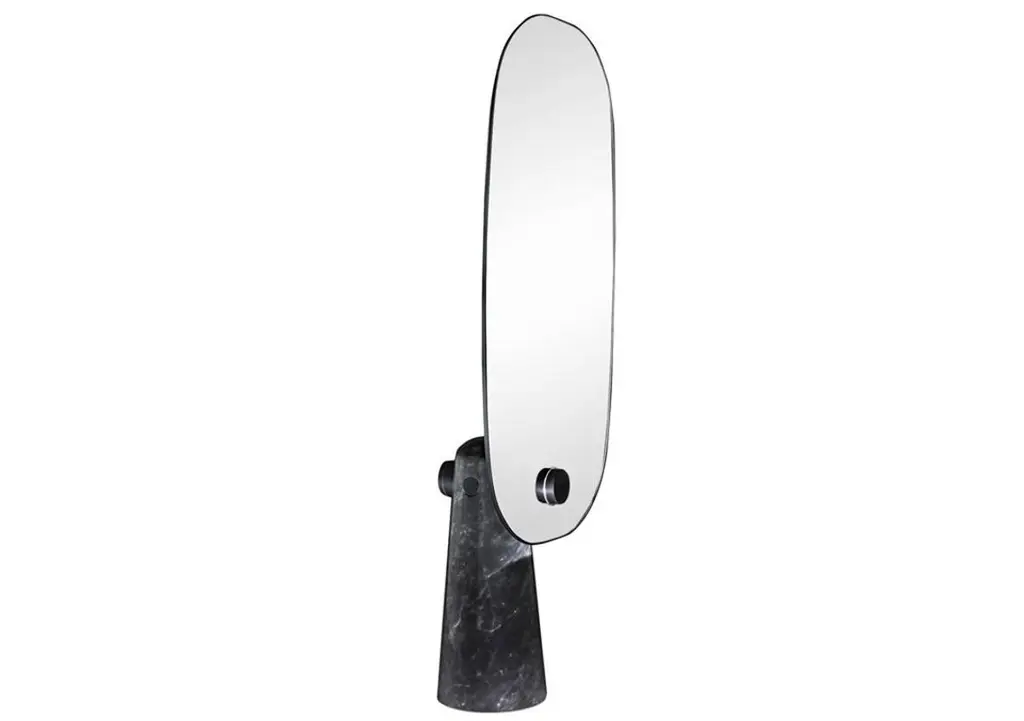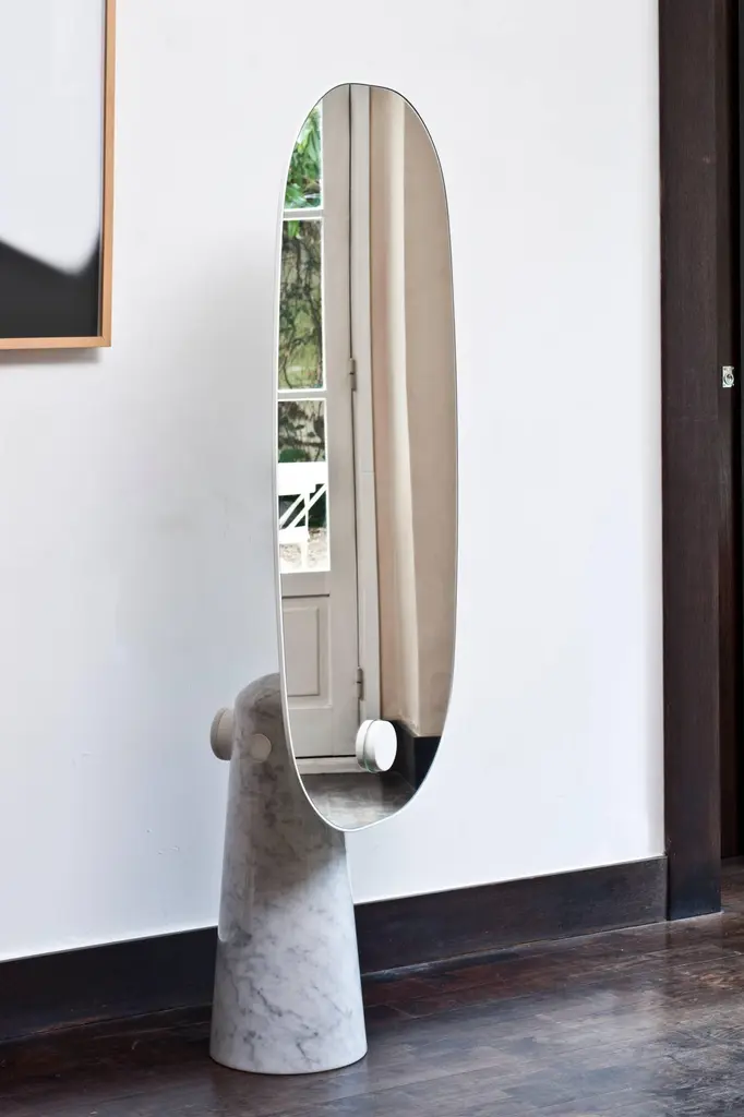 Iconic is a mirror that stands as a statue. The wood pedestal contrasts with the thickness of the mirror it supports. The metal cylinder sealed to the base makes the structure literally cross the mirror.Dimensions, volume and weightHeight 72.8 inchesDiameter of the base 15 inchesWidth 29.5 inchesWeight: 154 lbs (oak base) or 176 lbs (marble base)Materials: Standing mirror with aluminium structure. Marble baseWhite Carrara marble base and white structureDan Yeffet is Israeli, Lucie Koldova is from the Czech Republic. They met whilst collaborating with designer Arik Levi and began to work together in 2010. Since then, their creations have been shown in various galleries in Paris, New York, and Prague.