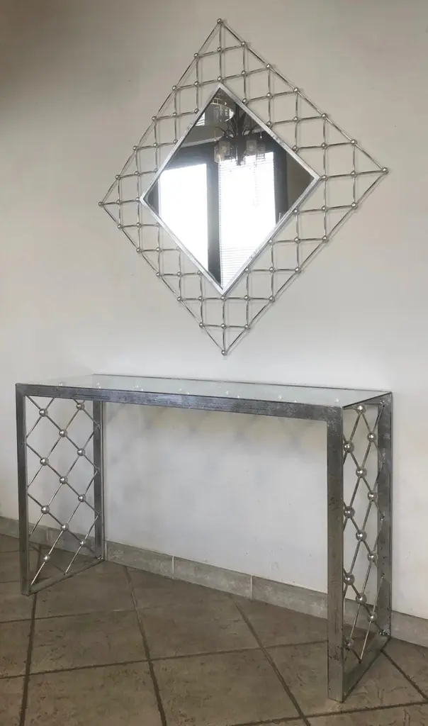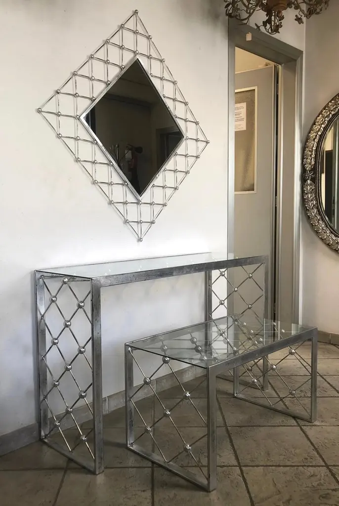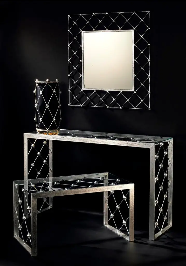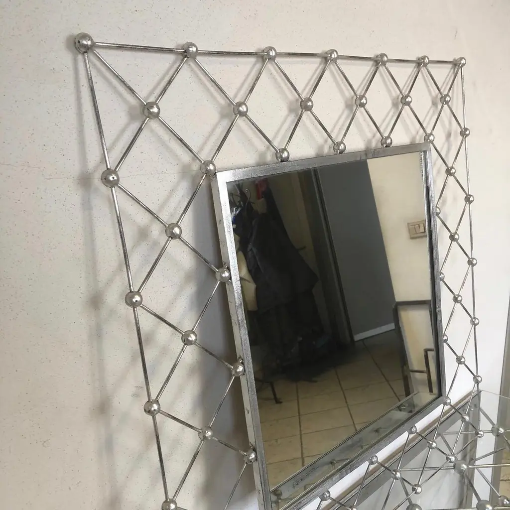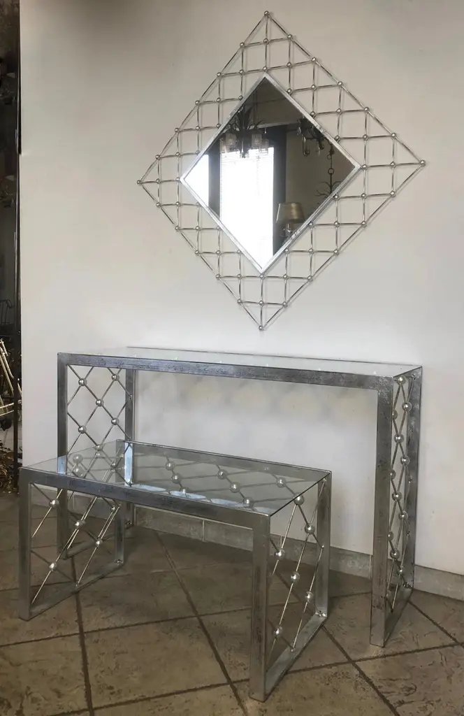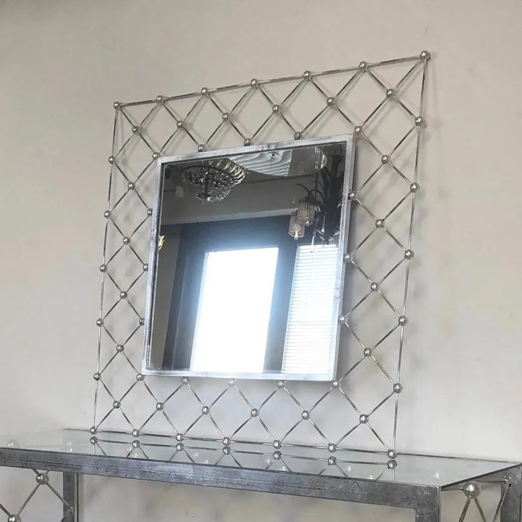 Very stylish contemporary brushed wrought iron lattice mirror, entirely handmade in Italy, the interlaced frame consisting of a well crafted trellis openwork decorated with metal balls at the intersections to enrich the tracery.Can be accompanied by its matching coffee / sofa table or matching console, item LU911219639422, as per image.