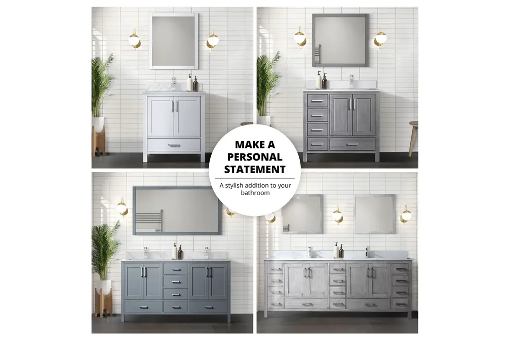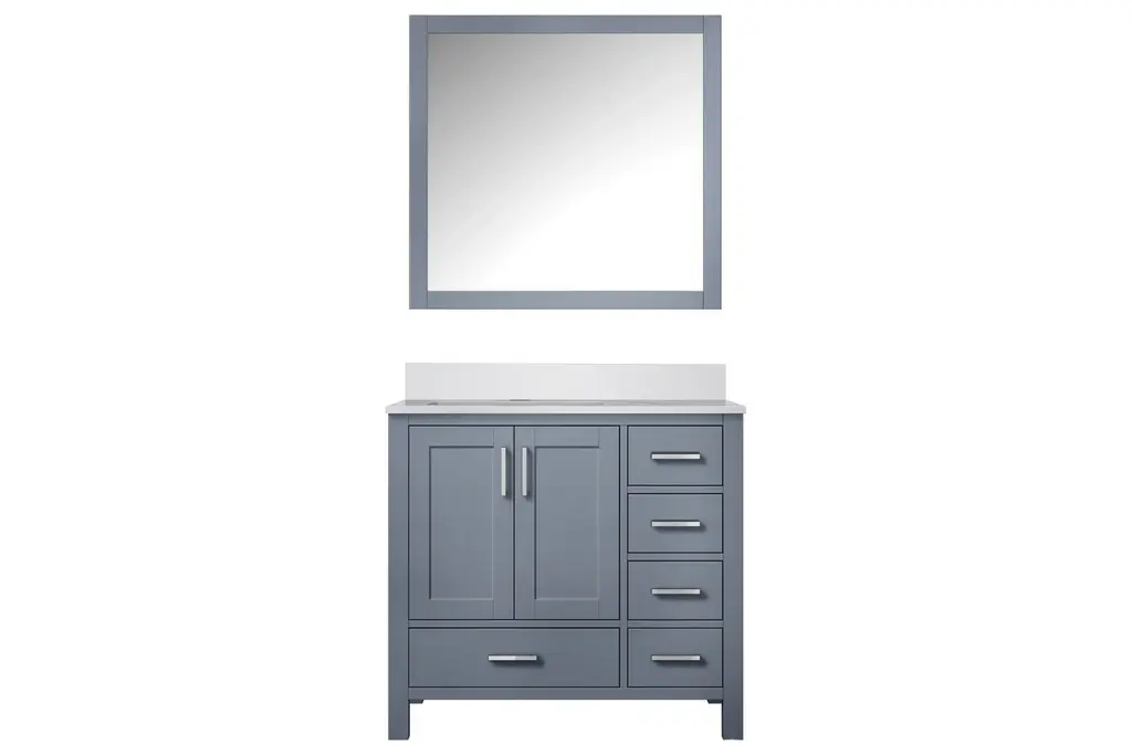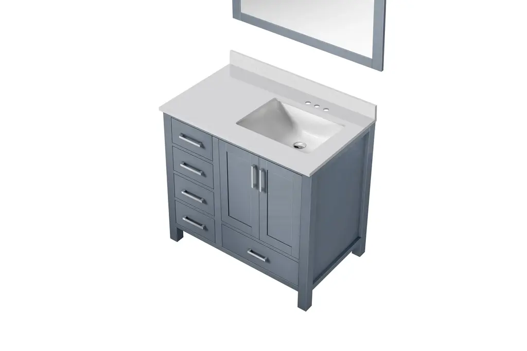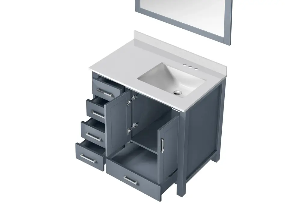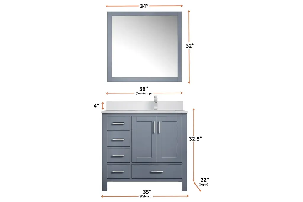 The Jacques vanity collection is the perfect addition to any modern bathroom, providing plenty of storage space as well as a functional design that meets your everyday needs. Available in superb color choices which include neutral and warm tones such as white, dark grey, distressed grey or navy blue, with Carrara Marble or White Quartz countertops, this bath cabinet enjoys a convenient single-hole faucet spread for a user-friendly installation. The multiple drawers and large cabinet storage hold your day-to-day accessories, towels, cosmetics, while the classic mid-century design fits nicely with any type of bathroom decor.A nicely crafted piece that will stand out with beautiful finishes which include unique rectangular chrome handles, a generous countertop surface and high-end materials designed to withstand the test of time! Perfect addition to any modern bathroom, providing plenty of storage space as well as a functional design that meets your everyday needsSingle sink vanity with under sink storage and five drawersComes with vanity cabinet, top, and mirrorTransitional freestanding vanity perfect for a small bathroomSolid wood frame with E0 plywood panelsDark Grey finishCultured Marble countertop included. Backsplash not included.Vanity countertop has a scratch and stain resistant surface for lasting durabilityVanity countertop is pre-drilled for a single hole faucet for easy installationFaucet not includedIncludes one undermounted rectangular sinkIncluded mirror is 34 in. W x 32 in. HOne interior cabinet and five drawers provide plenty of storage spaceCabinet dimensions are 35 in. W x 21.5 in D x 33.25 in. H. Full set dimensions are 36 in. W x 22 in. D x 34 in. H.Fully assembled vanity cabinet for quick and easy installationSleek bathroom vanity available in a variety of finishes, including White, Dark Grey, Green, Distressed Grey and Navy Blue, with chrome hardware includedAvailable sizes are 30 in, 36 in, 48 in, 60 in, 72 in, 80 in and 84 inChrome hardware included?Five spacious full extension drawers for easy access to productsConcealed adjustable hinges offer a sleek look and the ability to easily align doorsIdeal for both residential and commercial useCUPCus certifiedIncludes a 1 year limited manufacturer�s warranty