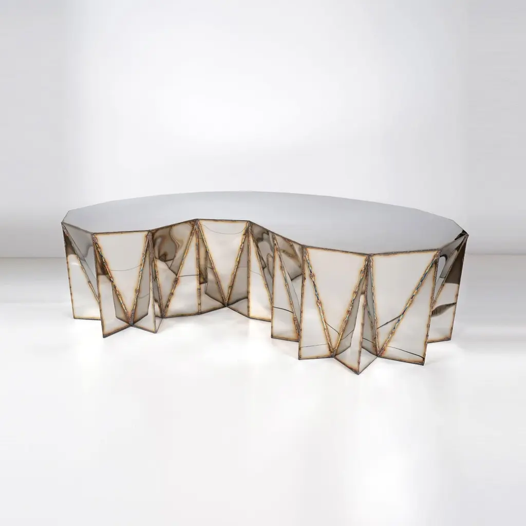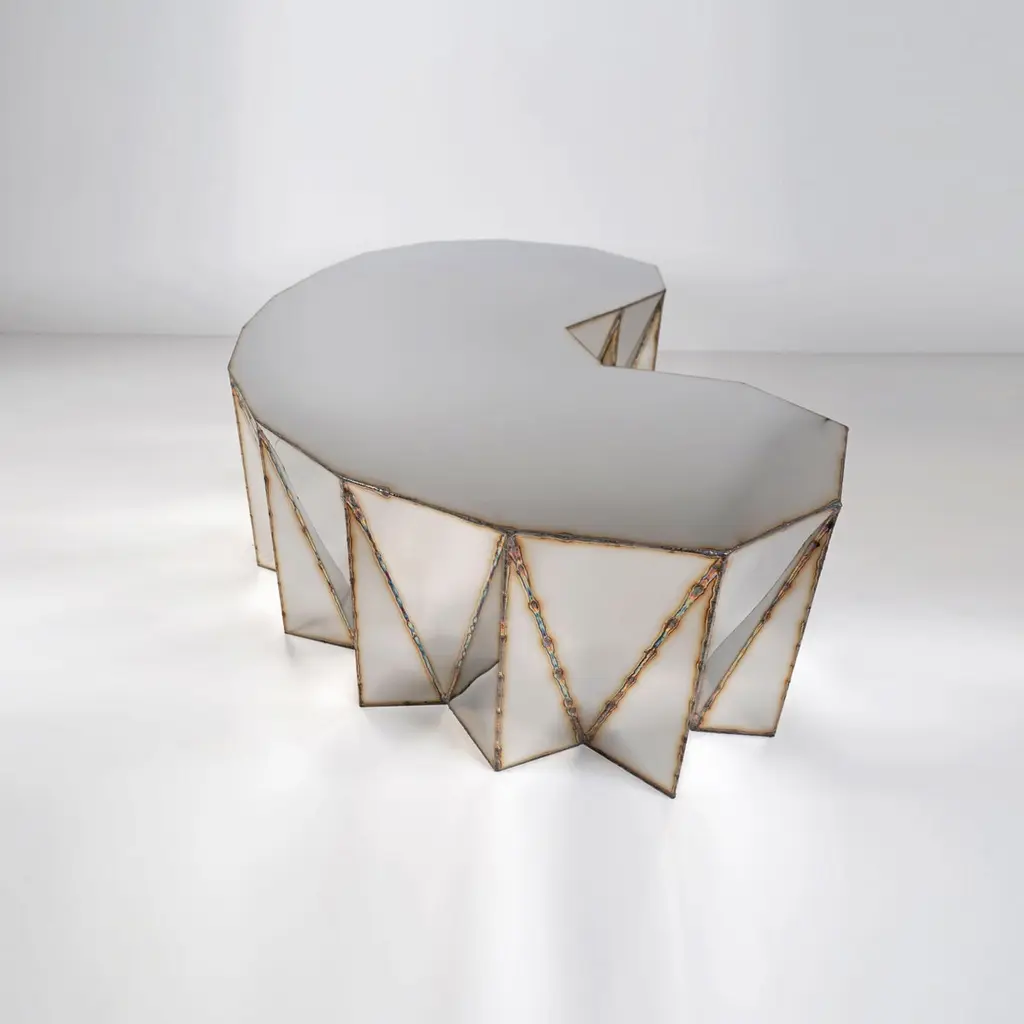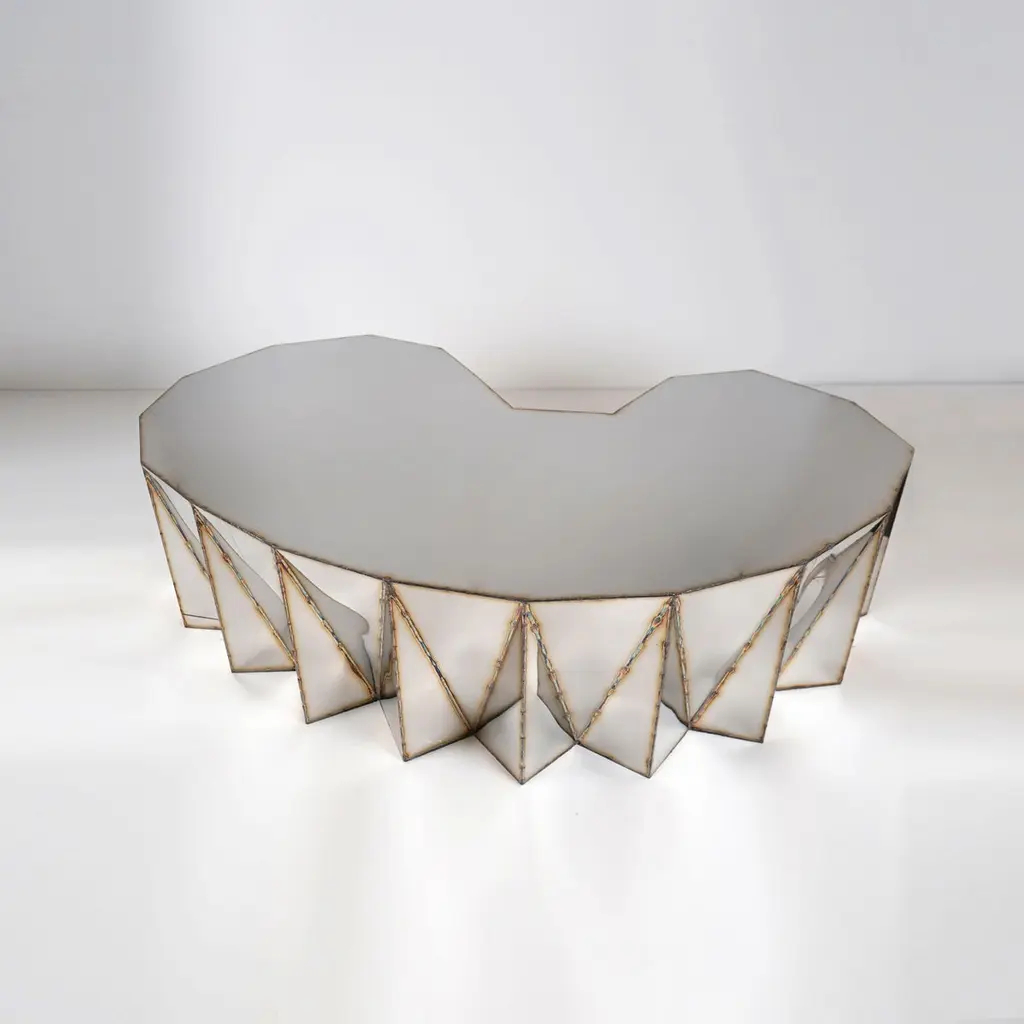 Jagged Edge Kidney Table in Mirror-Polished Stainless Steel by Julian MayorLimited Edition of 5 + 2AP.Dimensions: D 96 x W 154 x H 40 cm. Materials: Mirror-polished stainless steel.Julian Mayor is a British artist and designer renowned for his sculptural works crafted from welded sheet metal. Using high-tech design processes, the artist creates each piece digitally on a computer before building it by hand in his workshop. Born in 1976, Mayor graduated with a BA in Industrial Design from the University of Northumbria in 1998, followed by an MA from the Royal College of Art in Design Products under Ron Arad. After graduating in 2000, he moved to Northern California and worked for a design consultant agency as a product and interior designer. By 2004, Mayor returned to London to work for UK-based agencies, including Pentagram, and collaborated with British designer Tom Dixon. The artist’s work has been exhibited at the Victoria & Albert Museum, London, the Museum of Arts and Design, New York, MUDAC Lausanne, Switzerland, and the Yorkshire Sculpture Park, UK. He has installed a permanent series of sculptural benches in a park behind the Tate Britain in Pimlico, London. Mayor lives and works in Doncaster, South Yorkshire, UK.