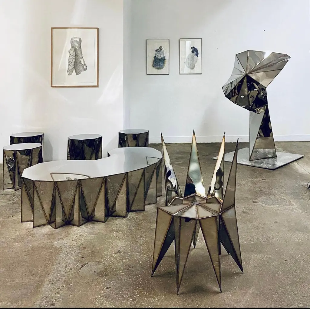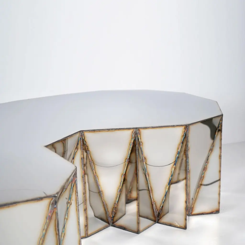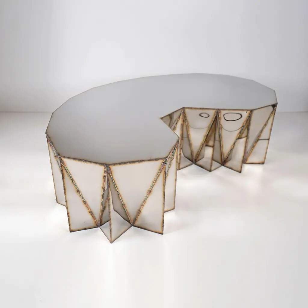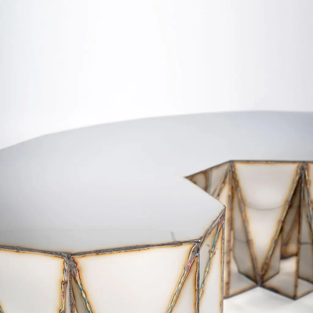 Jagged Edge Kidney Table in Mirror-Polished Stainless Steel by Julian MayorLimited Edition of 5 + 2AP.Dimensions: D 96 x W 154 x H 40 cm. Materials: Mirror-polished stainless steel.Julian Mayor is a British artist and designer renowned for his sculptural works crafted from welded sheet metal. Using high-tech design processes, the artist creates each piece digitally on a computer before building it by hand in his workshop. Born in 1976, Mayor graduated with a BA in Industrial Design from the University of Northumbria in 1998, followed by an MA from the Royal College of Art in Design Products under Ron Arad. After graduating in 2000, he moved to Northern California and worked for a design consultant agency as a product and interior designer. By 2004, Mayor returned to London to work for UK-based agencies, including Pentagram, and collaborated with British designer Tom Dixon. The artist’s work has been exhibited at the Victoria & Albert Museum, London, the Museum of Arts and Design, New York, MUDAC Lausanne, Switzerland, and the Yorkshire Sculpture Park, UK. He has installed a permanent series of sculptural benches in a park behind the Tate Britain in Pimlico, London. Mayor lives and works in Doncaster, South Yorkshire, UK.