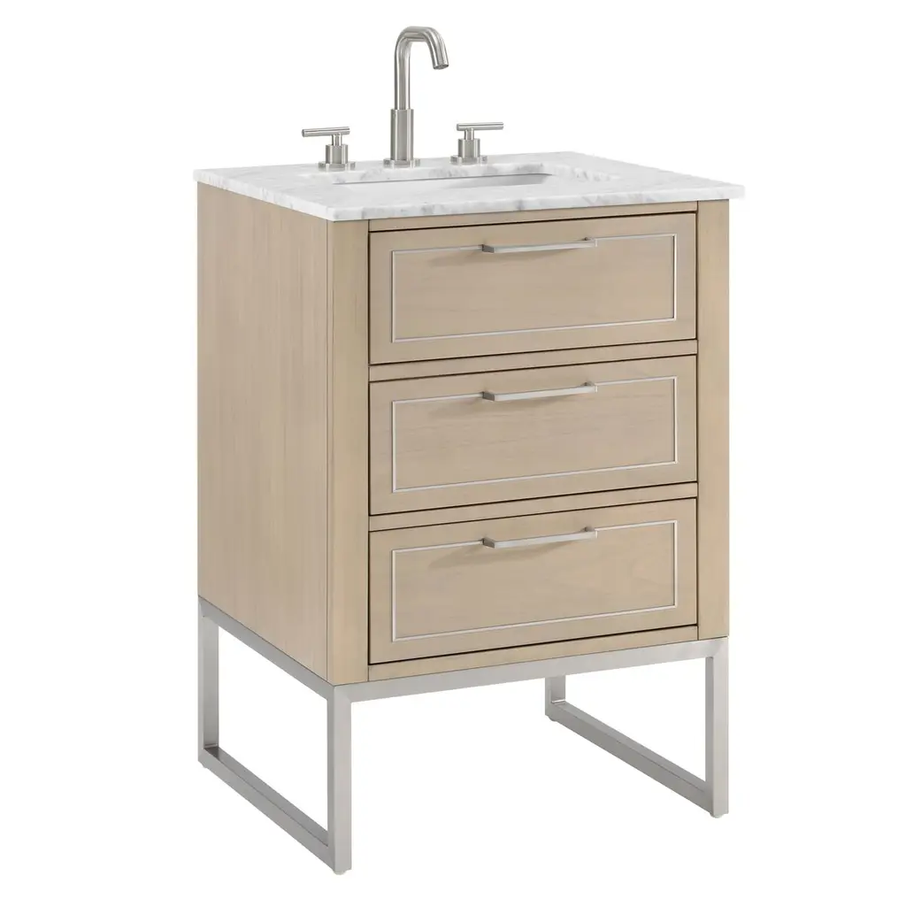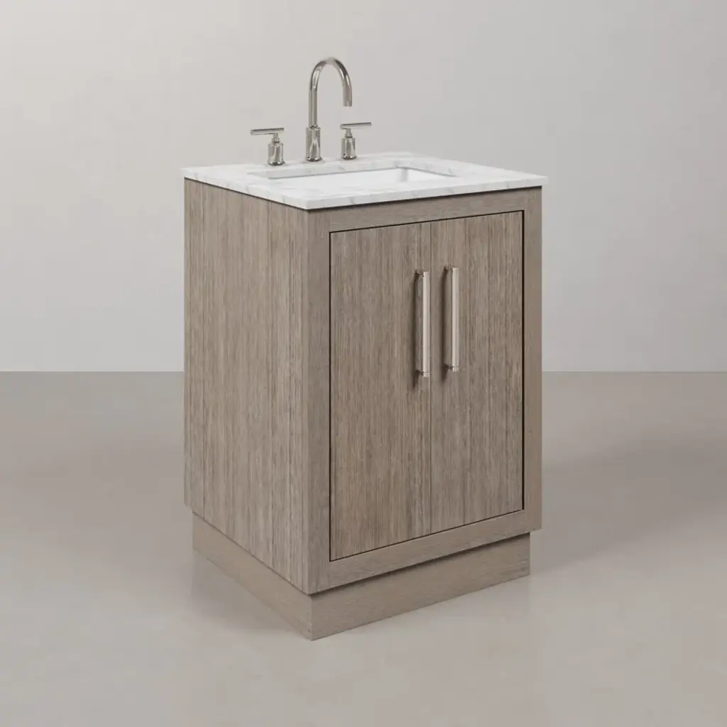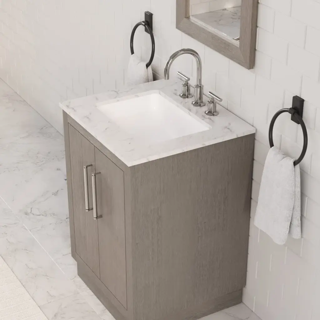 This freestanding single vanity features clean lines and neutral tones that give your bathroom or powder room a mix of modern and rustic styles. It has a solid wood base with a wire-brushed gray finish that adds a lived-in look to your space. A single cabinet with a set of double doors provides a spot to tuck away towels or cleaning supplies. The matte-white marble countertop measures 24" wide, and it comes with a ceramic under-mount sink and a sleek metal faucet. A mirror is also included to round out the design.