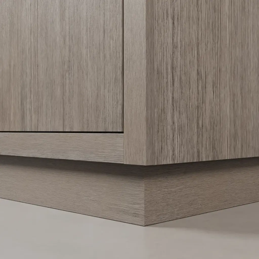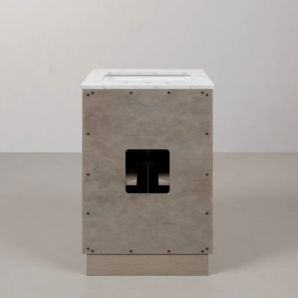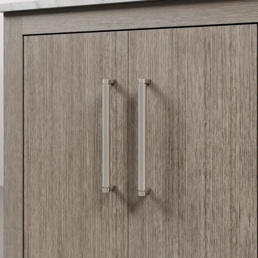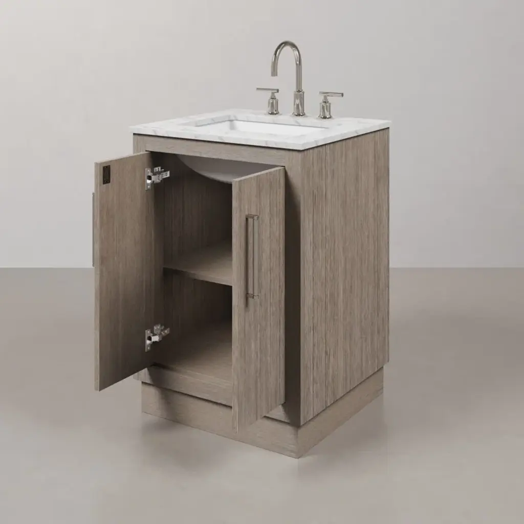This freestanding single vanity features clean lines and neutral tones that give your bathroom or powder room a mix of modern and rustic styles. It has a solid wood base with a wire-brushed gray finish that adds a lived-in look to your space. A single cabinet with a set of double doors provides a spot to tuck away towels or cleaning supplies. The matte-white marble countertop measures 24" wide, and it comes with a ceramic under-mount sink and a sleek metal faucet. A mirror is also included to round out the design.