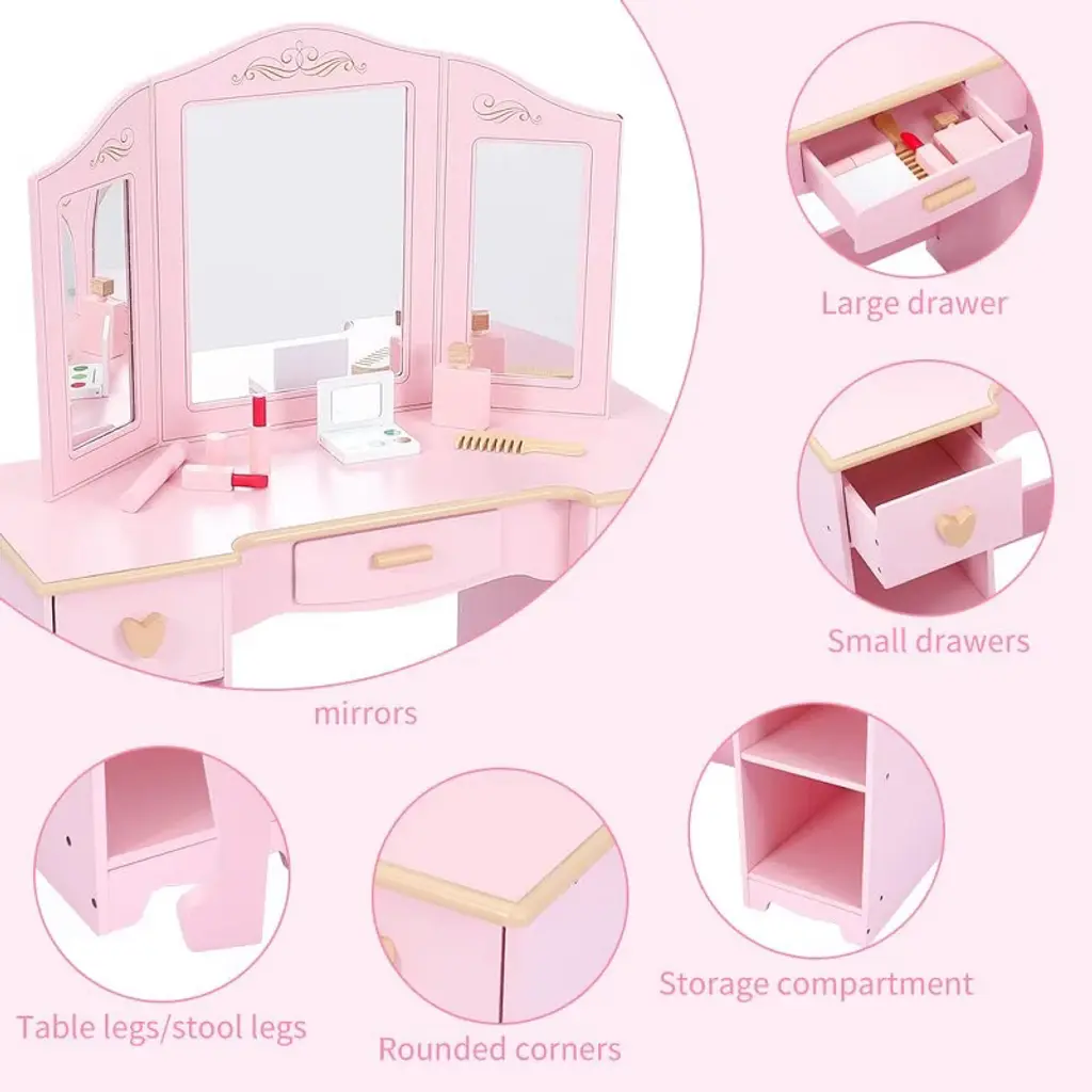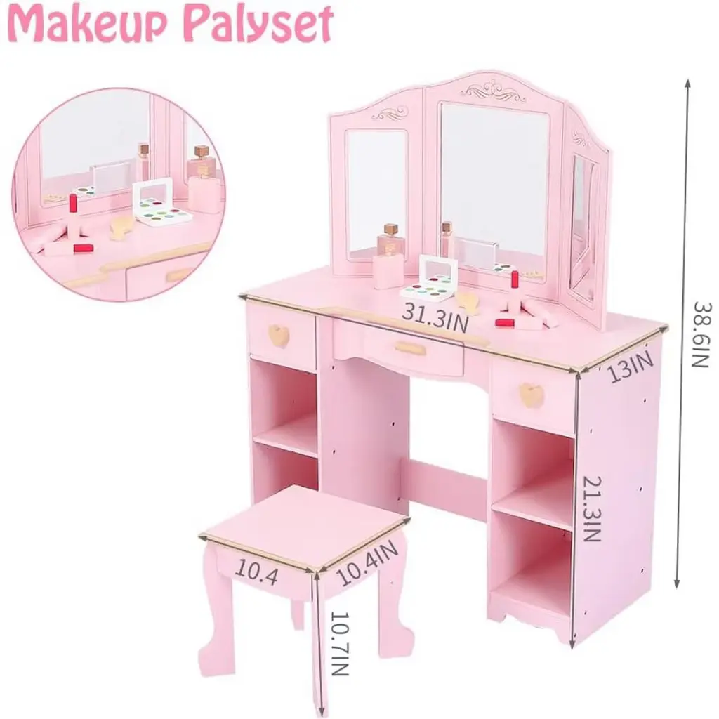 Kids Vanity Set, Pretend Play Girls Vanity Table And Chair Set With Tri-fold Mirror