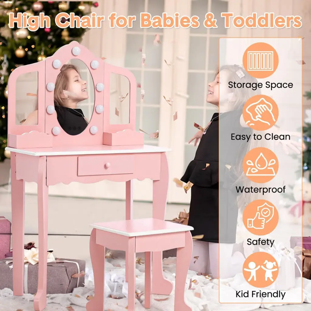 Kids Vanity Set with 3 Mirrors, Pretend Play Girls Vanity Table and Chair Set with Lighted Mirror, Stool, and Wood Makeup Playset