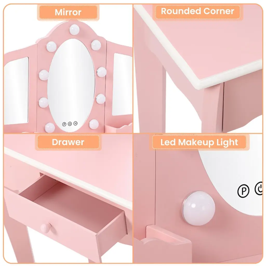 Kids Vanity Set With 3 Mirrors, Pretend Play Girls Vanity Table And Chair Set With Lighted Mirror, Stool, And Wood Makeup Playset