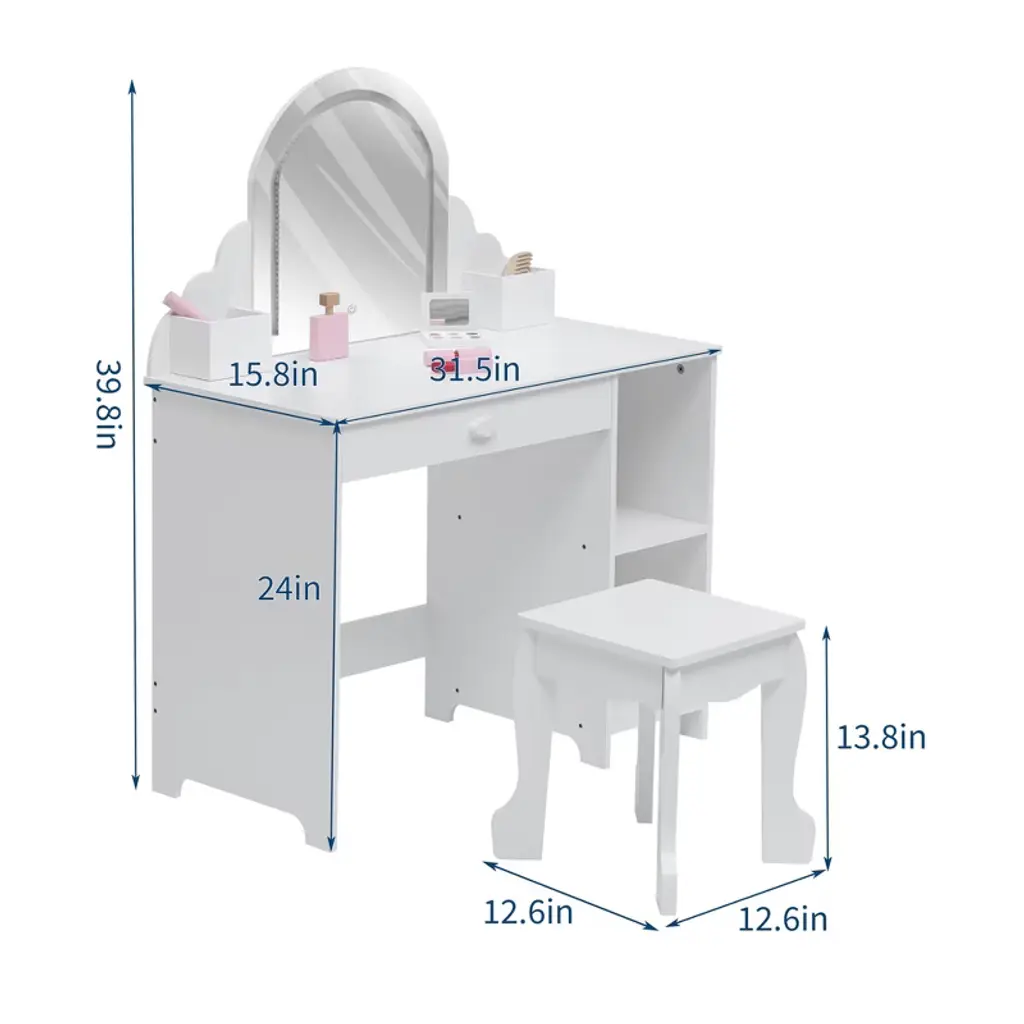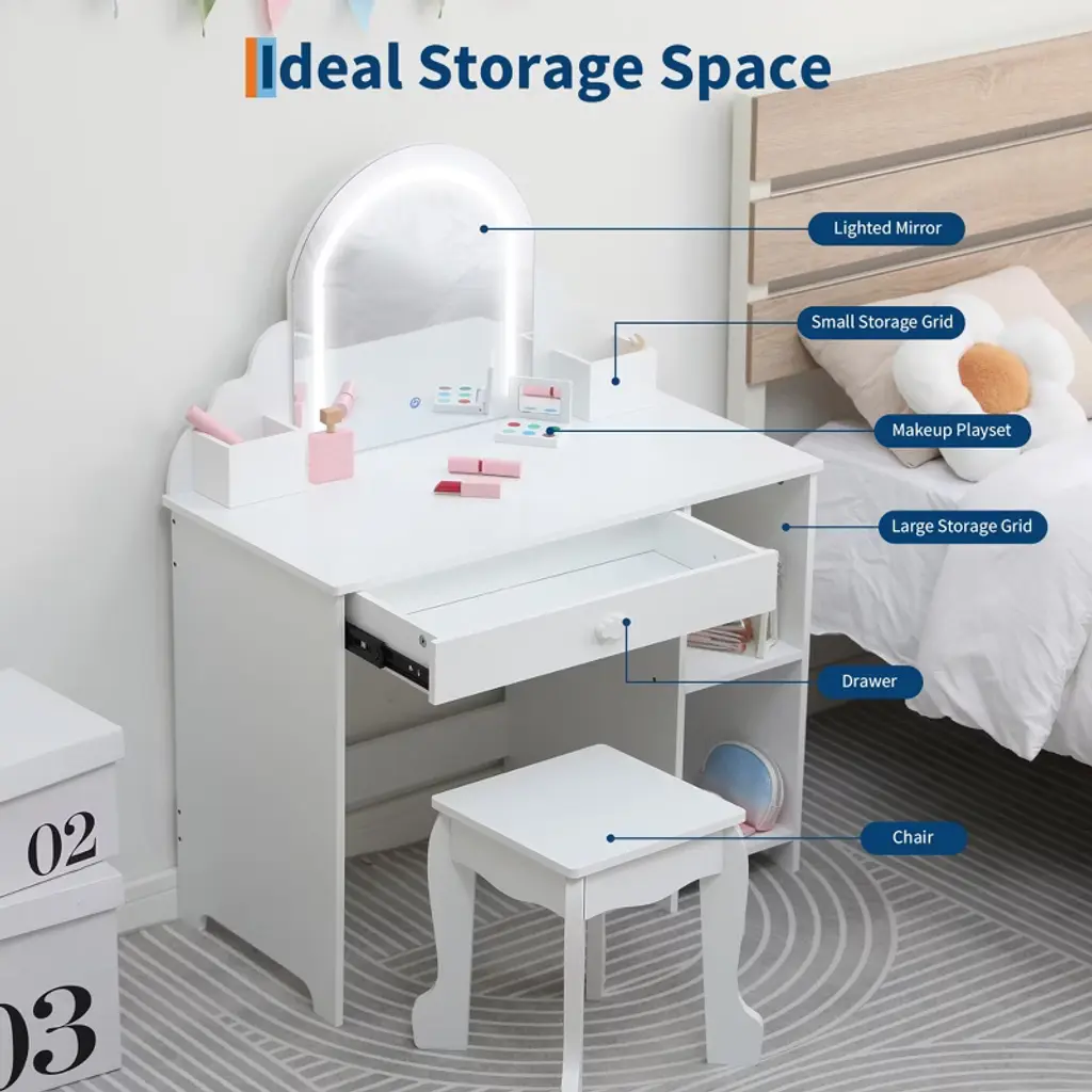 Kids vanity with lighted mirror, 2 in 1 Little girls vanity Table & stool, kids makeup with drawer & Open Shelves for 3-9 Yrs Girls