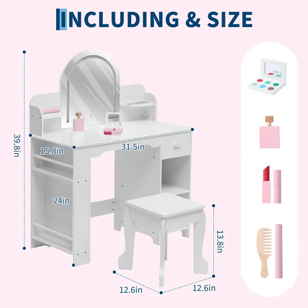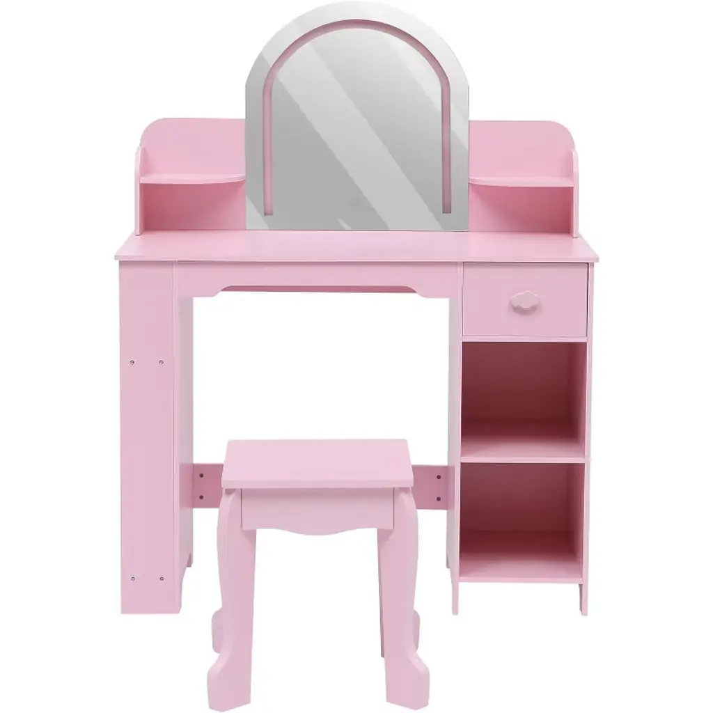Kids Vanity with Lighted Mirror & StoolHave you been searching for a gift that will truly delight your little princess? What if you could give her a magical vanity table designed just for kids, with a lighted mirror, adjustable lighting modes, and plenty of space for all her belongings? Can you imagine her excitement as she sits at her own dressing table, dressing up and organizing her favorite toys, books, and accessories with ease? Wouldn't you love a piece that brings both charm and safety, crafted from kid-friendly materials with smooth, rounded corners? Isn't it wonderful to create a playful corner in her bedroom, playroom, or even your living room? And what if assembly was simple and stress-free, so your child could start enjoying it right away? Discover how this adorable vanity set can spark her imagination and brighten every day.Highlights at a Glance:lighted mirror with 3 color modesspacious storage shelves and drawerrounded corners for child safetypremium engineered wood constructionperfect vanity set for girls' roomeasy assembly with clear instructionsSpecification:Material: Engineered WoodVanity Desk Size: 39.8"H x 31.5"L x 15.8"WStool Size: 13.8"H x 12.6"L x 12.6"WColor: White/ Pink/ PurplePacking List:1 x Girls Vanity1 x Accessory Kit1 x Instruction Manual