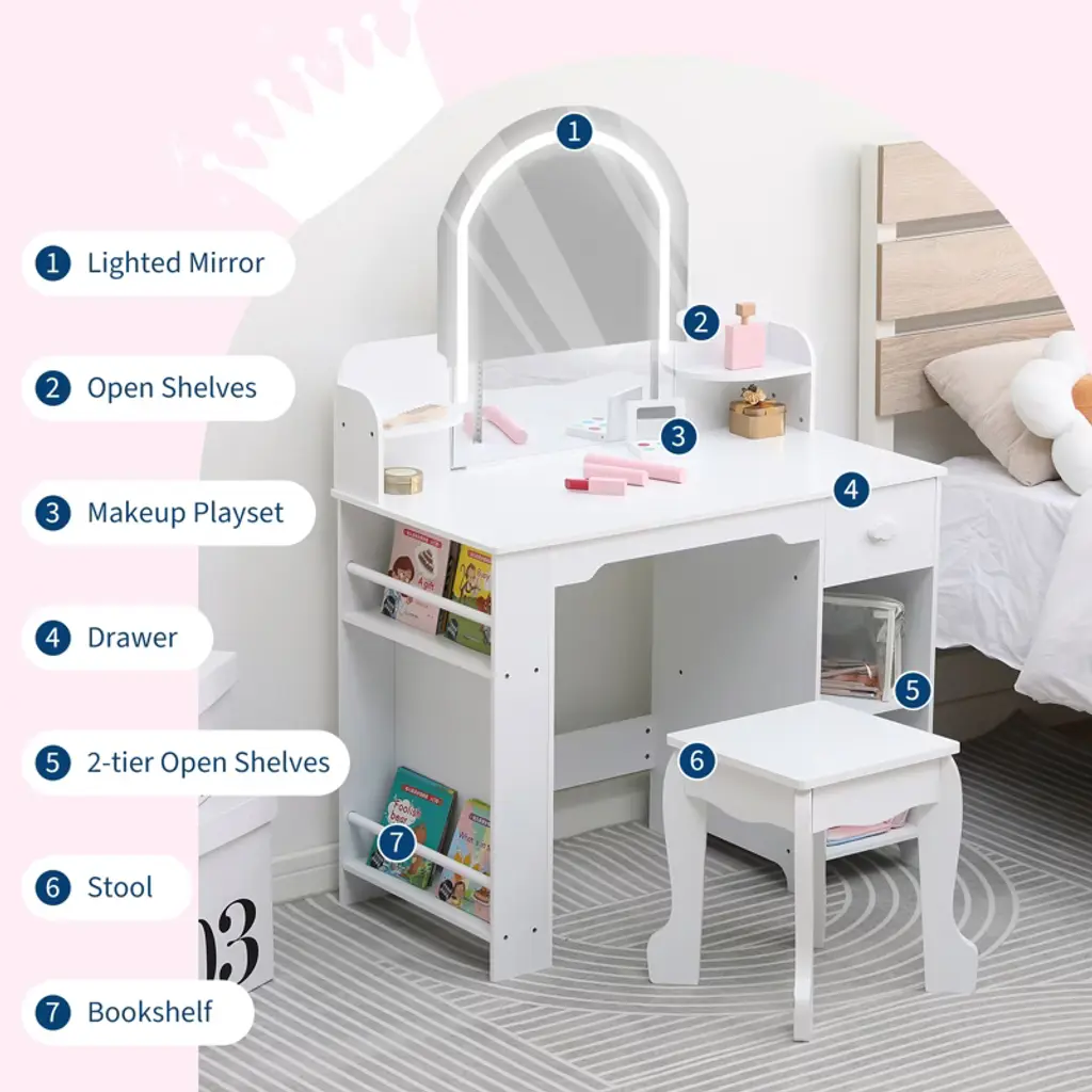 Kids Vanity With Lighted Mirror & Stool, Girls Makeup Vanity Desk With Bookshelf, Drawer & Open Shelves, Wooden Pretend Play Dressing Table