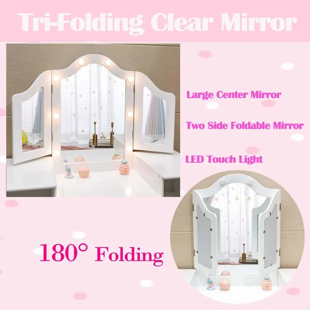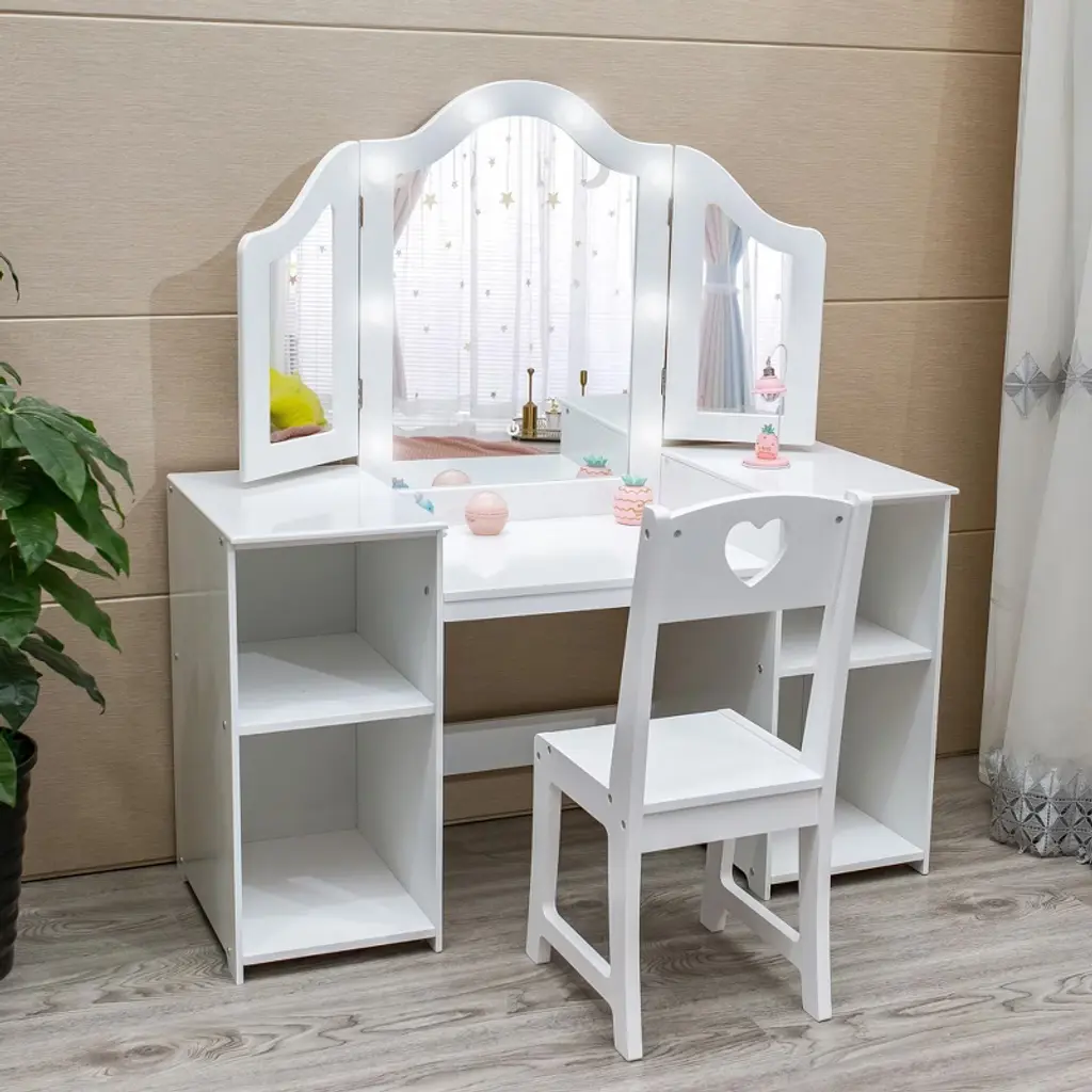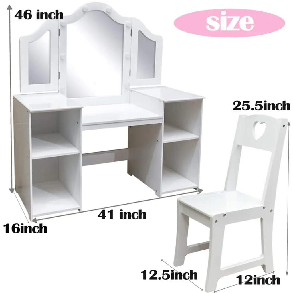 Kids Vanity With Lights, Princess Makeup Table And Chair Set With Detachable Tri-folding Mirror & Storage Cabinet