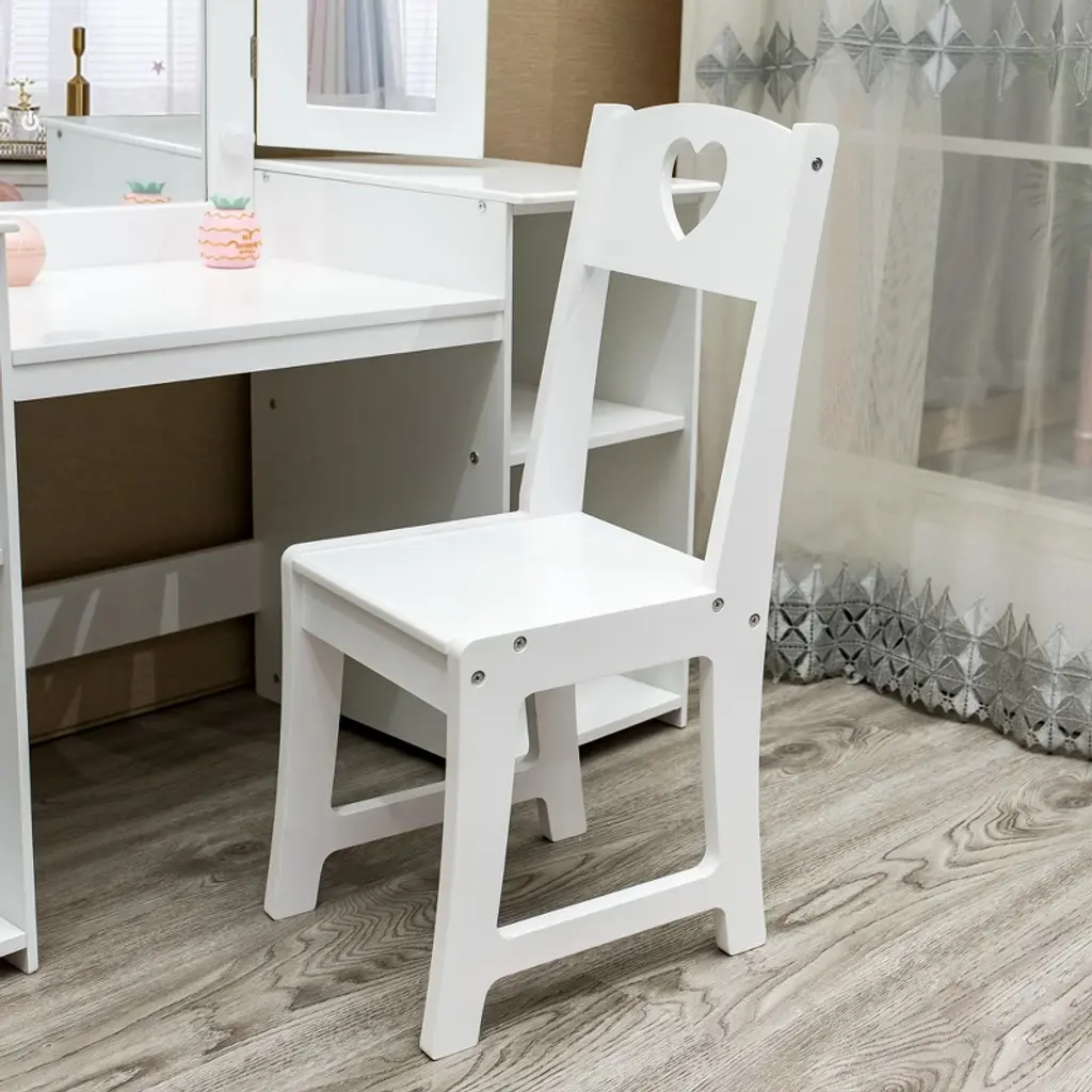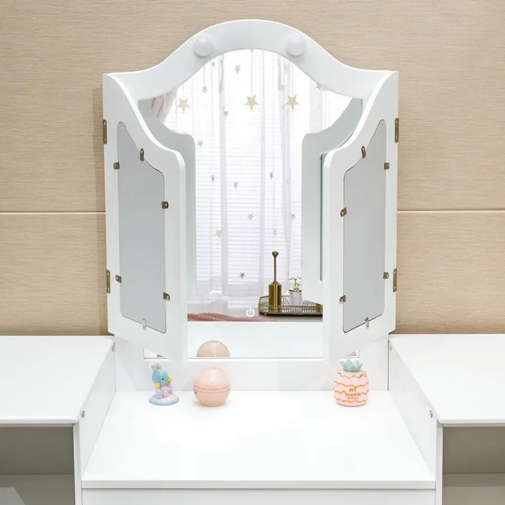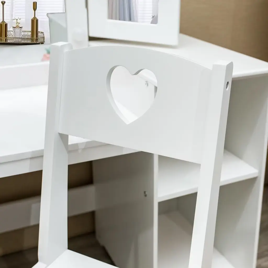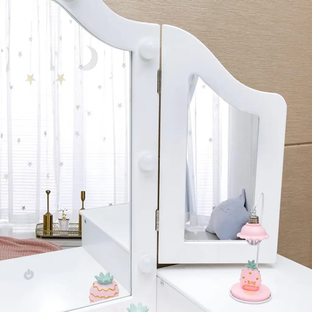 Kids Vanity With Lights, Princess Makeup Table And Chair Set With Detachable Tri-folding Mirror & Storage Cabinet