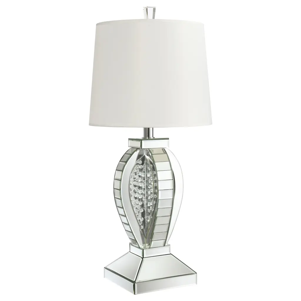 This contemporary table lamp offers an exquisitely detailed and elegant base, complete with mirror tile accents. Faux crystal accents tucked within the base sparkle outward, creating a luxe look. Contoured edges lined in polished mirror tile reflect the colors around it and project additional glow. Topped with a crisp white drum shade with a subtle tapered top, this stylish table lamp emits a serene, comforting glow next to a seating area. A single switch turns off the table lamp effortlessly, saving energy when not in use. Item Contents: Item Bullets: Materials: Features: Dimensions: Accessories pictured are NOT included.