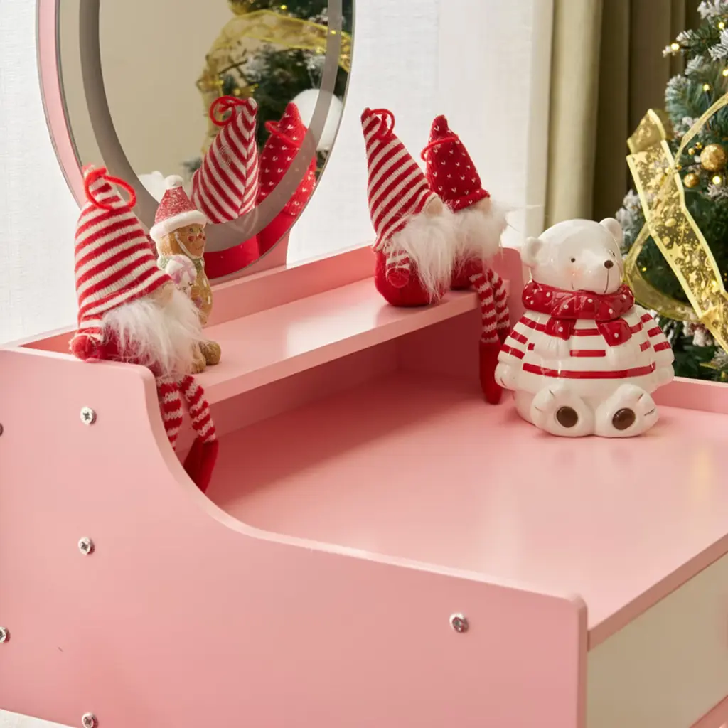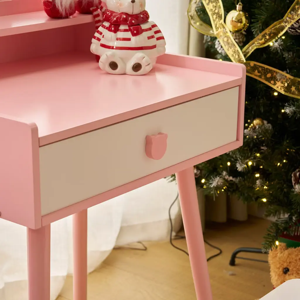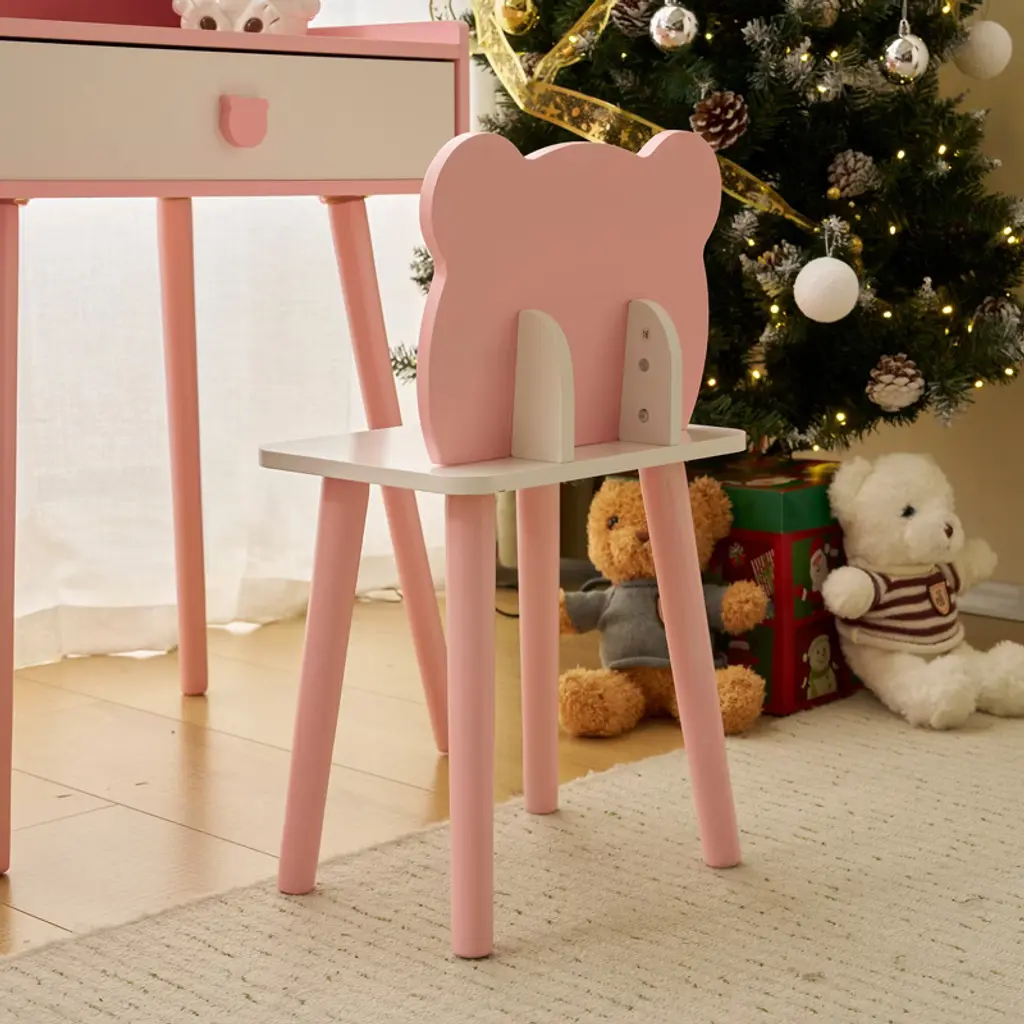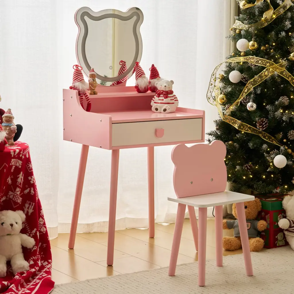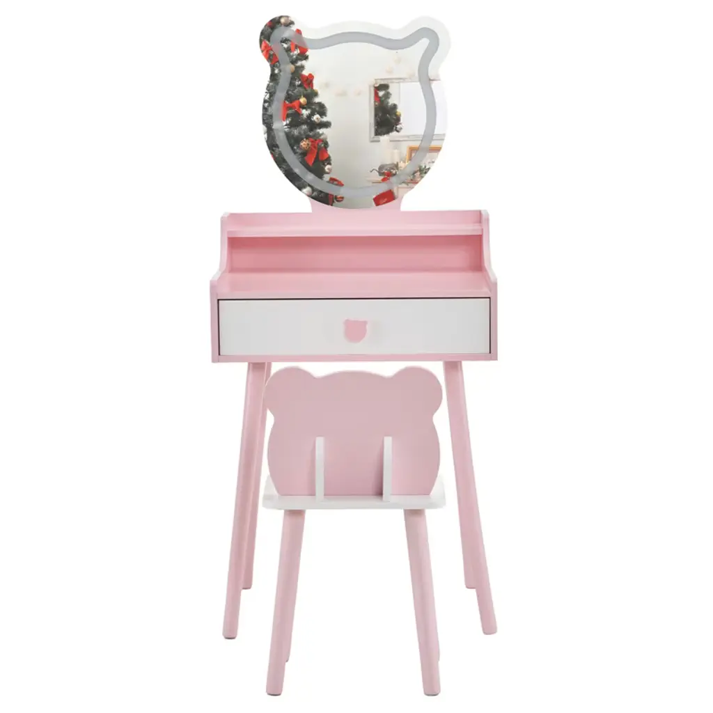 Bring your child's fairytale dreams to life with this enchanting Kids Vanity Table and Chair Set! This charming piece, designed especially for little princesses, features a cute bear-shaped mirror with touch-controlled LED lights that provide three lighting modes: Cool, Natural, and Warm Light. Not only perfect for imaginative play, the set easily converts into a functional desk, making it versatile for study or creative activities. Built with safety and durability in mind, this vanity set is crafted from premium MDF and sturdy legs to ensure lasting use. Rounded corners and smooth edges keep your little one safe, while the adorable design adds a regal touch to any room.