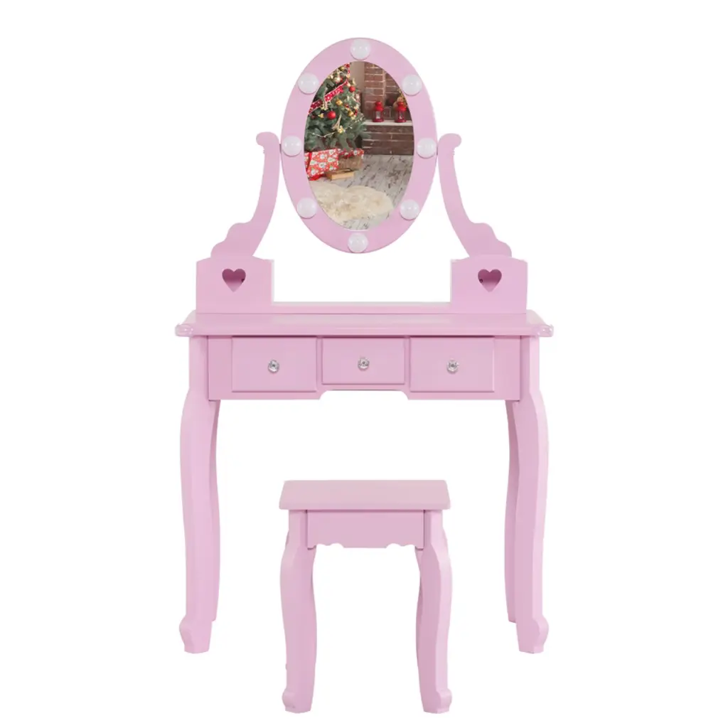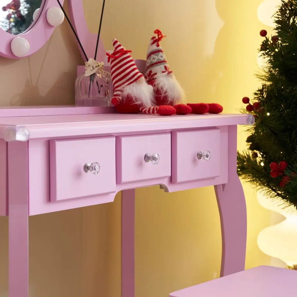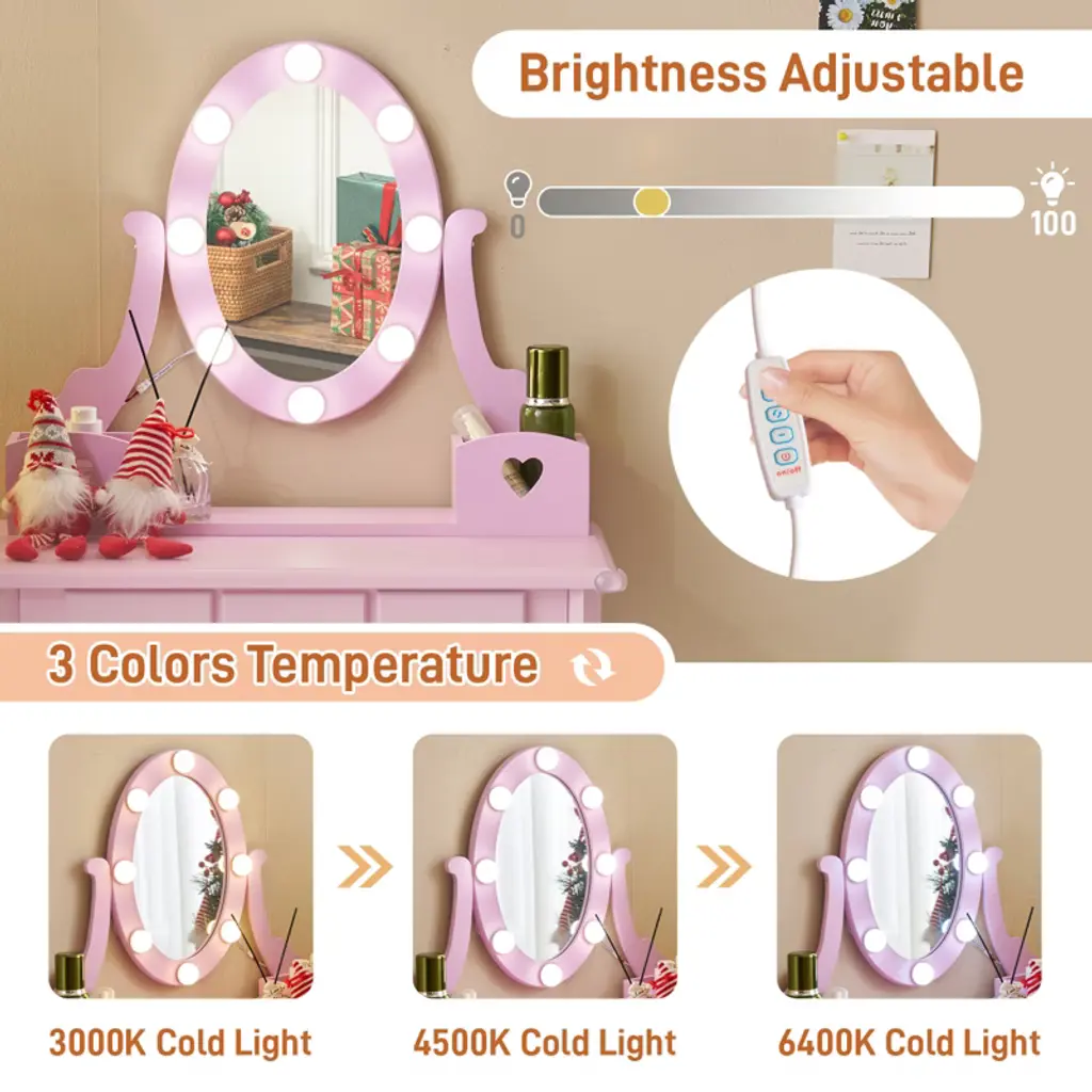 Bring joy and creativity to your child's playtime with the Kids Vanity Set. This enchanting vanity set, complete with a mirror, adjustable LED lights, and a comfy stool, transforms any room into a royal dressing area. Designed for children aged 3 and up, this macaroon color vanity not only enhances pretend play but also provides a functional space for reading, drawing, and crafting. Perfect for birthdays, Christmas, or just because, this vanity set is a dream come true for any aspiring princess.