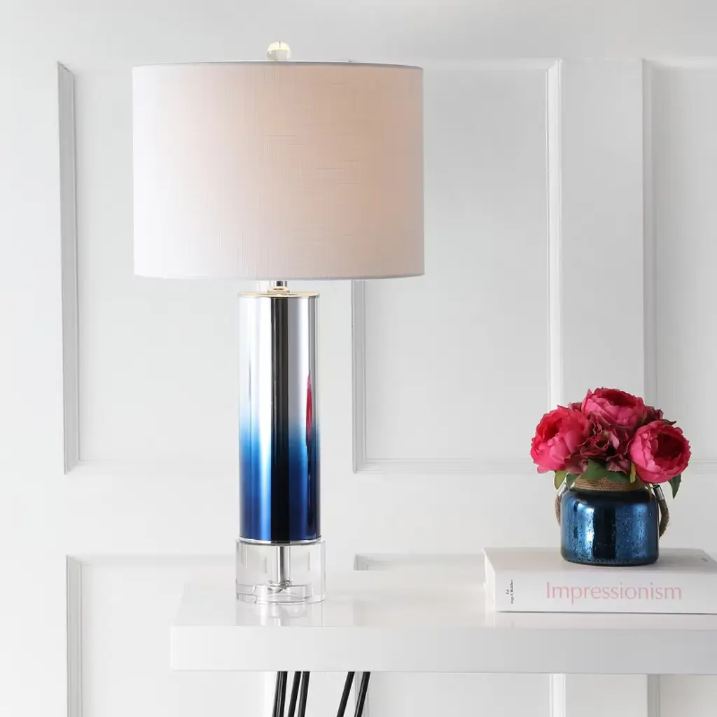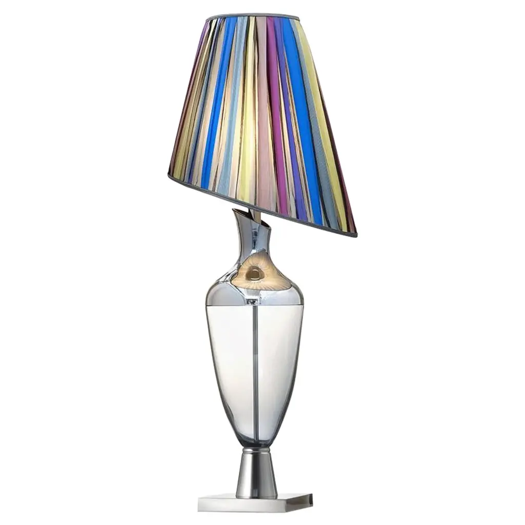 This elegant table lamp will add a colorful accent to any interior, thanks to the mirrored effect of its asymmetrical shade that reflect the light of its E27 x 60 W bulb in a dazzling manner. The inner structure of the piece and its square base are in metal with a silver finish, while the elongated, curved decorative elements around it are made of transparent Murano mouth-blown glass. Both shapes and sizes can be customized. Please ask the concierge for details.